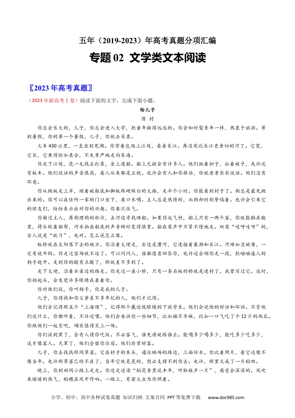 小学、初中、高中各种试卷真题知识归纳文案合同PPT等免费下载www.doc985.com五年(2019-2023)年高考真题分项汇编专题02文学类文本阅读〖2023年高考真题〗(2023年新高考Ⅰ卷)阅读下面的文字,完成下面小题。给儿子陈村你总会长大的,儿子,你总会进入大学,把童年撇得远远的。你会和时髦青年一样,热衷于旅游。等到暑假,你的第一个暑假,儿子,你就去买票。火车430公里,一直坐到芜湖。你背着包爬上江堤,看看长江。再没有比长江更亲切的河了。它宽,它长,它黄得恰如其分,不失尊严地走向东海。你走下江堤,花一毛钱去打票,坐上渡船。船上无疑会有许多人。他们挑着担子,扛着被子,或许还有板车。他们说话的声音很高,看人从来都是正视。也许会有人和你搭话,你就老老实实说话。他们没有坏意。你从跳板走上岸,顺着被鞋底和脚板踩硬踩白的大路,走半个小时。你能看到村子了。狗总是最先跳出来的。你可以在任何一家的门口坐下,要口水喝。主人总是热情的,而狗却时刻警惕着。也许会引来它的朋友们,纷纷表示出对你的兴趣。你要沉住气。你谢过主人,再别理狗的讹诈,去河边寻找滩船。如果你运气好,船上只有一两个客,你就能躺在舱里,将头枕着船帮,河水拍击船底的声音顿时变得很重。船在桨声中不紧不慢地走。双桨“吱呀吱呀”的,古人说是“欸乃”,也对。怎么说怎么像。板桥就在太阳落下去的地方。你沿着大埂走,右边是漕河,它连接着巢湖和长江。河滩如没被淹,一定有放牛的。你走过窑场就不远了。可以问问人,谁都愿意回答你,也许还会领你走一段,把咄咄逼人的狗子赶开。走到你的腿有点酸了,那就差不多到了。走下大埂,沿着水渠边的路走。你走过一座小桥,只有一条石板的桥就是进村了。我曾写过它。这时,你抬起头,会发觉许多眼睛在看着你。你对他们说,你叫杨子,你是我的儿子。儿子,你得找和你父亲差不多年纪的人,他们才记得。他们会记得那五个“上海佬”,记得那个戴近视眼镜的下放学生。他们会说他的好话和坏话。不管他们说什么,你都听着,不许还嘴。他们会告诉你一些细节,比如插不齐秧,比如一口气吃了个12斤的西瓜。你跟他们一起笑吧,确实值得笑上一场。你们谈到黑了,会有人请你吃饭。不必客气,谁先请就跟谁去。能喝多少喝多少,能吃多少吃多少,这才像客人。天黑了,他们会留你住宿。他们非常好客。儿子,你去找找那间草屋。它在村子的东头,通往晒场的路边,三面环水。你比着照片,看它还像不像当年。也许那草屋已经不在了,当年它就晃晃的,想必支撑不到你去。也许,那里又成了一片稻田。晚上,你到田间小路上走走。你边走边读“稻花香里说丰年,听取蛙声一片”,感受会深深的。风吹来暖暖的热气,稻穗在风中作响。一路上,有萤火虫为你照着。小学、初中、高中各种试卷真题知识归纳文案合同PPT等免费下载www.doc985.com假如你有胆量,就到村东头的大坟茔去。多半会碰上“鬼火”,也就是磷火。你别跑,你坐在坟堆上,体会一下死的庄重和沉默。地下的那些人也曾生活在这块土地上,劳动,繁殖。他们也曾埋葬过他们的祖先。①你会捉摸到一点历史感的,这比任何教科书都有效。住上几天,你就熟悉村子了。男人爱理干干净净的发式,两边的头发一刀推净,这样头便显得长了。顶上则是长长的头毛,能披到眼睛,时而这么一甩,甩得很有点味道。我喜欢见他们光着上身光着脚的样子。皮肤晒成了栗色,黑得发亮发光,连麦芒都刺不透它。他们不是生来这样的。和他们一起下河,你就知道,他们原先比你还白。现在,他们和你的祖先一样黑了。和你父亲当年一样黑。你要是下田,就和你一样黑。下田去吧,儿子。让太阳也把你烤透。你弯下腰,从清晨弯到天黑,你恨不得把腰扔了。你的肩膀不是生来只能背背书包的。你挑起担子,肩上的肌肉会在扁担下鼓起。也许会掉层皮,那不算什么。你去拔秧,插秧,锄草,脱粒。你会知道自己并非什么都行。你去握一握大锹,它啥时候都不会被取代。工具越原始就越扔不了,像锤子,像刀,总要的。你得认识麦子,稻子,玉米,高粱,红薯。它们也是扔不了的。你干累了,坐在门边,看着猪在四处漫游,看着鸡上房,鸭下河,鹅窜进秧田美餐一顿。你听...