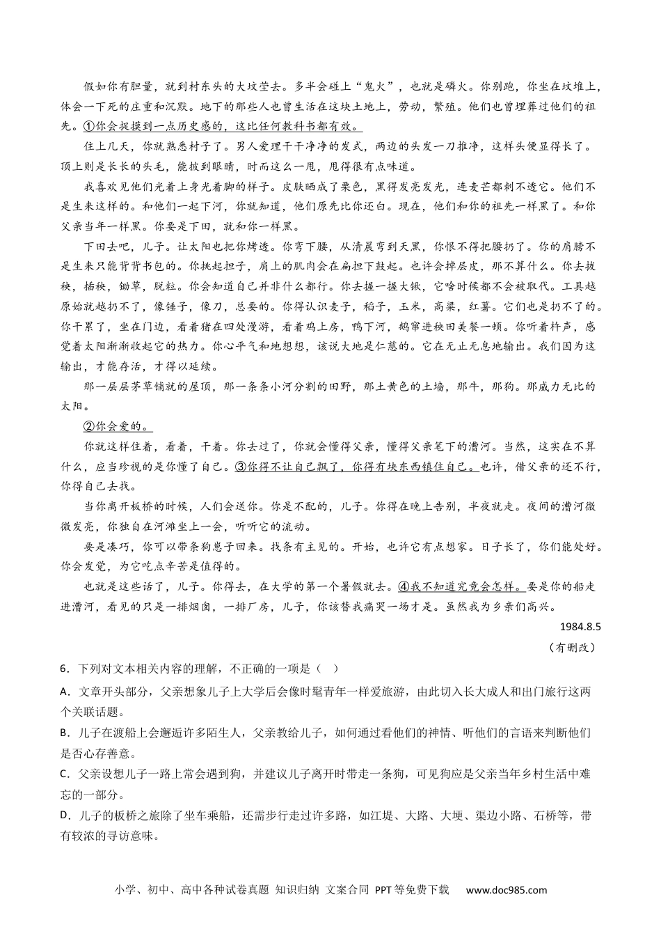 小学、初中、高中各种试卷真题知识归纳文案合同PPT等免费下载www.doc985.com五年(2019-2023)年高考真题分项汇编专题02文学类文本阅读〖2023年高考真题〗(2023年新高考Ⅰ卷)阅读下面的文字,完成下面小题。给儿子陈村你总会长大的,儿子,你总会进入大学,把童年撇得远远的。你会和时髦青年一样,热衷于旅游。等到暑假,你的第一个暑假,儿子,你就去买票。火车430公里,一直坐到芜湖。你背着包爬上江堤,看看长江。再没有比长江更亲切的河了。它宽,它长,它黄得恰如其分,不失尊严地走向东海。你走下江堤,花一毛钱去打票,坐上渡船。船上无疑会有许多人。他们挑着担子,扛着被子,或许还有板车。他们说话的声音很高,看人从来都是正视。也许会有人和你搭话,你就老老实实说话。他们没有坏意。你从跳板走上岸,顺着被鞋底和脚板踩硬踩白的大路,走半个小时。你能看到村子了。狗总是最先跳出来的。你可以在任何一家的门口坐下,要口水喝。主人总是热情的,而狗却时刻警惕着。也许会引来它的朋友们,纷纷表示出对你的兴趣。你要沉住气。你谢过主人,再别理狗的讹诈,去河边寻找滩船。如果你运气好,船上只有一两个客,你就能躺在舱里,将头枕着船帮,河水拍击船底的声音顿时变得很重。船在桨声中不紧不慢地走。双桨“吱呀吱呀”的,古人说是“欸乃”,也对。怎么说怎么像。板桥就在太阳落下去的地方。你沿着大埂走,右边是漕河,它连接着巢湖和长江。河滩如没被淹,一定有放牛的。你走过窑场就不远了。可以问问人,谁都愿意回答你,也许还会领你走一段,把咄咄逼人的狗子赶开。走到你的腿有点酸了,那就差不多到了。走下大埂,沿着水渠边的路走。你走过一座小桥,只有一条石板的桥就是进村了。我曾写过它。这时,你抬起头,会发觉许多眼睛在看着你。你对他们说,你叫杨子,你是我的儿子。儿子,你得找和你父亲差不多年纪的人,他们才记得。他们会记得那五个“上海佬”,记得那个戴近视眼镜的下放学生。他们会说他的好话和坏话。不管他们说什么,你都听着,不许还嘴。他们会告诉你一些细节,比如插不齐秧,比如一口气吃了个12斤的西瓜。你跟他们一起笑吧,确实值得笑上一场。你们谈到黑了,会有人请你吃饭。不必客气,谁先请就跟谁去。能喝多少喝多少,能吃多少吃多少,这才像客人。天黑了,他们会留你住宿。他们非常好客。儿子,你去找找那间草屋。它在村子的东头,通往晒场的路边,三面环水。你比着照片,看它还像不像当年。也许那草屋已经不在了,当年它就晃晃的,想必支撑不到你去。也许,那里又成了一片稻田。晚上,你到田间小路上走走。你边走边读“稻花香里说丰年,听取蛙声一片”,感受会深深的。风吹来暖暖的热气,稻穗在风中作响。一路上,有萤火虫为你照着。小学、初中、高中各种试卷真题知识归纳文案合同PPT等免费下载www.doc985.com假如你有胆量,就到村东头的大坟茔去。多半会碰上“鬼火”,也就是磷火。你别跑,你坐在坟堆上,体会一下死的庄重和沉默。地下的那些人也曾生活在这块土地上,劳动,繁殖。他们也曾埋葬过他们的祖先。①你会捉摸到一点历史感的,这比任何教科书都有效。住上几天,你就熟悉村子了。男人爱理干干净净的发式,两边的头发一刀推净,这样头便显得长了。顶上则是长长的头毛,能披到眼睛,时而这么一甩,甩得很有点味道。我喜欢见他们光着上身光着脚的样子。皮肤晒成了栗色,黑得发亮发光,连麦芒都刺不透它。他们不是生来这样的。和他们一起下河,你就知道,他们原先比你还白。现在,他们和你的祖先一样黑了。和你父亲当年一样黑。你要是下田,就和你一样黑。下田去吧,儿子。让太阳也把你烤透。你弯下腰,从清晨弯到天黑,你恨不得把腰扔了。你的肩膀不是生来只能背背书包的。你挑起担子,肩上的肌肉会在扁担下鼓起。也许会掉层皮,那不算什么。你去拔秧,插秧,锄草,脱粒。你会知道自己并非什么都行。你去握一握大锹,它啥时候都不会被取代。工具越原始就越扔不了,像锤子,像刀,总要的。你得认识麦子,稻子,玉米,高粱,红薯。它们也是扔不了的。你干累了,坐在门边,看着猪在四处漫游,看着鸡上房,鸭下河,鹅窜进秧田美餐一顿。你听...