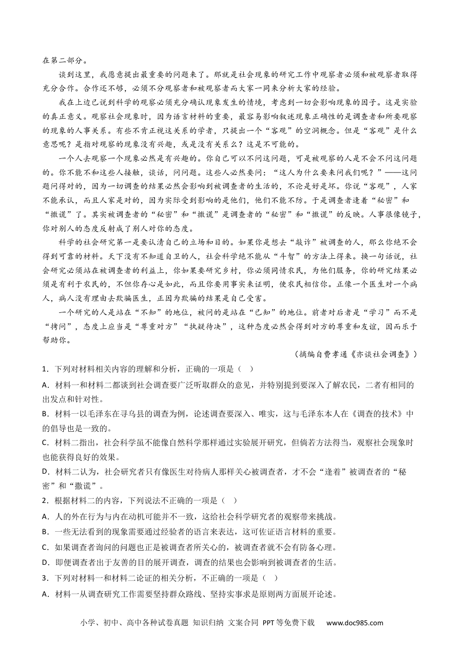 小学、初中、高中各种试卷真题知识归纳文案合同PPT等免费下载www.doc985.com五年(2019-2023)年高考真题分项汇编专题01信息类文本阅读〖2023年高考真题〗(2023年新高考Ⅱ卷)阅读下面的文字,完成下面小题。材料一:搞好调查研究,一定要从群众中来、到群众中去,广泛听取群众意见。人民群众的社会实践,是获得正确认识的源泉,也是检验和深化我们认识的根本所在。调查研究成果的质量如何,形成的意见正确与否,最终都要由人民群众的实践来检验。毛泽东同志1930年在寻乌县调查时,直接与各界群众开调查会,掌握了大量第一手材料,诸如该县各类物产的产量、价格,县城各业人员数量、比例,各商铺经营品种、收入,各地农民分了多少土地、收入怎样,各类人群的政治态度,等等,都弄得一清二楚。这种深入、唯实的作风值得我们学习。领导干部进行调查研究,要放下架子、扑下身子,深入田间地头和厂矿车间,同群众一起讨论问题,倾听他们的呼声,体察他们的情绪,感受他们的疾苦,总结他们的经验,吸取他们的智慧。既要听群众的顺耳话,也要听群众的逆耳言;既要让群众反映情况,也要请群众提出意见。尤其对群众最盼、最急、最忧、最怨的问题更要主动调研,抓住不放。这样才能真正听到实话、察到实情、获得真知、收到实效。调查研究必须坚持实事求是的原则,树立求真务实的作风,具有追求真理、修正错误的勇气。现在有的干部善于察言观色,准备了几个口袋,揣摩上面或领导的意图来提供材料。很显然,这样的调查是看不到实情、得不到真知、做不出正确结论的。调查研究一定要从客观实际出发,不能带着事先定的调子下去,而要坚持结论产生在调查研究之后,建立在科学论证的基础上。对调查了解到的真实情况和各种问题,要坚持有一是一、有二是二,既报喜又报忧,不唯书、不唯上、只唯实。(摘自习近平《谈谈调查研究》)材料二:社会科学并不拥有像自然科学一模一样的实验室,那是没有人能否认的。但是,如果说社会科学研究者并不能控制他所要观察的现象,那也并不完全正确。其实不过是控制的技术问题,而不是能不能控制的问题。在物理实验里用斜面滚球来实验引力,斜板这实验因子并不影响所要观察的引力现象,因为实验者在计算球动的速率中会考虑到这斜板的因子——换一句话,所谓实验并不是孤立现象,而是把所有发生作用的因子都加以充分考虑的意思。观察社会现象时,如果我们能确知观察情境中各种因子对于被观察现象所起的作用,我们同样可以达到自然科学的实验中所具备的条件。在技术上,观察社会现象比观察自然现象更为困难。社会现象并不限于人的动作,而且包括人的动机;动机又受着人所接受的那一套认为应当如是的规律支配,这套规律是社会所共有的,而且是在时间里累积下来的——这是人的生活适用于他所处的具体环境的方法,是在人和物的接触中,在动作里,给人的满足与否的结果里,选择和淘汰出来的,而且也永远在变动之中——在这里我们可以见到社会现象有着不能分的两部分:一部分我们可以在体外看得到的,另一部分,在体外是看不到的。这第二部分必须由经验者本人用语言表达出来,才能使旁观的人明白。观察社会现象的困难常发生小学、初中、高中各种试卷真题知识归纳文案合同PPT等免费下载www.doc985.com在第二部分。谈到这里,我愿意提出最重要的问题来了。那就是社会现象的研究工作中观察者必须和被观察者取得充分合作。合作还不够,必须不分观察者和被观察者而大家一同来分析大家的经验。我在上边已说到科学的观察必须充分确认现象发生的情境,考虑到一切会影响现象的因子。这是实验的真正意义。观察社会现象时,因为语言材料的重要,最容易影响叙述现象正确性的是调查者和所要观察的现象的人事关系。有些不肯正视这关系的学者,只提出一个“客观”的空洞概念。但是“客观”是什么意思呢?是指对观察的现象没有兴趣,或是没有关系么?这是不可能的。一个人去观察一个现象必然是有兴趣的。你自己可以不问这问题,可是被观察的人是不会不问这问题的。你不能不和这些人接触,谈话,问问题。这些人必然要问:“这人为什么要来问我们呢?”——这问题问得对的,因为一切调查的结...