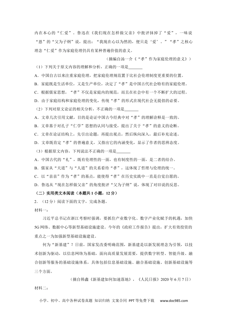 小学、初中、高中各种试卷真题知识归纳文案合同PPT等免费下载www.doc985.com2020年全国统一高考语文试卷(新课标Ⅰ)一、现代文阅读(36分)(一)论述类文本阅读(本题共1小题,9分)1.(9分)阅读下面的文字,完成各题。社会是由众多家庭组成的,家庭和谐关乎社会和谐。要在家庭中建立一种和谐的关系,就需要有家庭伦理。中国自古以来就有维护家庭关系的种种伦理规范,它们往往体现在各种“礼”之中。从《礼记》中可以看到各种礼制的记载,如婚丧嫁娶,这些都包含着各种家庭伦理规范,而要使这些规范成为一种社会遵守的伦理,就要使“礼”制度化。在中国古代,“孝”无疑是家庭伦理中最重要的观念。《孝经》中有孔子的一段话:“夫孝,天之经也,地之义也,民之行也。”这是说“孝”是“天道”常规,是“地道”通则,是人们遵之而行的规矩。为什么“孝”有这样大的意义?这与中国古代宗法制有关中国古代社会基本上是宗法性的农耕社会,家庭不仅是生活单位,而且是生产单位。要较好地维护家庭中长幼尊卑的秩序,使家族得以顺利延续,必须有一套维护当时社会稳定的家庭伦理规范。这种伦理规范又必须是一套自天子至庶人都遵守的伦理规范,这样社会才得以稳定。“孝”成为一种家庭伦理规范,并进而成为社会的伦理制度,必有其哲理上的根据。《郭店楚简•成之闻之》中说:“天登大常,以理人伦,制为君臣之义,作为父子之亲,分为夫妇之辨。”理顺君臣、父子、夫妇的关系是“天道”的要求。君子以“天道”常规处理君臣、父子、夫妇伦理关系,社会才能治理好。所以,“人道”与“天道”是息息相关的。“孝”作为一种家庭伦理的哲理根据就是孔子的“仁学”。以“亲亲”(爱自己的亲人)为基点,扩大到“仁民”,以及于“爱物”。基于孔子的“仁学”,把“孝”看成是“天之经”“地之义”“人之行”是可以理解的。一方面,它体现了孔子“爱人”(“泛爱众”)的精义;另一方面,在孔子儒家思想中,“孝”在社会生活实践中有一个不断扩大的过程。因此,“孝”不是凝固教条,而是基于“仁学”的“爱”不断释放的过程。只有在家庭实践和社会实践中,以“仁学”为基础的“孝”的意义才能真正显现出来。社会在发展,现代社会中的家庭伦理会变化。“孝”的内涵也会随之变化。例如“四世同堂”“养儿防老”,就因家庭作为生产单位的逐渐消失而失去意义,又如“二十四孝”中的某些形式已没有必要提倡,但作为“孝”之核心理念的“仁爱”仍有家庭伦理之意义在家庭不再是生产单位的情况下,保障家庭良好的生活状态,将主要由社会保障体系来承担,但“孝”的“仁爱”精神则不会改变。对长辈的爱敬,对子孙的培育,都是出于人之小学、初中、高中各种试卷真题知识归纳文案合同PPT等免费下载www.doc985.com内在本心的“仁爱”。鲁迅在《我们现在怎样做父亲》中批评抹掉了“爱”,一味说“恩”的“父为子纲”说,提出:“我现在心以为然的,便只是‘爱’。”“孝”之核心理念“仁爱”作为家庭伦理仍具有某种普遍价值的意义。(摘编自汤一介《“孝”作为家庭伦理的意义》)(1)下列关于原文内容的理解和分析,正确的一项是A.中国自古以来注重家庭伦理,把家庭伦理规范置于比社会伦理制度更重要的位置。B.家庭既是生活单位,又是生产单位,决定了“孝”是中国古代社会特有的家庭伦理。C.根据儒家思想,“孝”不仅是家庭内的规范,而且在社会中有一个不断扩大的过程。D.由于家庭结构和家庭伦理的变化,传统“孝”的形式在现代社会无提倡的必要。(2)下列对原文论证的相关分析,不正确的一项是A.文章几次引用文献,目的是论证中国古今经典中对“孝”的理解诠释是一致的。B.文章基于对孔子“仁学”思想的认同与接受,提出了关于“孝”的意义的论断。C.文章在论证结构上,先引出论题,再提出观点,然后纵向深入,最后补充论述。D.文章既肯定“孝”的普遍意义,又指出它的内涵变化,显示了作者的思辨态度。(3)根据原文内容,下列说法不正确的一项是A.中国古代的“礼”,既有伦理性的一面,也有制度性的一面,是二者的结合。B.儒家从“天道”与“人道”的关系看待“孝”,这体现了哲理与伦理的统...
