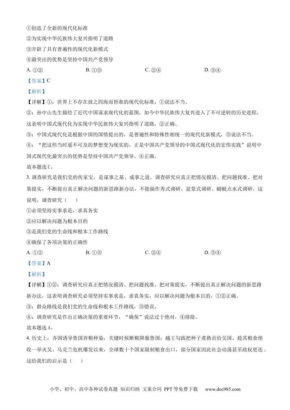 小学、初中、高中各种试卷真题知识归纳文案合同PPT等免费下载www.doc985.com2023年海南省普通高中学业水平选择性考试思想政治注意事项:1.答卷前,考生务必将自己的姓名、准考证号填写在答题卡上。2.回答选择题时,选出每小题答案后,用铅笔把答题卡上对应题目的答案标号涂黑。如需改动,用橡皮擦干净后,再选涂其他答案标号。回答非选择题时,将答案写在答题卡上,写在本试卷上无效。3.考试结束后,将本试卷和答题卡一并交回。一、选择题:本题共22小题,每小题2分,共44分。在每小题给出的四个选项中,只有一项是最符合题目要求的。1.1848年2月,《共产党宣言》问世,这是人类思想史上的一个伟大事件,它科学论证了资本主义的必然灭亡和社会主义的必然胜利,号召全世界无产者联合起来,建立共产主义新社会。由此可见,《共产党宣言》()①是科学社会主义产生的客观前提②科学洞见了人类社会发展的客观规律③阐述了建立无产阶级政党的必要性④实现了社会主义从理论到实践的伟大飞跃A.①③B.①④C.②③D.②④【答案】C【解析】【详解】①:《共产党宣言》的发表,标志着科学社会主义的诞生,①不符合题意。②:《共产党宣言》科学论证了资本主义的必然灭亡和社会主义的必然胜利,科学洞见了人类社会发展的客观规律,②符合题意。③:《共产党宣言》号召全世界无产者联合起来,建立共产主义新社会,阐述了建立无产阶级政党的必要性,③符合题意。④:十月革命胜利建立了世界上第一个社会主义国家,实现了社会主义从理想到现实、从理论到实践的伟大飞跃,开辟了人类探索社会主义道路新纪元,④不符合题意。故本题选C。2.100多年前,孙中山先生描绘了近代中国谋求现代化的蓝图:修建160万公里公路、16万公里铁路、3个世界级大海港……把这些当时遥不可及的梦想变为现实的,正是中国共产党领导的中国式现代化的宏伟实践。今天,中国已经全面建成小康社会,国际影响力、号召力显著提升,中华民族伟大复兴进入了不可逆转的历史进程。这表明,中国式现代化()小学、初中、高中各种试卷真题知识归纳文案合同PPT等免费下载www.doc985.com①创造了全新的现代化标准②为实现中华民族伟大复兴指明了道路③开辟了具有普遍性的现代化新模式④最突出的优势是坚持中国共产党领导A.①②B.①③C.②④D.③④【答案】C【解析】【详解】①:世界上不存在放之四海而皆准的现代化标准,①说法不当。②:孙中山先生描绘了近代中国谋求现代化的蓝图,如今中华民族伟大复兴进入了不可逆转的历史进程,这表明中国式现代化为实现中华民族伟大复兴指明了道路,②正确。③:中国式现代化是根据中国的国情提出的,是普遍性和特殊性相统一的现代化新模式,③说法不当。④:“把这些当时遥不可及的梦想变为现实的,正是中国共产党领导的中国式现代化的宏伟实践”说明中国式现代化最突出的优势是坚持中国共产党领导,④正确。故本题选C。3.调查研究是我们党的传家宝,是谋事之基、成事之道。调查研究应真正把情况摸清、把问题找准、把对策提实,不断提出真正解决问题的新思路新办法,不能搞作秀式调研、盆景式调研、蜻蜓点水式调研。这说明,调查研究()①必须坚持实事求是,求真务实②应以解决问题为根本目的③是我们党的生命线和根本工作路线④确保了各项决策的正确性A.①②B.①③C.②④D.③④【答案】A【解析】【详解】①②:调查研究应真正把情况摸清、把问题找准、把对策提实,不断提出真正解决问题的新思路新办法,这表明调查研究必须坚持实事求是,求真务实,应以解决问题为根本目的,①②正确。③:群众路线是我们党的生命线和根本工作路线,③错误。④:调查研究是作出正确决策的重要环节,“确保”说法过于绝对,④排除。故本题选A。4.历史上,齐国诱导鲁国弃粮种染,关键时候断粮降服鲁国;越王勾践把种子煮熟贡给吴国,趁其粮食绝收一举灭吴。乌克兰危机爆发以来,全球数十个国家限制粮食出口,部分国家因此社会动荡甚至政权更迭。这给我们的启示是()小学、初中、高中各种试卷真题知识归纳文案合同PPT等免费下载www.doc985.com①农业强国是社会主义现代化强国的根基②农业现代化生产水平决定了国...