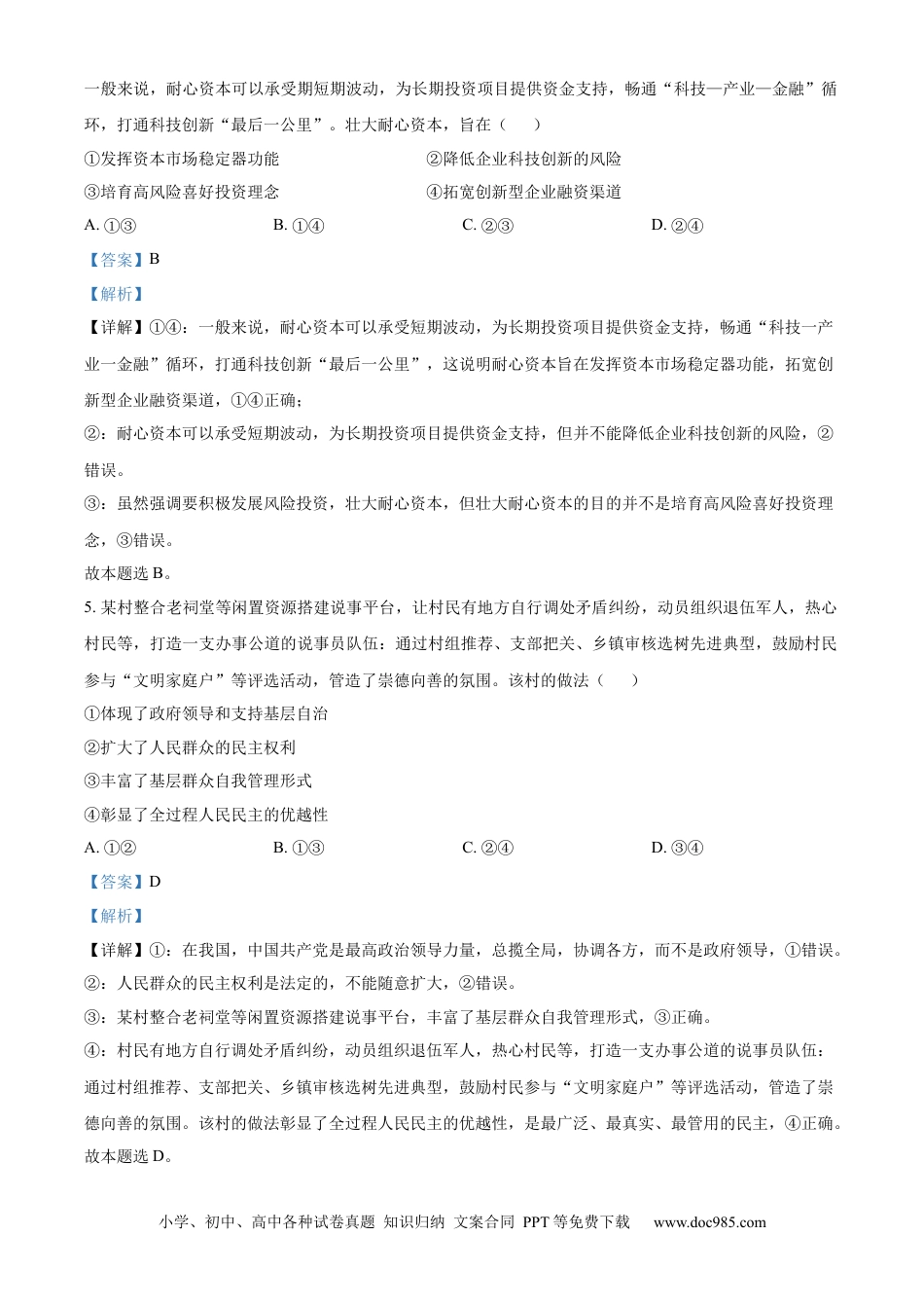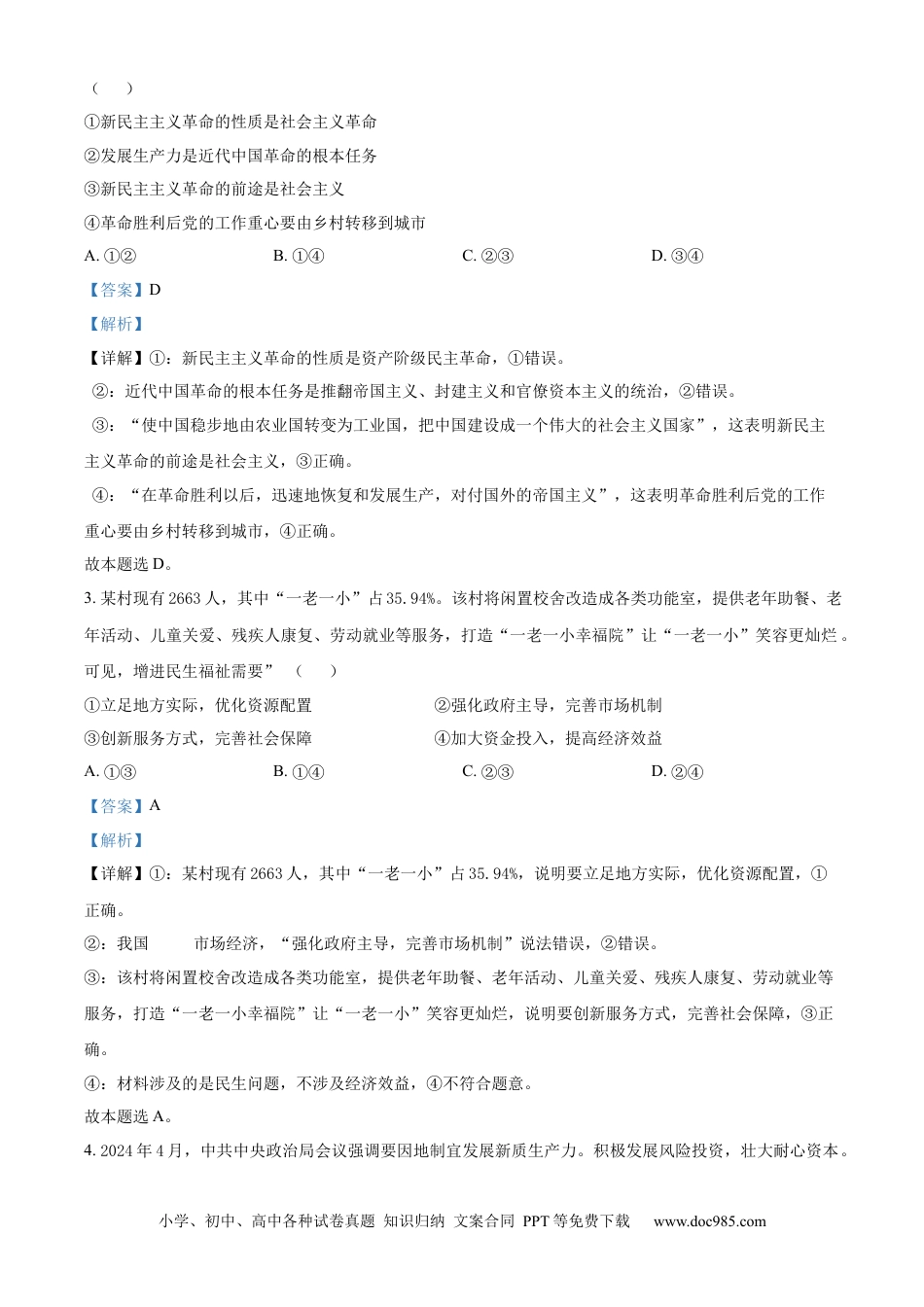 小学、初中、高中各种试卷真题知识归纳文案合同PPT等免费下载www.doc985.com2024年江西省普通高中学业水平选择性考试思想政治本卷共6页,共100分,考试时长75分钟。考生注意:1.答题前,考生务必将自己的准考证号、姓名填写在答题卡上。考生要认真核对答题卡上粘贴的条形码的“准考证号、姓名、考试科目”与考生本人准考证号、姓名是否一致。2.回答选择题时,选出每小题答案后,用2B铅笔把答题卡上对应题目的答案标号涂黑。如需改动,用橡皮擦干净后,再选涂其它答案标号。回答非选择题时,用黑色墨水签字笔将答案写在答题卡上,写在本试卷上无效。3.考试结束,监考员将试卷、答题卡一并收回。一、选择题:本题共16小题,每小题3分,共48分。在每小题给出的四个选项中,只有一项符合题目要求。1.习近平总书记指出,中国式现代化既切合中国实际,体现了社会主义建设规律,也体现了人类社会发展规律。我国要坚定不移推进中国式现代化,以中国式现代化全面推进中华民族伟大复兴,不断为人类作出新的更大贡献。这表明,中国式现代化()①体现了我国坚持独立自主走自己的路②创造了具有普遍适用性的现代化经验③符会中国人民和世界各国人民的利益④是推动人类文明发展进步的必由之路A.①③B.①④C.②③D.②④【答案】A【解析】【详解】①:中国式现代化切合中国实际,我国要坚定不移推进中国式现代化,体现了我国坚持独立自主走自己的路,①正确。②:中国式现代化可以为其他国家的现代化发展道路提供借鉴,但并不是具有普遍适用性的现代化经验,因为各国国情不同,②错误。③:以中国式现代化全面推进中华民族伟大复兴,不断为人类作出新的更大贡献,表明中国式现代化符会中国人民和世界各国人民的利益,③正确。④:中国式现代化是实现中华民族伟大复兴的必由之路,④错误。故本题选A。2.1949年3月,毛泽东在七届二中全会上提出,要“在革命胜利以后迅速地恢复和发展生产,对付国外的帝国主义,使中国稳步地由农国转变为工业国,把中国建设成一个伟大的社会主义国家。”这表明小学、初中、高中各种试卷真题知识归纳文案合同PPT等免费下载www.doc985.com()①新民主主义革命的性质是社会主义革命②发展生产力是近代中国革命的根本任务③新民主主义革命的前途是社会主义④革命胜利后党的工作重心要由乡村转移到城市A.①②B.①④C.②③D.③④【答案】D【解析】【详解】①:新民主主义革命的性质是资产阶级民主革命,①错误。②:近代中国革命的根本任务是推翻帝国主义、封建主义和官僚资本主义的统治,②错误。③:“使中国稳步地由农业国转变为工业国,把中国建设成一个伟大的社会主义国家”,这表明新民主主义革命的前途是社会主义,③正确。④:“在革命胜利以后,迅速地恢复和发展生产,对付国外的帝国主义”,这表明革命胜利后党的工作重心要由乡村转移到城市,④正确。故本题选D。3.某村现有2663人,其中“一老一小”占35.94%。该村将闲置校舍改造成各类功能室,提供老年助餐、老年活动、儿童关爱、残疾人康复、劳动就业等服务,打造“一老一小幸福院”让“一老一小”笑容更灿烂。可见,增进民生福祉需要”()①立足地方实际,优化资源配置②强化政府主导,完善市场机制③创新服务方式,完善社会保障④加大资金投入,提高经济效益A.①③B.①④C.②③D.②④【答案】A【解析】【详解】①:某村现有2663人,其中“一老一小”占35.94%,说明要立足地方实际,优化资源配置,①正确。②:我国是市场经济,“强化政府主导,完善市场机制”说法错误,②错误。③:该村将闲置校舍改造成各类功能室,提供老年助餐、老年活动、儿童关爱、残疾人康复、劳动就业等服务,打造“一老一小幸福院”让“一老一小”笑容更灿烂,说明要创新服务方式,完善社会保障,③正确。④:材料涉及的是民生问题,不涉及经济效益,④不符合题意。故本题选A。4.2024年4月,中共中央政治局会议强调要因地制宜发展新质生产力。积极发展风险投资,壮大耐心资本。小学、初中、高中各种试卷真题知识归纳文案合同PPT等免费下载www.doc985.com一般来说,耐心资本可以承受期短期波动,为长期投资项目提供资金支持,畅...