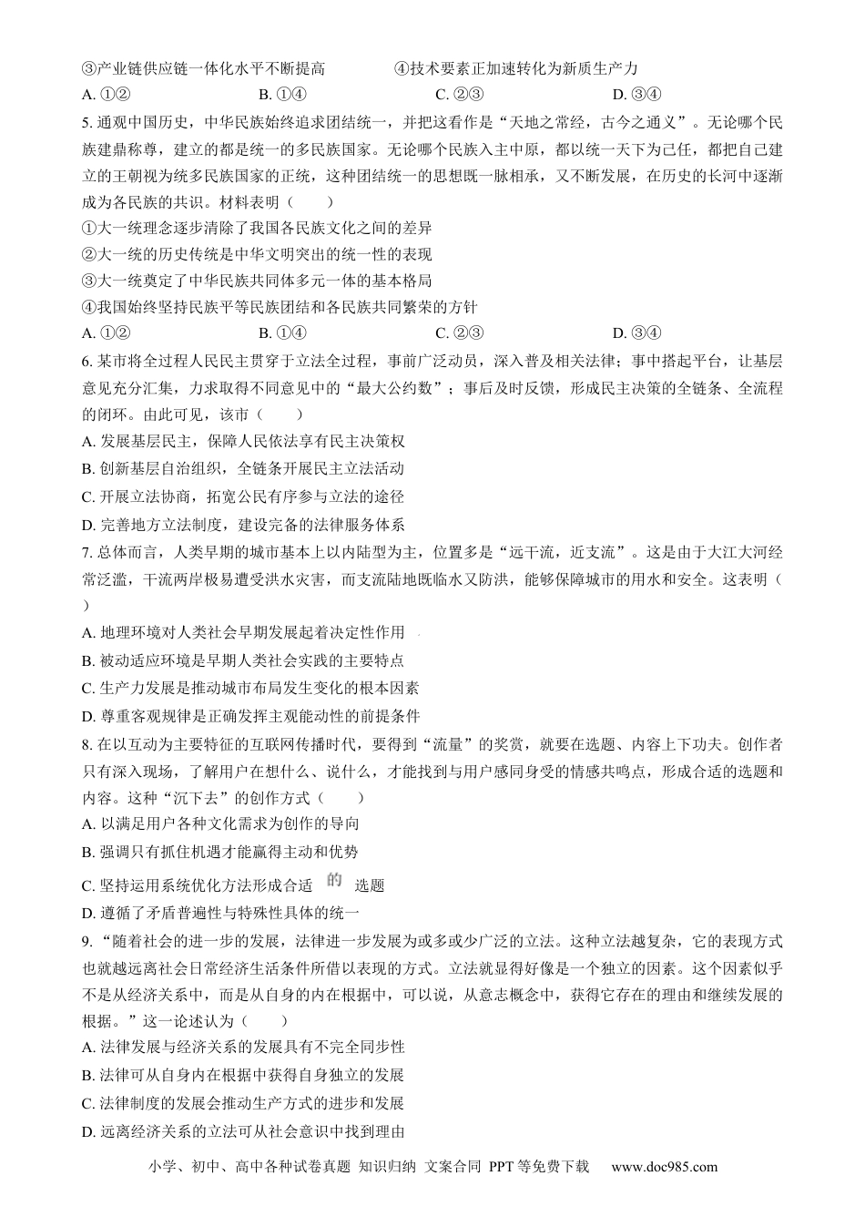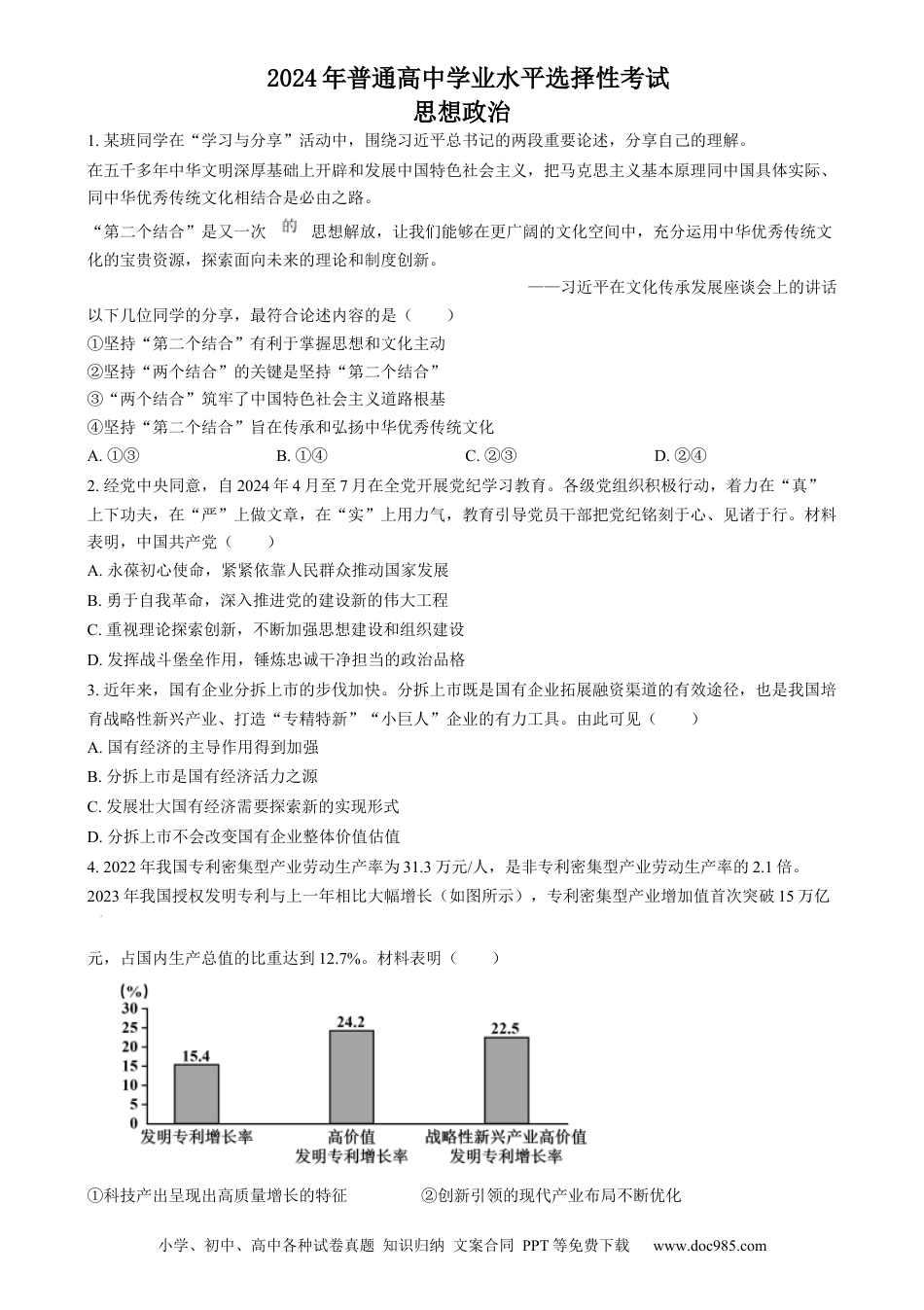 小学、初中、高中各种试卷真题知识归纳文案合同PPT等免费下载www.doc985.com2024年普通高中学业水平选择性考试思想政治1.某班同学在“学习与分享”活动中,围绕习近平总书记的两段重要论述,分享自己的理解。在五千多年中华文明深厚基础上开辟和发展中国特色社会主义,把马克思主义基本原理同中国具体实际、同中华优秀传统文化相结合是必由之路。“第二个结合”是又一次思想解放,让我们能够在更广阔的文化空间中,充分运用中华优秀传统文化的宝贵资源,探索面向未来的理论和制度创新。——习近平在文化传承发展座谈会上的讲话以下几位同学的分享,最符合论述内容的是()①坚持“第二个结合”有利于掌握思想和文化主动②坚持“两个结合”的关键是坚持“第二个结合”③“两个结合”筑牢了中国特色社会主义道路根基④坚持“第二个结合”旨在传承和弘扬中华优秀传统文化A.①③B.①④C.②③D.②④2.经党中央同意,自2024年4月至7月在全党开展党纪学习教育。各级党组织积极行动,着力在“真”上下功夫,在“严”上做文章,在“实”上用力气,教育引导党员干部把党纪铭刻于心、见诸于行。材料表明,中国共产党()A.永葆初心使命,紧紧依靠人民群众推动国家发展B.勇于自我革命,深入推进党的建设新的伟大工程C.重视理论探索创新,不断加强思想建设和组织建设D.发挥战斗堡垒作用,锤炼忠诚干净担当的政治品格3.近年来,国有企业分拆上市的步伐加快。分拆上市既是国有企业拓展融资渠道的有效途径,也是我国培育战略性新兴产业、打造“专精特新”“小巨人”企业的有力工具。由此可见()A.国有经济的主导作用得到加强B.分拆上市是国有经济活力之源C.发展壮大国有经济需要探索新的实现形式D.分拆上市不会改变国有企业整体价值估值4.2022年我国专利密集型产业劳动生产率为31.3万元/人,是非专利密集型产业劳动生产率的2.1倍。2023年我国授权发明专利与上一年相比大幅增长(如图所示),专利密集型产业增加值首次突破15万亿元,占国内生产总值的比重达到12.7%。材料表明()①科技产出呈现出高质量增长的特征②创新引领的现代产业布局不断优化小学、初中、高中各种试卷真题知识归纳文案合同PPT等免费下载www.doc985.com③产业链供应链一体化水平不断提高④技术要素正加速转化为新质生产力A.①②B.①④C.②③D.③④5.通观中国历史,中华民族始终追求团结统一,并把这看作是“天地之常经,古今之通义”。无论哪个民族建鼎称尊,建立的都是统一的多民族国家。无论哪个民族入主中原,都以统一天下为己任,都把自己建立的王朝视为统多民族国家的正统,这种团结统一的思想既一脉相承,又不断发展,在历史的长河中逐渐成为各民族的共识。材料表明()①大一统理念逐步清除了我国各民族文化之间的差异②大一统的历史传统是中华文明突出的统一性的表现③大一统奠定了中华民族共同体多元一体的基本格局④我国始终坚持民族平等民族团结和各民族共同繁荣的方针A.①②B.①④C.②③D.③④6.某市将全过程人民民主贯穿于立法全过程,事前广泛动员,深入普及相关法律;事中搭起平台,让基层意见充分汇集,力求取得不同意见中的“最大公约数”;事后及时反馈,形成民主决策的全链条、全流程的闭环。由此可见,该市()A.发展基层民主,保障人民依法享有民主决策权B.创新基层自治组织,全链条开展民主立法活动C.开展立法协商,拓宽公民有序参与立法的途径D.完善地方立法制度,建设完备的法律服务体系7.总体而言,人类早期的城市基本上以内陆型为主,位置多是“远干流,近支流”。这是由于大江大河经常泛滥,干流两岸极易遭受洪水灾害,而支流陆地既临水又防洪,能够保障城市的用水和安全。这表明()A.地理环境对人类社会早期发展起着决定性作用B.被动适应环境是早期人类社会实践的主要特点C.生产力发展是推动城市布局发生变化的根本因素D.尊重客观规律是正确发挥主观能动性的前提条件8.在以互动为主要特征的互联网传播时代,要得到“流量”的奖赏,就要在选题、内容上下功夫。创作者只有深入现场,了解用户在想什么、说什么,才能找到与用户感同身受的情感共鸣点,形成合适的选题和内容。这种“沉下去”的创作方...