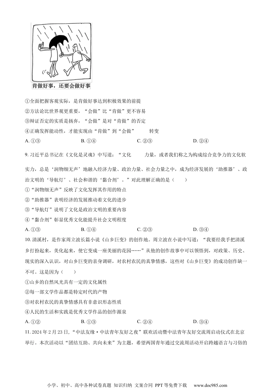 小学、初中、高中各种试卷真题知识归纳文案合同PPT等免费下载www.doc985.com2024年湖南省普通高中学业水平选择性考试思想政治一、选择题:本题共16小题,每小题3分,共48分。在每小题给出的四个选项中,只有一项符合题目要求。1.近代以来,为了民族独立和人民解放,数以万计的仁人志士失去了宝贵生命。新中国成立前夜,开国元勋们为人民英雄纪念碑奠基……1949年10月1日,30万军民在天安门广场隆重举行开国大典,历史掀开了新的一页,新中国的诞生()①推动了世界被压迫民族和被压迫人民争取解放的斗争②表明中国消灭了一切剥削制度,推进了社会主义建设③创造了向社会主义过渡的前提条件,改变了中国社会发展方向④极大地改变了世界政治力量的对比,开启了人类历史的新纪元A.①②B.①③C.②④D.③④2.党的十八届二中全会以来,我国许多领域实现历史性变革。从坚持精准扶贫精准脱贫基本方略、打赢脱贫攻坚战实现近1亿农村贫困人口脱贫,到建成世界上规模最大的教育体系、社会保障体系、医疗卫生体系;从深化司法体制改革有力维护公平正义,到颁布新中国首部民法典护航人民美好生活……沉甸甸的成绩单,诠释了()①破除制度障碍是我国取得一切成绩和进步的根本原因②伟大改革开放精神的弘扬是实现社会变革的直接动力③全面深化改革始终坚持以人民为中心的鲜明价值导向④中国共产党的领导和中国特色社会主义制度的优越性A.①②B.①③C.②④D.③④3.恩格斯在《自然辩证法》中指出,马克思的功绩在于,“第一个把已经被遗忘的辩证方法、它和黑格尔辩证法的联系以及差别重新提到人们面前,同时在《资本论》中把这个方法应用到一种经验科学即政治经济学的事实上去”。以下理解正确的是()①《资本论》第一次阐述了科学社会主义原理②唯物辩证法是马克思研究政治经济学的方法③黑格尔辩证法与马克思辩证法没有本质区别④马克思批判地吸收了黑格尔哲学的合理成分A.①③B.①④C.②③D.②④4.2024年4月12日,商务部等14部门印发的《推动消费品以旧换新行动方案》对外发布。方案提出加大小学、初中、高中各种试卷真题知识归纳文案合同PPT等免费下载www.doc985.com财政金融政策支持力度、完善废旧家电回收网络、优化家居市场环境等22条举措。新一轮消费品以旧换新,将进一步推动汽车换“能”、家电换“智”、家庭厨卫“焕新”,其意义在于()①满足居民改善需求,“换”出美好生活新品质②促进产品更新迭代,“换”出产业升级新动能③发挥财政主导作用,“换”出内需增长新空间④确立资源回收制度,“换”出循环经济新模式A.①②B.①④C.②③D.③④5.经党中央同意,自2024年4月至7月,在全党开展党纪学习教育。通过开展党纪学习教育,引导党员干部学纪、知纪、明纪、守纪,督促领导干部树立正确权力观,公正用权、依法用权、为民用权、廉洁用权。开展党纪学习教育是()①以纪律建设为统领,勇于自我革命的要求②推动全面从严治党向纵深发展的重要举措③激励中国共产党人前赴后继、英勇奋斗的根本动力④不断增强党员干部纪律意识、提高党性修养的过程A.①③B.①④C.②③D.②④6.法治是互联网治理的基本方式。网络法治与10亿多网民直接相连,与14亿多人民群众息息相关。面对网络传谣、网络暴力等现实问题,需要加大治理力度,对“按键伤人”坚持严惩立场,让互联网在法治轨道上健康运行。网络法治需要()①政府依法开展网络执法,营造清朗网络空间②司法机关强化网络立法,健全网络法律体系③加强法治宣传教育,凝聚依法治网强大力量④畅通群众投诉渠道,保障网民各项利益实现A.①③B.①④C.②③D.②④7.大美潇湘,山水如画,“潇湘八景”最早由宋初山水画大师所作,作为一个超越地域和历史范畴的美学意象,成为千百年来历代文人墨客创作的文化母题与图式,成就了中国山水画别开生面、自成—派的“潇湘山水”。亦如美学家宗白华所言:“艺术家以心灵映射万象,代山川而立言。”由此可知()①潇湘的自然山水是能被艺术家的心灵所反映的客观实在②艺术家以手中画笔为潇湘自然山水描绘图景、设定法则③“潇湘八景“作为美学意象是有相对独立性的社会意识④自成一派的“潇湘山水”寓于中国山水...
