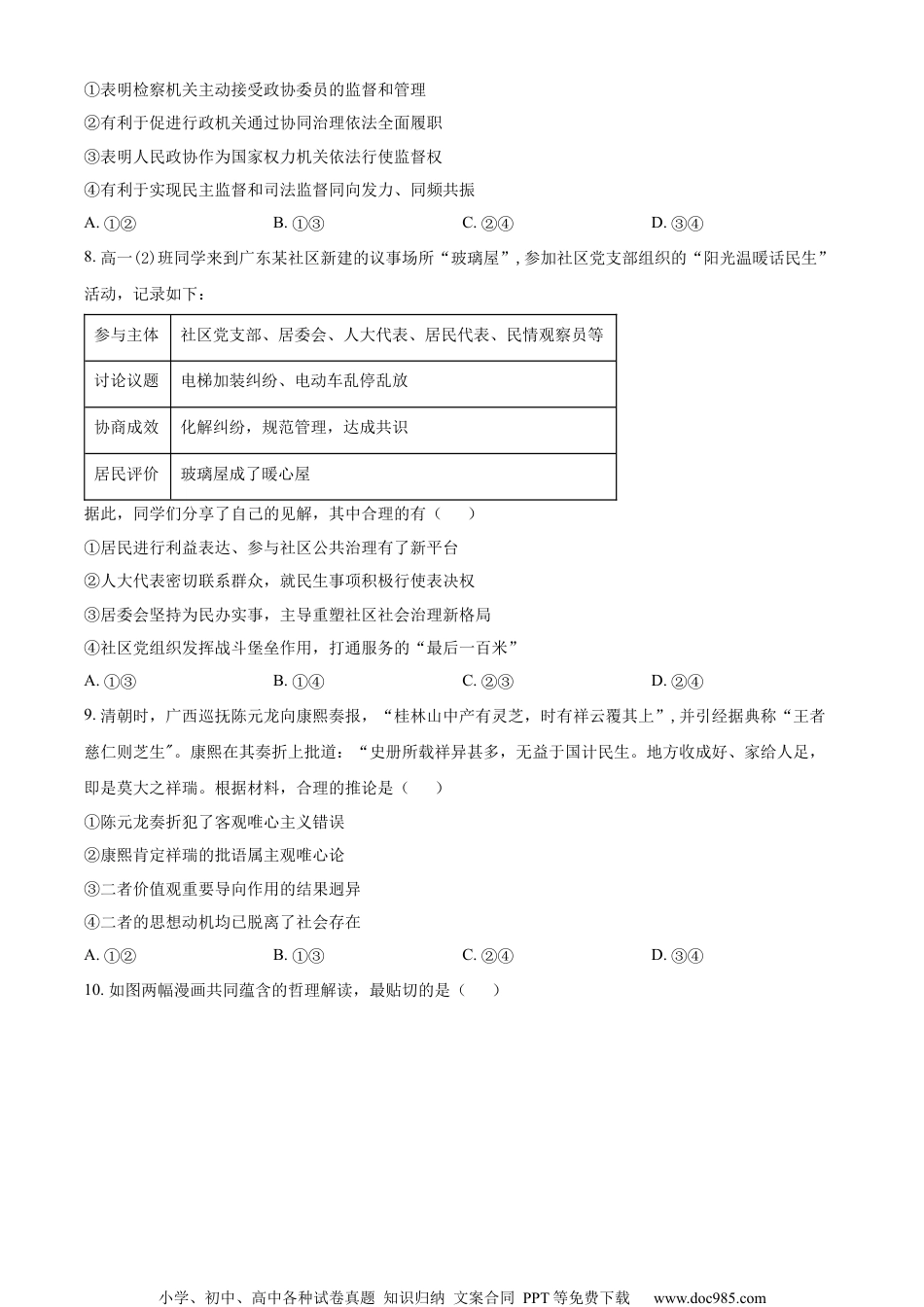 小学、初中、高中各种试卷真题知识归纳文案合同PPT等免费下载www.doc985.com2024年广东省普通高中学业水平选择性考试政治试题本试卷满分100分,考试时间75分钟一、选择题(本大题共16小题,每小题3分,共48分。在每小题给出的四个选项中,只有一项是最符合题目要求的)。1.邓小平同志在1979年要求深圳“杀出一条血路来",之后进一步提出“走自己的路”,建设有中国特色的社会主义,强调要“摸着石头过河”。2012年12月,习近平总书记在广东考察时作出“改革已经进入攻坚期和深水区”的重要论断。对此,如下解读正确的是()①“杀出一条血路来”指明了打破帝国主义封锁的方向②“走自己的路”指明了我国改革开放的方向③“摸着石头过河”说明改革伊始就明确了发展蓝图④“改革已经进入攻坚期和深水区“要求加强全面深化改革的顶层设计A.①②B.①③C.②④D.③④2.党的二十大报告提出,深入实施人才强国战略,强化现代化建设人才支撑。2023年,中办、国办印发《关于进一步加强青年科技人才培养和使用的若干措施》,强调要激励引导青年科技人才,在以中国式现代化全面推进中华民族伟大复兴的进程中奉献青春和智慧。作出这一举措是因为()①青年是实现中华民族伟大复兴的先锋力量②人才越来越成为推动经济社会发展的战略性资源③人力资源大国优势是实施人才强国战略的决定性因素④培养高素质人才是全面建设社会主义现代化国家的首要任务A.①②B.①③C.②④D.③④3.习近平总书记指出:“中国人民历来具有深厚的天下情怀,当代中国文艺要把目光投向世界、投向人类。”“广大文艺工作者要紧跟时代步伐.展现中华历史之美、山河之美、文化之美,抒写中国人民奋斗之志、创造之力、发展之果,全方位全景式展现新时代的精神气象。”以上重要论述表明()①坚定文化自信是中国特色社会主义最本质的特征②习近平文化思想要求坚持以人民为中心的创作导向③面向世界是中国特色社会主义文化发展的根本方向④文艺创作要坚持不忘本来、吸收外来、面向未来相统一A.①②B.①③C.②④D.③④4.随着无人机广泛应用于地理测绘、影视航拍、山地救援等领域,“联飞快送”“空中观光”等“无人机小学、初中、高中各种试卷真题知识归纳文案合同PPT等免费下载www.doc985.com技术+”业务涌现,低空经济成为发展新引擎。2024年,低空经济首次被写入政府工作报告。国家重视发展低空经济的原因是()①低空运输受自然气候条件的影响小②中国在低空经济领域具有成本优势③低空经济的关联产业多,有利于技术集成创新④低空经济对战略性新兴产业发展有重要推动作用A.①②B.①④C.②③D.③④5.根据个人养老金制度,开立个人养老金账户并缴费者,个人所得税综合所得汇算清缴时,按年1.2万元限额据实扣除,投资收益暂不征税,退休后领取时减按3%的税率纳税。截至2023年底,试点城市推出储蓄存款、商业养老保险等四类投资产品,吸引5000多万人开户,增强了民众的获得感。从经济逻辑看,该获得感的实现路径()缴费人账户→①选择购买投资产品→增值部分暂免征税②限额内列支扣除项→减少当期应纳税所得额→减少当期应纳个人所得税③退休后提取基本养老金→按优惠税率缴纳个人所得税④扩大社会保障基金投资→国有资产保值增值→增值部分暂免征税A.①②B.①③C.②④D.③④6.2023年12月,中共中央修订《中国共产党纪律处分条例》,要求从严抓好党的纪律建设。经党中央同意,自2024年4月至7月,在全党开展党纪学习教育,引导党员干部学纪、知纪、明纪、守纪。深入开展党纪学习教育()①反映了党要依靠法律管党治党,建设高素质干部队伍②彰显了党推进自我革命、走好新的赶考之路的决心和意志③体现了党坚持以纪律建设为统领,不断提高党的建设质量④有利于解决大党独有难题,保持和巩固党的长期执政地位A.①③B.①④C.②③D.②④7.广东某市实施“政协+检察”衔接转化工作模式。2023年该市某区“两会“期间,有政协委员提出关于完善泥头车管理机制的提案,区政协将提案移送区检察院。检察机关就此立案办理行政公益诉讼案件,并邀请政协委员参与现场调查、参加听证会,共同督促相关行政主管部门联合开展泥头车全链条深层次治理。该模式...