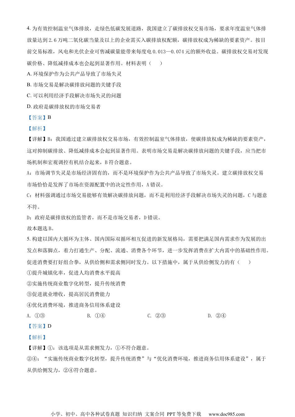 小学、初中、高中各种试卷真题知识归纳文案合同PPT等免费下载www.doc985.com2021江苏高考思想政治一、单项选择题:共15题,每题只有一个选项最符合题意。1.教育是民族振兴、社会进步的重要基石。“十四五”期间,我国将以立德树人为根本任务,以推动高质量发展为主题,以深化供给侧结构性改革为主线,以改革创新为根本动力,大力推进高质量教育体系建设。建设高质量教育体系有助于()A.保障公民的发展权,更好地服务国家建设B.调动公民直接参与教育决策和管理的积极性C.实现教育公平,维护公民基本的民主权利D.促进教育均衡发展,健全多层次社会保障体系【答案】A【解析】【详解】A.:从题干中“教育是民族振兴、社会进步的重要基石”以及“我国将以立德树人为根本任务,以推动高质量发展为主题,以深化供给侧结构性改革为主线”等内容可以看出,我国建设高质量教育体系主要是通过此举保障公民的发展权,更好地服务于国家建设,故A正确。B.:在我国,公民并不能直接参与教育决策和管理,故B错误。C:公民基本的民主权利是选举权和被选举权,而不是教育公平,故C错误。D.我国建设高质量教育体系主要是保障公民受教育的权利,服务国家发展,与健全多层次社会保障体系无关,故D错误。故本题选A。2.会议制度和工作程序。全国人大议事规则规定了全国人大及其常委会的组织制度、会议制度和工作程序。2021年3月11日,十三届全国人大四次会议表决通过了对这两部法律的修改决定,这是两部法律施行30多年后的首次修改。这两部法律的修改()A.表明人民代表大会制度符合中国国情和实际B.有助于保证人民当家作主和推进全过程民主C.丰富了人民群众行驶国家权力的途径和方式D.有利于完善社会治理机制,提升社会治理水平【答案】B【解析】【详解】A:材料未强调中国国情和实际情况,A排除。小学、初中、高中各种试卷真题知识归纳文案合同PPT等免费下载www.doc985.comB:全国人大对关于会议制度和工作程序的两部法律施行30多年后进行修改,这有助于保证人民当家作主和推进全过程民主,B符合题意。CD:两部法律是关于全国人大及其常委会的组织制度、会议制度和工作程序的,不涉及人民群众行使国家权力的途径和方式问题,也不涉及社会治理问题,CD排除。故本题选B。3.为进一步做好城市发展规划,践行“人民城市人民建,人民城市为人民”的理念,某地开展了专项问卷调查,其中“企业对政府服务的期望”调查结果如图所示。该检查结果启示政府有关部门需要()A.推进政府职能由服务社会向服务企业转变B.简政放权,提高基本公共服务均等化水平C.深化“放管服”改革,持续优化营商环境D.完善宏观经济治理,提高政府科技创新力【答案】C【解析】【详解】A:推进政府职能由管理型向服务型转变,推进政府职能由服务社会向服务企业转变说法错误。B:题干信息强调的是政府要对企业的服务,与提高基本公共服务均等化水平无关,B不符合题意。C:调查结果显示:企业对政府服务的期望种类较多,体现了政府需要深化“放管服”改革,优化营商环境,C符合题意。D:提高政府科技创新力说法错误,应该是企业提高科技创新能力,D错误。故本题选C。小学、初中、高中各种试卷真题知识归纳文案合同PPT等免费下载www.doc985.com4.为有效控制温室气体排放,走绿色低碳发展道路,我国建立了碳排放权交易市场,要求年度温室气体排放量达到2.6万吨二氧化碳当量及以上的企业需买入碳排放权配额,碳排放权成为稀缺的要素资产。按目前交易标准,风电和光伏企业可售减碳量能带来每度电0.013—0.074元的额外收益。碳排放权交易对发现碳价格、降低减排成本也会起到显著作用。材料表明()A.环境保护作为公共产品导致了市场失灵B.市场交易是解决碳排放问题的关键手段C.可以利用经济手段解决市场失灵的问题D.政府是碳排放权的市场交易者【答案】B【解析】【详解】B:我国通过建立碳排放权交易市场,有效控制温室气体排放,使碳排放权成为稀缺的要素资产,这对抑制碳排放、降低减排成本会起到显著作用。表明市场交易是解决碳排放问题的关键手段,应当把市场机制和宏观调控有机结合起来,B符合题意。A:市场调节失灵是市场经济固有的,而不...