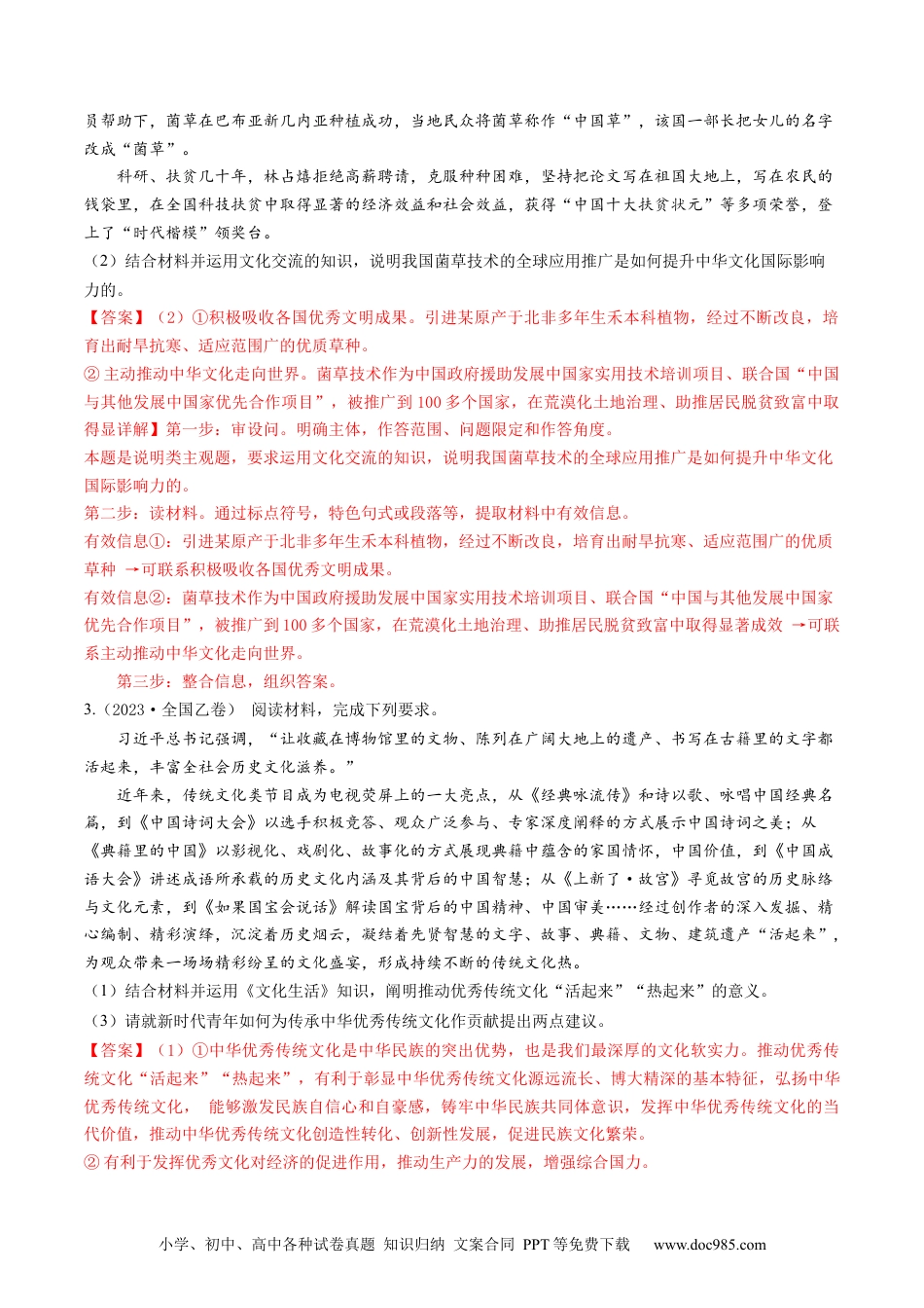 小学、初中、高中各种试卷真题知识归纳文案合同PPT等免费下载www.doc985.com五年(2019-2023)年高考政治真题分项汇编专题19文化生活综合主观题1.(2023·全国甲卷)阅读材料,完成下列要求。为解决传统菌业生产中日益突出的“菌林矛盾”这一世界难题,1983年,林占熺团队引进某原产于北非多年生禾本科植物,经过不断改良,培育出耐旱抗寒、适应范围广的优质草种;1986年,该团队“以草代木”栽培食、药用菌新技术的菌草研究取得突破,创造性地实现了菌与草的结合;1996年,林占熺正式将菌草的汉语拼音确定为菌草的英文名称。随着研究的深入,林占熺团队创立了“菌草学”这门新兴学科,拓展应用菌草技术于沙漠治理、饲料生产和生物质能源与材料开发等领域,菌草新兴生态产业逐渐成型。菌草技术作为中国政府援助发展中国家实用技术培训项目、联合国“中国与其他发展中国家优先合作项目”,被推广到100多个国家,在荒漠化土地治理、助推居民脱贫致富中取得显著成效。在中国科技人员帮助下,菌草在巴布亚新几内亚种植成功,当地民众将菌草称作“中国草”,该国一部长把女儿的名字改成“菌草”。科研、扶贫几十年,林占熺拒绝高薪聘请,克服种种困难,坚持把论文写在祖国大地上,写在农民的钱袋里,在全国科技扶贫中取得显著的经济效益和社会效益,获得“中国十大扶贫状元”等多项荣誉,登上了“时代楷模”领奖台。(3)林占熺当选感动中国2022年度人物,他的事迹是如何感动你的,请列举两点。【答案】(3)①具有浓厚的爱国主义思想。林占熺拒绝高薪聘请,克服种种困难,坚持把论文写在祖国大地上,写在农民的钱袋里。②具有忘我的爱岗敬业精神。林占熺引进外地草种,改良培育出优质草种;“以草代木”栽培食、药用菌新技术的菌草研究取得突破,创造性地实现了菌与草的结合;创立了“菌草学”这门新兴学科,拓展应用菌草技术于沙漠治理、饲料生产和生物质能源与材料开发等领域,菌草新兴生态产业逐渐成型。【详解】(3)本题是开放试题,要求列举林占熺的事迹让人感动的两点。观点言之有理即可。参考角度:具有浓厚的爱国主义思想、具有忘我的爱岗敬业精神。2.(2023·全国甲卷)阅读材料,完成下列要求。为解决传统菌业生产中日益突出的“菌林矛盾”这一世界难题,1983年,林占熺团队引进某原产于北非多年生禾本科植物,经过不断改良,培育出耐旱抗寒、适应范围广的优质草种;1986年,该团队“以草代木”栽培食、药用菌新技术的菌草研究取得突破,创造性地实现了菌与草的结合;1996年,林占熺正式将菌草的汉语拼音确定为菌草的英文名称。随着研究的深入,林占熺团队创立了“菌草学”这门新兴学科,拓展应用菌草技术于沙漠治理、饲料生产和生物质能源与材料开发等领域,菌草新兴生态产业逐渐成型。菌草技术作为中国政府援助发展中国家实用技术培训项目、联合国“中国与其他发展中国家优先合作项目”,被推广到100多个国家,在荒漠化土地治理、助推居民脱贫致富中取得显著成效。在中国科技人小学、初中、高中各种试卷真题知识归纳文案合同PPT等免费下载www.doc985.com员帮助下,菌草在巴布亚新几内亚种植成功,当地民众将菌草称作“中国草”,该国一部长把女儿的名字改成“菌草”。科研、扶贫几十年,林占熺拒绝高薪聘请,克服种种困难,坚持把论文写在祖国大地上,写在农民的钱袋里,在全国科技扶贫中取得显著的经济效益和社会效益,获得“中国十大扶贫状元”等多项荣誉,登上了“时代楷模”领奖台。(2)结合材料并运用文化交流的知识,说明我国菌草技术的全球应用推广是如何提升中华文化国际影响力的。【答案】(2)①积极吸收各国优秀文明成果。引进某原产于北非多年生禾本科植物,经过不断改良,培育出耐旱抗寒、适应范围广的优质草种。②主动推动中华文化走向世界。菌草技术作为中国政府援助发展中国家实用技术培训项目、联合国“中国与其他发展中国家优先合作项目”,被推广到100多个国家,在荒漠化土地治理、助推居民脱贫致富中取得显详解】第一步:审设问。明确主体,作答范围、问题限定和作答角度。本题是说明类主观题,要求运用文化交流的知识,说明我国菌草技术的全球应用...