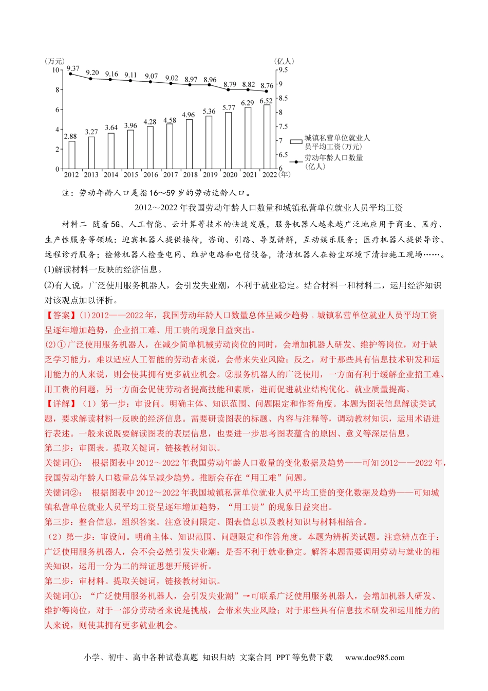 小学、初中、高中各种试卷真题知识归纳文案合同PPT等免费下载www.doc985.com五年(2019-2023)年高考政治真题分项汇编专题17经济生活综合主观题1.(2023·全国·甲卷)阅读材料,完成下列要求。一片绿地、一顶帐篷、一桌美食,和家人、好友一起享受美景美食、谈天说地……打开手机,仿佛半个朋友圈都在露营。据统计,截至2023年3月,我国共有8.75万家露营企业,2022年新增3.51万家,新增量同比增长54.5%,帐篷、睡袋、折叠桌椅等商品产销量大幅度增长,企业不断推出“露营+钓鱼+瑜伽”“露营+烧烤+篝火晚会”“露营+亲子活动”等诸多新产品和新服务。2022年中国露营经济核心市场规模达到1134.7亿元,同比增长51.8%;带动市场规模为5816.1亿元,同比增长52.6%。结合材料并运用经济知识,分析露营热的原因及其对促进经济发展的作用。【答案】原因:居民收入增加,消费结构升级,推动露营需求快速升温;露营热也带动相关服务业发展,服务业发展又进一步促进露营热;消费对生产的调整和升级起着导向作用,露营热覆盖面宽,市场需求大,刺激露营企业的井喷式出现,增加供给;一个新的消费热点的出现,往往会带动一个产业的出现和成长,需求与供给的双向拉动,形成了新的消费增长点。作用:以露营为代表的微度假热潮是新消费热点。在这种热潮下,旅游休闲资源、产业链逐渐被调动起来,既满足了我国人民对美好生活的需求,提升生活休闲质量;也成为疫情后旅游业恢复发展重要的推动力量;还从居民需求端、产业供给端,为我国经济的企稳向好发展提供了新动能。【详解】第一步:审设问。明确主体、知识范围、问题限定和作答角度。本题需要调用经济的有关知识,从原因、意义角度分析作答。第二步:审材料。提取关键词,链接教材知识。关键词①:仿佛半个朋友圈都在露营……商品产销量大幅度增长→可联系教材知识居民收入增加,消费结构升级;消费对生产的导向作用;需求与供给的关系;关键词②:一起享受美景美食……新增量同比增长……带动市场规模等→可联系教材知识既满足了我国人民对美好生活的需求;也成为疫情后旅游业恢复发展重要的推动力量;为我国经济的企稳向好发展提供了新动能。第三步:整合信息,组织答案。注意设问限定以及教材知识与材料、时政信息等相结合。2.(2023·全国·乙卷)阅读材料,完成下列要求。材料一小学、初中、高中各种试卷真题知识归纳文案合同PPT等免费下载www.doc985.com注:劳动年龄人口是指16~59岁的劳动适龄人口。2012~2022年我国劳动年龄人口数量和城镇私营单位就业人员平均工资材料二随着5G、人工智能、云计算等技术的快速发展,服务机器人越来越广泛地应用于商业、医疗、生产性服务等领域:迎宾机器人提供接待,咨询、引路、导览讲解,互动娱乐服务;医疗机器人提供导诊、远程诊疗服务;检修机器人检查电网、维护电路和电信设备,清洁机器人在粉尘环境下清扫施工现场……。(1)解读材料一反映的经济信息。(2)有人说,广泛使用服务机器人,会引发失业潮,不利于就业稳定。结合材料一和材料二,运用经济知识对该观点加以评析。【答案】(1)2012——2022年,我国劳动年龄人口数量总体呈减少趋势﹐城镇私营单位就业人员平均工资呈逐年增加趋势,企业招工难、用工贵的现象日益突出。(2)①广泛使用服务机器人,在减少简单机械劳动岗位的同时,会增加机器人研发、维护等岗位,对于缺乏学习能力,难以适应人工智能的劳动者来说,会带来失业风险;反之,对于那些具有信息技术研发和运用能力的人来说,则会使其拥有更多就业机会。②服务机器人的广泛使用,一方面有利于缓解企业招工难、用工贵的问题,另一方面会促使劳动者提高技能和素质,进而促进就业结构优化、就业质量提高。【详解】(1)第一步:审设问。明确主体、知识范围、问题限定和作答角度。本题为图表信息解读类试题,要求解读材料一反映的经济信息。需要研读图表的标题、内容与注释等,调动教材知识,运用术语进行表述。一般来说既要解读图表的表层信息,也要进一步思考图表蕴含的原因、意义等深层信息。第二步:审图表。提取关键词,链接教材知识。关键词①:根据图表中2012~2022年我国劳动年龄人...