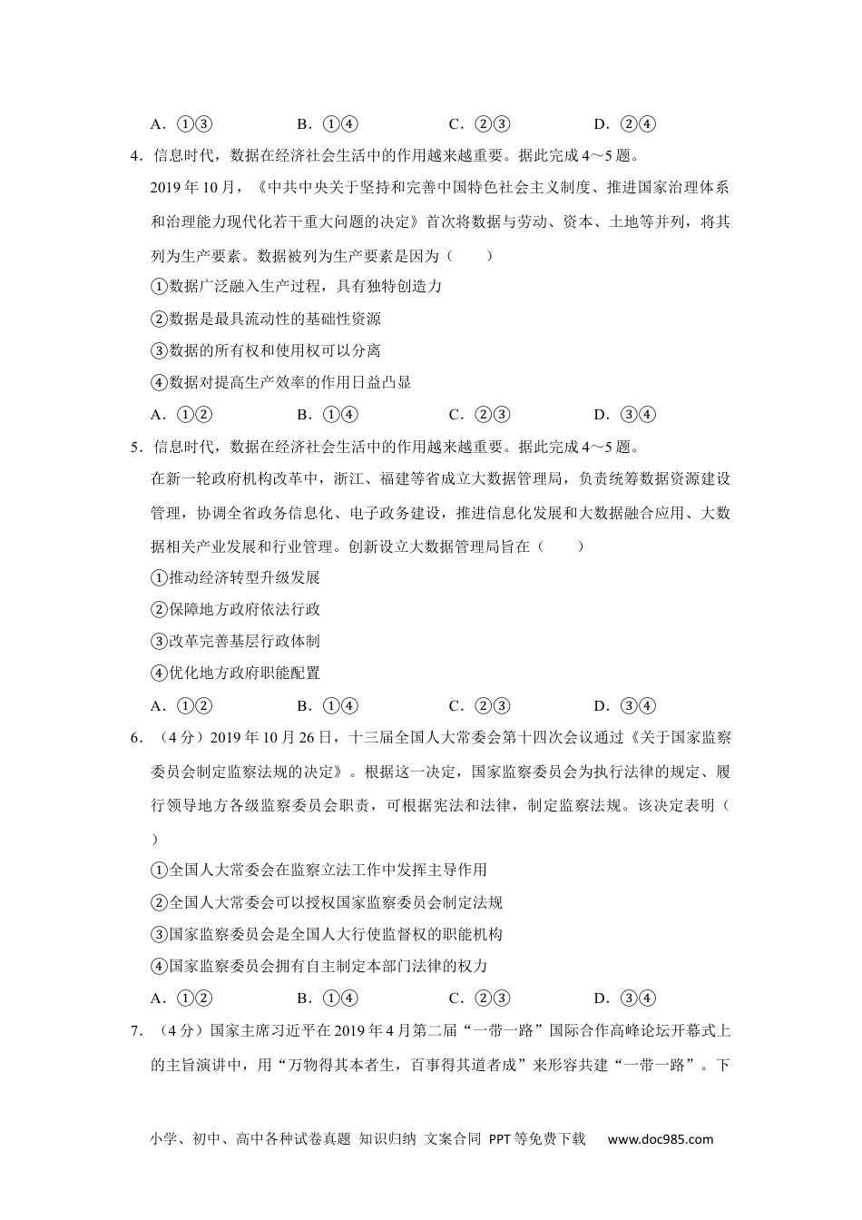 小学、初中、高中各种试卷真题知识归纳文案合同PPT等免费下载www.doc985.com2020年全国统一高考政治试卷(新课标Ⅰ)一、选择题:本题共11小题,每小题4分,共48分。在每小题给出的四个选项中,只有一项是符合题目要求的。1.(4分)新冠肺炎疫情发生以后,医用口罩、防护服、消毒液等防疫物资一度紧缺,不少大型制造企业开启了“跨界”生产之路,如某电器集团紧急成立医疗子公司,迅速调整生产计划,很快向市场提供医疗物资生产设备和医用口罩。企业短时间内紧急转产、快速投产,说明()①我国相关制造业有完整灵活的供应链②市场需求对企业生产有重要导向作用③企业具有转产防疫产品的前瞻性战略④企业可以通过转产快速化解市场风险A.①②B.①④C.②③D.③④2.(4分)为发挥农业保险对支农惠农、促进农业发展的作用,中央财政于2007年开始实施农业保险保费补贴政策。截至2019年底,农业保险累计支付赔款2400多亿元,服务农户数从0.5亿户次增至1.8亿户次,提供的风险保障从0.1万亿元增加到3.6万亿元。农业保险保费补贴政策发挥作用的路径是()①获得财政补贴,降低成本支出②增加生产投入,促进产业发展③购买农业保险,支付保险费用④转移灾害风险,稳定收入预期A.①→③→④→②B.①→③→②→④C.③→①→④→②D.③→①→②→④3.(4分)2015年10月,人民币跨境支付系统(CIPS)正式启动。CIPS是由中国人民银行组织开发,为境内外金融机构人民币跨境和离岸业务提供资金清算与结算服务的系统。截至2020年5月末,有96个国家和地区的969家银行接入该系统。CIPS的推广使用表明()①人民币实现跨境自由流动②人民币国际化进程加速③人民币在全球可自由兑换④中国对外贸易结算风险降低小学、初中、高中各种试卷真题知识归纳文案合同PPT等免费下载www.doc985.comA.①③B.①④C.②③D.②④4.信息时代,数据在经济社会生活中的作用越来越重要。据此完成4~5题。2019年10月,《中共中央关于坚持和完善中国特色社会主义制度、推进国家治理体系和治理能力现代化若干重大问题的决定》首次将数据与劳动、资本、土地等并列,将其列为生产要素。数据被列为生产要素是因为()①数据广泛融入生产过程,具有独特创造力②数据是最具流动性的基础性资源③数据的所有权和使用权可以分离④数据对提高生产效率的作用日益凸显A.①②B.①④C.②③D.③④5.信息时代,数据在经济社会生活中的作用越来越重要。据此完成4~5题。在新一轮政府机构改革中,浙江、福建等省成立大数据管理局,负责统筹数据资源建设管理,协调全省政务信息化、电子政务建设,推进信息化发展和大数据融合应用、大数据相关产业发展和行业管理。创新设立大数据管理局旨在()①推动经济转型升级发展②保障地方政府依法行政③改革完善基层行政体制④优化地方政府职能配置A.①②B.①④C.②③D.③④6.(4分)2019年10月26日,十三届全国人大常委会第十四次会议通过《关于国家监察委员会制定监察法规的决定》。根据这一决定,国家监察委员会为执行法律的规定、履行领导地方各级监察委员会职责,可根据宪法和法律,制定监察法规。该决定表明()①全国人大常委会在监察立法工作中发挥主导作用②全国人大常委会可以授权国家监察委员会制定法规③国家监察委员会是全国人大行使监督权的职能机构④国家监察委员会拥有自主制定本部门法律的权力A.①②B.①④C.②③D.③④7.(4分)国家主席习近平在2019年4月第二届“一带一路”国际合作高峰论坛开幕式上的主旨演讲中,用“万物得其本者生,百事得其道者成”来形容共建“一带一路”。下小学、初中、高中各种试卷真题知识归纳文案合同PPT等免费下载www.doc985.com列选项与“本”和“道”含义不相符的是()A.经济全球化的历史潮流B.全球治理体系变革的时代要求C.各国人民过上更好日子的强烈愿望D.发展中国家实现区域经济一体化的迫切需要8.(4分)家庭联产承包责任制拉开了中国改革开放的序幕,农村改革带来的希望在心底里流淌、在劳动中萌发,文艺工作者的创作激情和灵感在希望的田野上点燃,歌曲《在希望的田野上》由此诞生。如今,这首唱响大江南北的歌已...