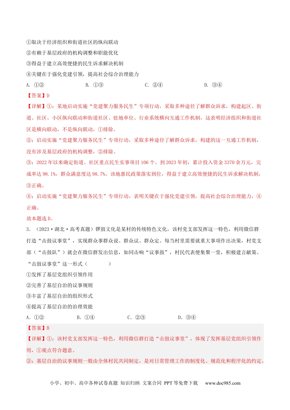 小学、初中、高中各种试卷真题知识归纳文案合同PPT等免费下载www.doc985.com五年(2019-2023)年高考真题分项汇编专题05公民的政治生活1.(2023·全国甲卷)近年来,某地积极探索推进基层治理现代化,打造区、街道、社区三级微服务平台,形成“党建引领、社区主导、社工参与、情感治理、数据赋能”五大机制,构建起以“大数据、微服务”为主要特色的社区治理和服务综合体系,被评为全国基层治理创新典型案例。这启示我们,加强基层治理()①要统筹发挥街道、社区的政府管理职能②要以向基层放权赋能、减轻基层负担为前提③需要推动政府治理同社会调节、居民自治良性互动④要坚持系统治理、综合治理理念,提高治理智能化、专业化水平A.①②B.①③C.②④D.③④【答案】D【详解】③④:材料中,该地打造区、街道、社区三级服务平台,推动基层治理创新,这启示我们,加强基层治理要推动政府治理同社会调节、居民自治良性互动;该地构建以“大数据”“微服务”为主要特色的社区治理和服务综合体系,这启示我们,加强基层治理要要坚持系统治理、综合治理理念、提高治理智能化、专业化水平,③④符合题意。①:社区不属于政府部门,不具有政府的管理职能,①说法错误。②:材料强调基层治理要推动政府、社会、居民良性互动,没有体现向基层放权赋能,也没有涉及减轻基层负担。②与题意不符。故本题选D。2.(2023·全国乙卷)某地启动实施“党建聚力服务民生”专项行动,采取多种途径了解群众诉求,构建起区、街道、社区、小区纵向联动和街道社区、驻地单位、行业系统横向互通工作机制。2022年以来,确定街道、社区重点民生实事项目106个。到2023年初,累计投入资金3370余万元,完成率达98.1%,群众满意度达98.7%。该地惠民政策落实到位()小学、初中、高中各种试卷真题知识归纳文案合同PPT等免费下载www.doc985.com①取决于经济组织和街道社区的纵向联动②有赖于基层政府的机构调整和职能优化③得益于建立高效便捷的民生诉求解决机制④关键在于强化党建引领,提高社会综合治理能力A.①②B.①③C.②④D.③④【答案】D【详解】①:某地启动实施“党建聚力服务民生”专项行动,采取多种途径了解群众诉求,构建起区、街道、社区、小区纵向联动和街道社区、驻地单位、行业系统横向互通工作机制,这表明经济组织和街道社区是横向联动,不是纵向联动,①排除。②:启动实施“党建聚力服务民生”专项行动,采取多种途径了解群众诉求,构建的这一互通工作机制,没有涉及基层政府的机构调整,②排除。③:2022年以来确定街道、社区重点民生实事项目106个。到2023年初,累计投入资金3370余万元,完成率达98.1%,群众满意度达98.7%。该地惠民政策落实到位,得益于建立高效便捷的民生诉求解决机制,③正确。④:启动实施“党建聚力服务民生”专项行动,表明关键在于强化党建引领,提高社会综合治理能力,④正确。故本题选D。3.(2023·湖北·高考真题)锣鼓文化是某村的传统特色文化,该村党支部发挥这一特色,利用微信群打造“击鼓议事堂”,实现群众事群众说、群众议、群众定。每当村里需要就重大事项作出决策,村党支部(“击鼓队”)就会在微信群发出信息,如同击响“议事鼓”,村民代表便集聚一堂,积极建言献策。“击鼓议事堂”这一形式()①发挥了基层党组织引领作用②完善了基层自治的议事规则③丰富了基层自治的组织形式④提高了基层自治的治理效能A.①②B.①④C.②③D.③④【答案】B【详解】①:该村党支部发挥这一特色,利用微信群打造“击鼓议事堂”,体现了发挥基层党组织引领作用,①观点符合题意。②:基层自治的议事规则一般由全体村民共同制定,是对日常管理工作的制度化、规范化和程序化的约定,小学、初中、高中各种试卷真题知识归纳文案合同PPT等免费下载www.doc985.com而“击鼓议事堂”是基层自治的治理模式,②观点不符合题意。③:我国的基层自治的组织形式是村委会和居委会,并没有丰富,③说法错误。④:每当村里需要就重大事项作出决策,村党支部就会在微信群发出信息,村民代表便集聚一堂,积极建言献策,体现了这一形式提高了基层自治的治理效能,④观点符合题意。...