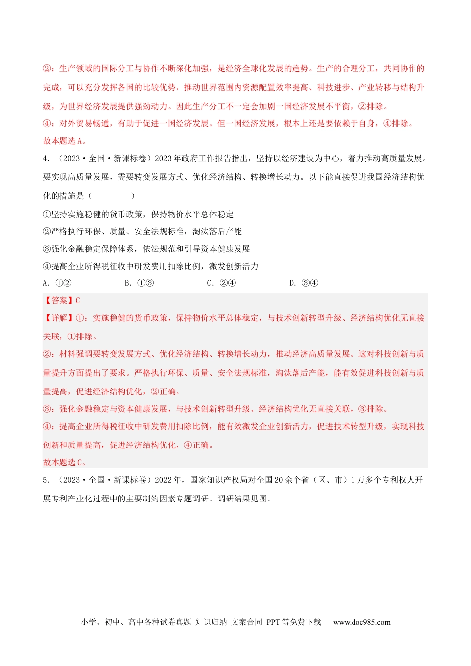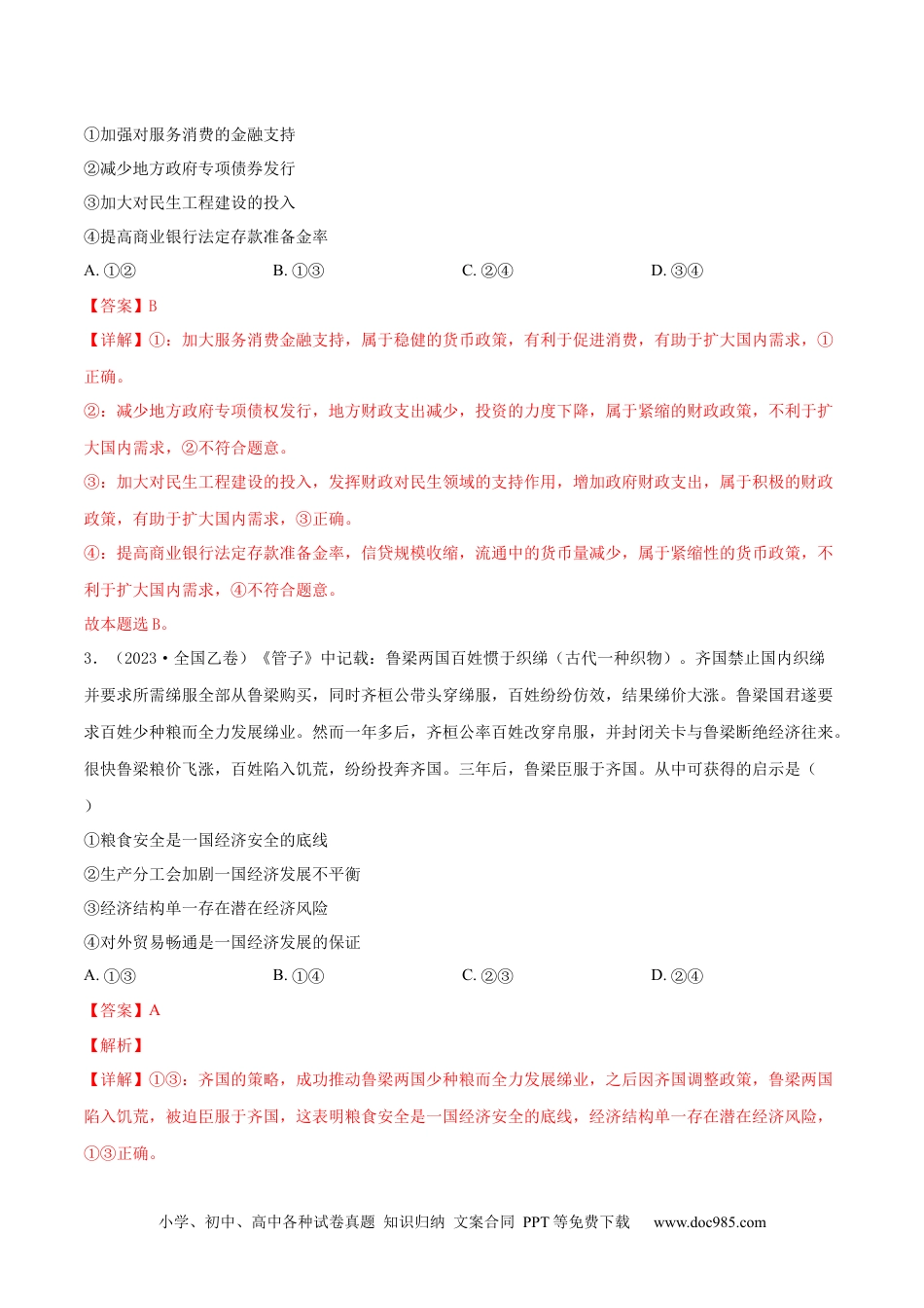 小学、初中、高中各种试卷真题知识归纳文案合同PPT等免费下载www.doc985.com五年(2019-2023)年高考真题分项汇编专题04发展社会主义市场经济1.(2023·全国甲卷)《证券期货业网络和信息安全管理办法》于2023年5月1日正式实施。该《办法》要求经营机构对收集客户生物特征的必要性和安全性进行风险评估,明确“不得将人脸、步态、指纹、虹膜、声纹等生物特征作为唯一的客户身份认证方式,强制客户同意收集其个人生物特征信息”。这一规定旨在()①消除证券期货业经营风险②维护经营机构信息安全③保护客户的隐私和个人信息④规范经营机构的信息收集行为A.①②B.①④C.②③D.③④【答案】D【解析】【详解】①:材料中的规定旨在保护客户个人信息、规范经营机构的信息收集行为,但无法“消除证券期货业经营风险”,①说法错误。②:材料中的规定旨在保护客户个人信息权益,而不是维护经营机构的信息安全,②不符合题意。③:“不得将人脸、步态、指纹……等生物特征作为唯一的客户身份认证方式”的规定,说明经营机构不得违反必要原则,同时应当对其安全性进行风险评估,要注重保护客户的隐私和个人信息,③符合题意。④:“不得强制客户同意收集其个人生物特征信息”的规定,说明经营机构应当遵循合法、正当原则,规范自身的信息收集行为,收集客户信息要征得客户的同意,④符合题意。故本题选D。2.(2023·全国甲卷)2022年12月,中央经济工作会议将“着力扩大国内需求”作为2023年经济工作的重要任务,强调要继续实施积极的财政政策和稳健的货币政策,坚持经济运行稳字当头、稳中求进。以下政策举措有助于扩大国内需求的是()小学、初中、高中各种试卷真题知识归纳文案合同PPT等免费下载www.doc985.com①加强对服务消费的金融支持②减少地方政府专项债券发行③加大对民生工程建设的投入④提高商业银行法定存款准备金率A.①②B.①③C.②④D.③④【答案】B【详解】①:加大服务消费金融支持,属于稳健的货币政策,有利于促进消费,有助于扩大国内需求,①正确。②:减少地方政府专项债权发行,地方财政支出减少,投资的力度下降,属于紧缩的财政政策,不利于扩大国内需求,②不符合题意。③:加大对民生工程建设的投入,发挥财政对民生领域的支持作用,增加政府财政支出,属于积极的财政政策,有助于扩大国内需求,③正确。④:提高商业银行法定存款准备金率,信贷规模收缩,流通中的货币量减少,属于紧缩性的货币政策,不利于扩大国内需求,④不符合题意。故本题选B。3.(2023·全国乙卷)《管子》中记载:鲁梁两国百姓惯于织绨(古代一种织物)。齐国禁止国内织绨并要求所需绨服全部从鲁梁购买,同时齐桓公带头穿绨服,百姓纷纷仿效,结果绨价大涨。鲁梁国君遂要求百姓少种粮而全力发展绨业。然而一年多后,齐桓公率百姓改穿帛服,并封闭关卡与鲁梁断绝经济往来。很快鲁梁粮价飞涨,百姓陷入饥荒,纷纷投奔齐国。三年后,鲁梁臣服于齐国。从中可获得的启示是()①粮食安全是一国经济安全的底线②生产分工会加剧一国经济发展不平衡③经济结构单一存在潜在经济风险④对外贸易畅通是一国经济发展的保证A.①③B.①④C.②③D.②④【答案】A【解析】【详解】①③:齐国的策略,成功推动鲁梁两国少种粮而全力发展绨业,之后因齐国调整政策,鲁梁两国陷入饥荒,被迫臣服于齐国,这表明粮食安全是一国经济安全的底线,经济结构单一存在潜在经济风险,①③正确。小学、初中、高中各种试卷真题知识归纳文案合同PPT等免费下载www.doc985.com②:生产领域的国际分工与协作不断深化加强,是经济全球化发展的趋势。生产的合理分工,共同协作的完成,可以充分发挥各国的比较优势,推动世界范围内资源配置效率提高、科技进步、产业转移与结构升级,为世界经济发展提供强劲动力。因此生产分工不一定会加剧一国经济发展不平衡,②排除。④:对外贸易畅通,有助于促进一国经济发展。但一国经济发展,根本上还是要依赖于自身,④排除。故本题选A。4.(2023·全国·新课标卷)2023年政府工作报告指出,坚持以经济建设为中心,着力推动高质量发展。要实现高质量发展,需要转变发展方式、优化经济结构...