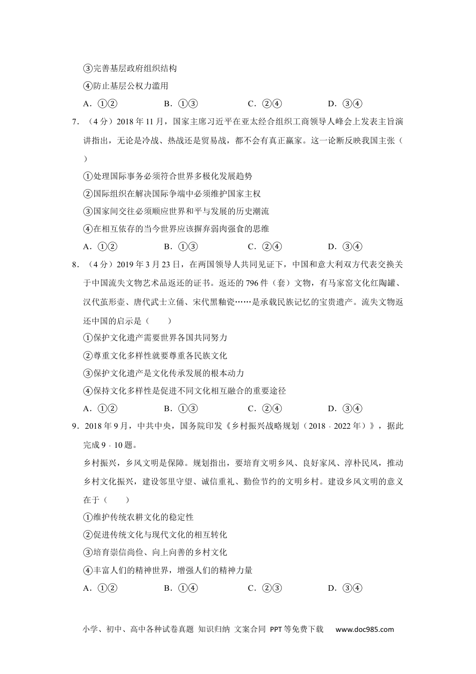小学、初中、高中各种试卷真题知识归纳文案合同PPT等免费下载www.doc985.com2019年全国统一高考政治试卷(新课标Ⅱ)一、选择题:本题共11小题,每小题4分,共48分。在每小题给出的四个选项中,只有一项是符合题目要求的。1.(4分)某国生产新闻纸所需要的纸浆以固废纸为原料,消耗的固废纸20%以上依赖进口。出于环保需要,2019年该国开始限制固废纸进口。不考虑其他因素,正确反映短期内该国新闻纸价格变化的图示是(图中S表示供给,D表示需求)()A.B.C.D.2.(4分)为进一步加大对小微企业支持力度,财政部、国家税务总局发布通知,自2018年9月1日至2020年12月31日,对金融机构向小型企业、微利企业和个体工商户发放小额贷款取得的利息收入,免征增值税。该税收政策发挥作用的路径是()①激发小微企业的经营活力②缓解小微企业的融资困难③引导金融机构对小微企业放贷④改变金融机构税收负担预期⑤降低金融机构的贷款利率A.①→②→④→③B.④→③→②→①C.②→③→①→⑤D.⑤→③→②→①3.(4分)2018年,全国居民人均消费支出19853元,同比增长6.2%;全国社会消费品零售总额同比增长9.0%;最终消费支出对国内生产总值增长的贡献率为76.2%,比上年提小学、初中、高中各种试卷真题知识归纳文案合同PPT等免费下载www.doc985.com高17.4个百分点;基本必需品消费支出占比下降,通讯器材类和化妆品类的消费支出分别同比增长11.7%和13.5%.上述信息表明()①消费成为拉动经济增长的首要因素②居民消费结构改善,恩格尔系数下降③消费品供给丰富,产业结构日趋优化④高档品消费增加,居民消费趋于理性A.①②B.①④C.②③D.③④4.(4分)2019年1月,证监会发布《关于在上海证券交易所设立科创板并试点注册制的实施意见》。科创板是专门服务有良好发展前景和市场认可度的科技型与创新型企业的股票板块。与现行股票市场中的主板不同,科创板试行注册制,并允许尚未盈利的公司上市。设立科创板旨在()①放宽市场准入,支持科创企业发展②完善资本市场,提高资本配置效率③增加投资选择,控制资本市场风险④加速资金流动,提高股市投资回报率A.①②B.①③C.②④D.③④5.(4分)2018年10月,十三届全国人大常委会围绕人民法院解决“执行难”工作、人民检察院加强对民事诉讼和执行活动法律监督工作首次开展专题询问。最高人民法院院长、最高人民检察院检察长等相关人员到会应询作答。人大常委会对“两高”工作进行专题询问是()①行使最高立法权的积极探索②加强对司法工作监督的重要形式③推进落实司法责任,促进司法公正的必要举措④裁决民事纠纷、提高执行效率的工作方式创新A.①②B.①④C.②③D.③④6.(4分)某省探索在全省乡镇(街道)设立监察办公室,对基层所有行使公权力的公职人员进行监察。截至2018年7月底,全省1389个乡镇(街道)全部完成监察办公室设置和人员任职工作。在乡镇(街道)设立监察办公室的作用在于()①提高司法工作的独立性②实现乡镇监察全覆盖小学、初中、高中各种试卷真题知识归纳文案合同PPT等免费下载www.doc985.com③完善基层政府组织结构④防止基层公权力滥用A.①②B.①③C.②④D.③④7.(4分)2018年11月,国家主席习近平在亚太经合组织工商领导人峰会上发表主旨演讲指出,无论是冷战、热战还是贸易战,都不会有真正赢家。这一论断反映我国主张()①处理国际事务必须符合世界多极化发展趋势②国际组织在解决国际争端中必须维护国家主权③国家间交往必须顺应世界和平与发展的历史潮流④在相互依存的当今世界应该摒弃弱肉强食的思维A.①②B.①③C.②④D.③④8.(4分)2019年3月23日,在两国领导人共同见证下,中国和意大利双方代表交换关于中国流失文物艺术品返还的证书。返还的796件(套)文物,有马家窑文化红陶罐、汉代茧形壶、唐代武士立俑、宋代黑釉瓷……是承载民族记忆的宝贵遗产。流失文物返还中国的启示是()①保护文化遗产需要世界各国共同努力②尊重文化多样性就要尊重各民族文化③保护文化遗产是文化传承发展的根本动力④保持文化多样性是促进不同文化相互融合的重要途径A.①②B.①③C.②④D...
