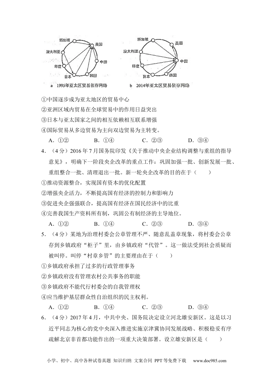 小学、初中、高中各种试卷真题知识归纳文案合同PPT等免费下载www.doc985.com2017年全国统一高考政治试卷(新课标Ⅱ)一、选择题:本题共12小题,每小题4分,共48分。在每小题给出的四个选项中,只有一项是符合题目要求的。1.(4分)全球智能手机市场品牌众多,竞争激烈。2016年,多数国际厂商出货量同比下滑。中国某厂商依托技术创新和流程创新,自主开发芯片、电池等核心部件,生产出功能更强、性价比更高的手机,出货量逆势增长58.4%.该厂商的成功得益于()①依托自主开发提高社会劳动生产率,使商品价值增加②个别劳动生产率高于社会劳动生产率,获得竞争优势③依托自主创新提高商品的使用价值,扩大了商品需求④个别劳动时间大于社会必要劳动时间,商品价值增加。A.①②B.①④C.②③D.③④2.(4分)2016年4月至2017年4月,人民币对美元的汇率中间价(人民币元/100美元)由645.79振荡走高至689.06,这对我国对外经济造成重要影响,若不考虑其他因素,下列推导正确的是()A.美元升值→中国商品在美国市场的价格下降→不利于中国商品出口美国B.美元贬值→美国商品在中国市场的价格上升→有利于中国进口美国商品C.人民币升值→中国企业在美国投资成本下降→有利于中国企业在美国投资D.人民币贬值→中国企业在美国投资成本上升→不利于中国企业在美国投资3.(4分)图a和图b分别反映1995年和2014年亚太区主要国家的贸易依存网络。箭头“甲→乙”表示乙国为甲国最大的贸易伙伴。图a到图b的变化说明()小学、初中、高中各种试卷真题知识归纳文案合同PPT等免费下载www.doc985.com①中国逐步成为亚太地区的贸易中心②亚洲区域内贸易在全球贸易中的作用日益突出③日本与亚太国家之间的相互依赖相互联系增强④国际贸易从多边贸易为主向双边贸易为主转变。A.①②B.①④C.②③D.③④4.(4分)2016年7月国务院印发《关于推动中央企业结构调整与重组的指导意见》,明确下一阶段央企改革的重点工作:巩固加强一批、创新发展一批、重组整合一批、清理退出一批。新一轮央企改革的目的在于()①推动资源整合,实现国有资本的优化配置②增强央企活力,不断提高国有经济的控制力和影响力③促进央企强强联合,提高国有经济在国民经济中的比重④完善我国生产资料所有制,巩固公有制经济的主导地位。A.①②B.①④C.②③D.③④5.(4分)某地为治理村委会公章管理不严、随意乱盖章现象,将村委会公章存到乡镇政府“柜子”里,由乡镇政府“代管”。这一做法受到社会质疑而被叫停。叫停“村章乡管”的主要理由在于()①乡镇政府承担了过多的行政管理事务②乡镇政府没有管理农村公共事务的职能③乡镇政府不能代行村委会的自我管理权④应当维护基层群众性自治组织的民主权利。A.①②B.①④C.②③D.③④6.(4分)2017年4月,中共中央、国务院决定设立河北雄安新区。这是以习近平同志为核心的党中央深入推进实施京津冀协同发展战略、积极稳妥有序疏解北京非首都功能作出的一项重大决策部署。设立雄安新区是()小学、初中、高中各种试卷真题知识归纳文案合同PPT等免费下载www.doc985.com①党中央治国理政新理念新思想战略的重大实践②深化体制机制改革,促进全面发展的制度创新③党和政府全心全意为人民服务宗旨的重要体现④推进我国行政区划全面改革与调整的重要举措。A.①②B.①③C.②④D.③④7.(4分)某社区有汉、回、白、彝、傣等二十多个民族居住。每逢民族节日,各族群众都一起欢庆,“同过民族节,众筹百家宴”。在泼水节大家到民族团结广场相互泼水祈福,在火把节组织篝火晚会一起载歌载舞,在开斋节一起吃馓子、油香……该社区各族群众同过民族节()①是各民族实现共同繁荣的有效途径②体现了平等团结互助和谐的民族关系③实现了多民族地区社区组织的自我完善④是各民族相互尊重、文化交融的生动写照。A.①②B.①③C.②④D.③④8.(4分)近年来,大批中国游客到俄罗斯参观“阿芙乐尔”号巡洋舰、斯莫尔尼宫、列宁墓等,感受俄罗斯红色文化的魅力。同时,毛泽东故居等中国红色旅游项目越来越受到俄罗斯人的喜爱。中俄两国之间红色旅游发展得益于两国的红色...