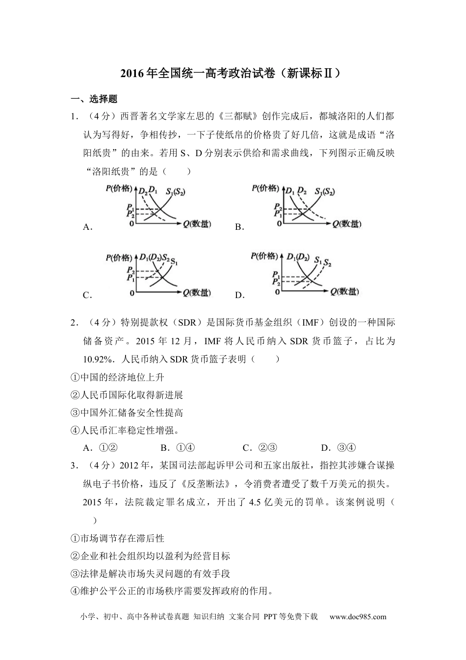 小学、初中、高中各种试卷真题知识归纳文案合同PPT等免费下载www.doc985.com2016年全国统一高考政治试卷(新课标Ⅱ)一、选择题1.(4分)西晋著名文学家左思的《三都赋》创作完成后,都城洛阳的人们都认为写得好,争相传抄,一下子使纸帛的价格贵了好几倍,这就是成语“洛阳纸贵”的由来。若用S、D分别表示供给和需求曲线,下列图示正确反映“洛阳纸贵”的是()A.B.C.D.2.(4分)特别提款权(SDR)是国际货币基金组织(IMF)创设的一种国际储备资产。2015年12月,IMF将人民币纳入SDR货币篮子,占比为10.92%.人民币纳入SDR货币篮子表明()①中国的经济地位上升②人民币国际化取得新进展③中国外汇储备安全性提高④人民币汇率稳定性增强。A.①②B.①④C.②③D.③④3.(4分)2012年,某国司法部起诉甲公司和五家出版社,指控其涉嫌合谋操纵电子书价格,违反了《反垄断法》,令消费者遭受了数千万美元的损失。2015年,法院裁定罪名成立,开出了4.5亿美元的罚单。该案例说明()①市场调节存在滞后性②企业和社会组织均以盈利为经营目标③法律是解决市场失灵问题的有效手段④维护公平公正的市场秩序需要发挥政府的作用。小学、初中、高中各种试卷真题知识归纳文案合同PPT等免费下载www.doc985.comA.①②B.①③C.②④D.③④4.(4分)近年来,服装企业越来越重视品牌建设。2015年7月,我国某服装企业现金收购意大利一家著名服装公司51%的股权,利用其品牌、营销渠道进入国际市场。该收购可以助力企业()①创新利用外资的方式②改善股权结果和合理结构③加强国际合作,扩大产品市场④丰富品牌组合,满足差别化需求。A.①②B.①④C.②③D.③④5.(4分)为缩短学生上学路程与保障学生安全,某村村民希望新修一条便道。村党支部、村委会为此建立基层协商民主理事会。理事会就工程要不要建、由谁建、资金来源等问题广泛征求民意,经过民主协商,最终决定修建便道。村理事会的建立()①改变了村民自治的主体②维护了村民的切身利益③丰富了村民自治的实践形式④规范了村民的行为方式。A.①②B.①④C.②③D.③④6.(4分)2015年3月,国务院办公厅印发的《中国足球改革发展总体方案》要求,按照政社分开的原则调整组建中国足球协会,改变中国足球协会与体育总局足球运动管理中心两块牌子、一套人马的组织构架;中国足球协会与体育总局脱钩,按照社团法人机制运行。这一改革是()①强化足球协会职权,使其摆脱体育行政机关干预的体现②明确足球协会地位,推动足球事业发展的重要举措③促进足球协会提供专业化服务,提高足球运动水平的重大决策④政府把组织和发展体育事业的职能转让给社会组织的表现。A.①③B.①④C.②③D.②④7.(4分)在联合国成立70周年峰会上,国家主席习近平宣布中国成立“南南合作援助基金”,增加对最不发达国家投资,免除对有关最不发达国家、内陆发展中国家、小岛屿发展中国家截至2015年底到期未还的政府间无息贷款小学、初中、高中各种试卷真题知识归纳文案合同PPT等免费下载www.doc985.com债务。这些措施()①体现了中国作为一个发展中大国的奉献与担当②坚持并弘扬了联合国宪章的宗旨和原则③维护了发展中国家优先发展的权利④奠定了南南合作的经济基础。A.①②B.①③C.②④D.③④8.(4分)我国杂技历史悠久,因表演技巧高超而深受观众喜爱。在现代,我国杂技融入音乐、舞蹈等元素,利用声、光、电效果,配以情景故事,既惊险刺激又妙趣横生,许多节目蜚声海内外。我国现在杂技艺术蜚声海内外,主要得益于()①现代传媒超越时空的传播功能②用现代流行艺术元素取代传统艺术元素③在继承传统基础上满足了现在观众的审美需求④以现代艺术手段展现我国杂技的民族特色。A.①②B.①③C.②④D.③④9.(4分)1708年,清政府组织传教士绘制中国地图,历经10年成功绘制的《皇舆全览图》已达到很高的科学水平,却一直被作为密件珍藏于内府。反之,参加测绘的传教士把资料带回西方后整理发表,使西方在相当长一个时期内对中国地理的了解超过中国人。可见,《皇舆全览图》价值的实现()①以对其价值的真理性认识为前提②取决于其...