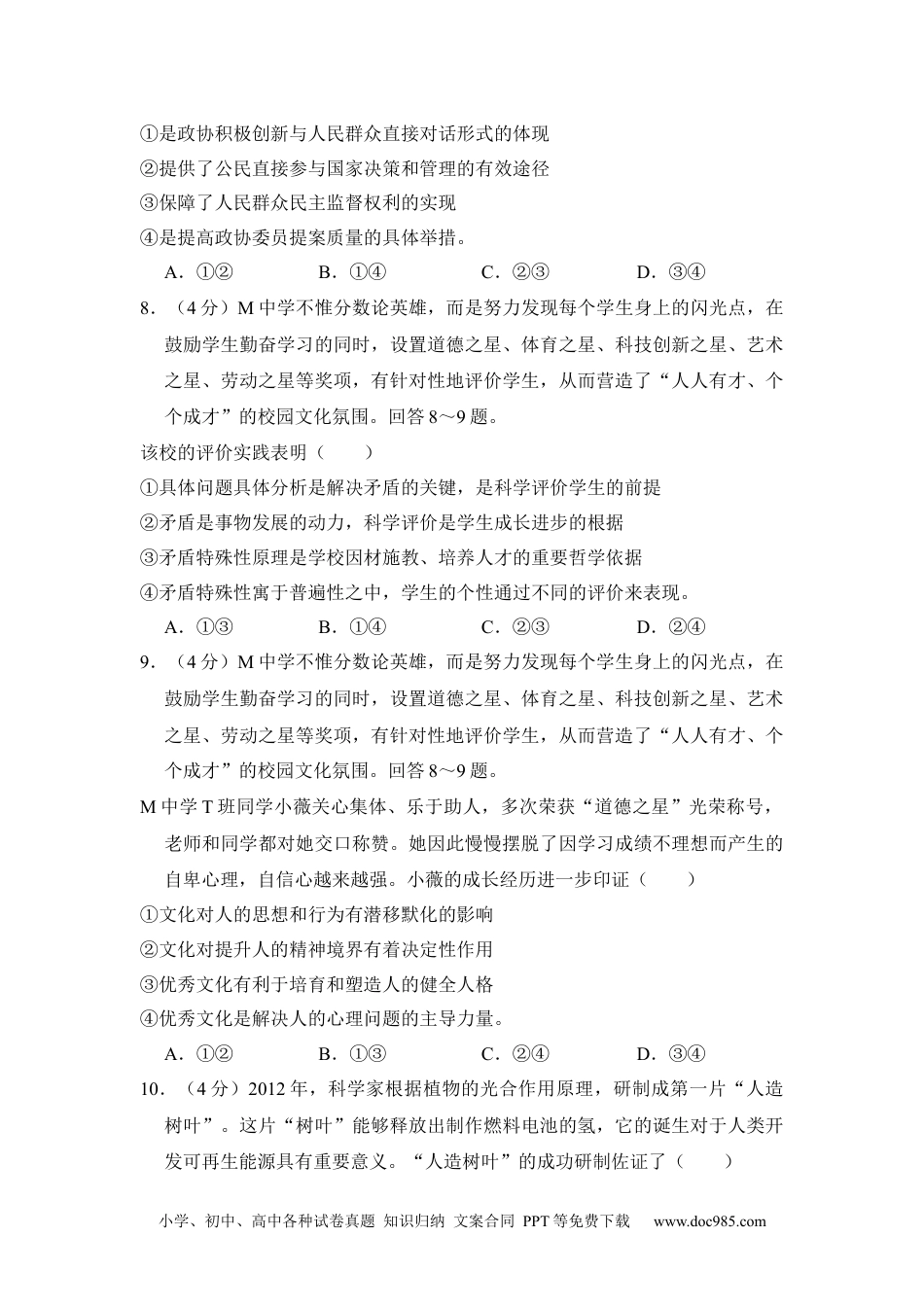 小学、初中、高中各种试卷真题知识归纳文案合同PPT等免费下载www.doc985.com2013年全国高考政治试卷(新课标Ⅰ)一、选择题1.(4分)2012年,某县农民种植的土豆产量大增,但市场没有相应扩大,农民不得不低价销售,收入不增反降。图中的①②③④中,能够反映这种“丰产不丰收”经济现象的是()A.①B.②C.③D.④2.(4分)中国H公司与美国某公司签订服装出口合同,约定服装单价为24美元,一年后交货。H公司生产一件服装的成本是144人民币元。签订合同时汇率为1美元=6.32人民币元,交货时为1美元=6.27人民币元。在不考虑其他条件的情况下,H公司交货时的利润率比签约时的利润率()A.下降0.83%B.下降0.76%C.上升0.83%D.上升0.76%3.(4分)2012年3月,中国某集团公司收购了4个在美国的风电场。美国政府于9月28日以安全为由签发行政命令禁止该项目的收购。在多次申诉无效之后,该公司根据美国法律向美国联邦法院提起诉讼。这一案例表明()A.走出去的中国企业面临各种形式的贸易保护主义的挑战B.向投资国司法部门提起诉讼是投资者维护自身利益的最有效手段C.对外直接投资取代商品出口成为中国企业走出去的主要形式小学、初中、高中各种试卷真题知识归纳文案合同PPT等免费下载www.doc985.comD.跨国并购是企业强强联合的主要表现形式4.(4分)2011年我国城乡居民人民币储蓄存款余额达35.2万亿元,人均储蓄25548元,分别比2010年增长16%和15.3%,高于同期GDP的增长速度。根据上述事实可以推断出()①社会保障体系不断健全增加了人们储蓄意愿②我国居民的储蓄率随GDP的增长而增长③我国居民投资理财的渠道比较狭窄、品种较少④我国城乡居民的恩格尔系数不断下降。A.①②B.①③C.②④D.③④5.(4分)十一届全国人大常委会第二十三次会议修改通过新的居民身份证法,规定在居民身份证登记项目中增加指纹信息,同时加大对泄露公民个人信息行为的惩罚力度。身份证法的这些修改()①扩大了对公民权利的保护范围②有利于提高社会管理和服务水平③体现了权利与义务相统一的原则④是坚持依法行政的必要保证。A.①②B.①④C.②③D.③④6.(4分)2012年初,国务院下发《关于实行最严格水资源管理制度的意见》,明确了严格控制用水总量、用水效率、入河湖排水总量的“三条红线”,将水资源开发、利用、节约和保护的主要指标纳入地方经济社会发展综合评价体系,建立水资源管理责任和考核制度。这些规定()①提高了政府水资源管理的决策效率②强化了地方政府水资源管理的职能③约束了地方政府管理水资源的权限④强化了水资源管理的政府责任。A.①②B.①③C.②④D.③④7.(4分)2012年全国政协会议期间,来自网民的部分意见和建议入选全国政协提案征集函,并以“参阅线索”的形式发给了全体政协委员作为参考。部分网民还应邀参观政协提案办理流程,旁听提案办理协商会。上述做法()小学、初中、高中各种试卷真题知识归纳文案合同PPT等免费下载www.doc985.com①是政协积极创新与人民群众直接对话形式的体现②提供了公民直接参与国家决策和管理的有效途径③保障了人民群众民主监督权利的实现④是提高政协委员提案质量的具体举措。A.①②B.①④C.②③D.③④8.(4分)M中学不惟分数论英雄,而是努力发现每个学生身上的闪光点,在鼓励学生勤奋学习的同时,设置道德之星、体育之星、科技创新之星、艺术之星、劳动之星等奖项,有针对性地评价学生,从而营造了“人人有才、个个成才”的校园文化氛围。回答8~9题。该校的评价实践表明()①具体问题具体分析是解决矛盾的关键,是科学评价学生的前提②矛盾是事物发展的动力,科学评价是学生成长进步的根据③矛盾特殊性原理是学校因材施教、培养人才的重要哲学依据④矛盾特殊性寓于普遍性之中,学生的个性通过不同的评价来表现。A.①③B.①④C.②③D.②④9.(4分)M中学不惟分数论英雄,而是努力发现每个学生身上的闪光点,在鼓励学生勤奋学习的同时,设置道德之星、体育之星、科技创新之星、艺术之星、劳动之星等奖项,有针对性地评价学生,从而营造了“人人有才、个个成才”的校园文化氛围。回答8~9题。M中学T班同...