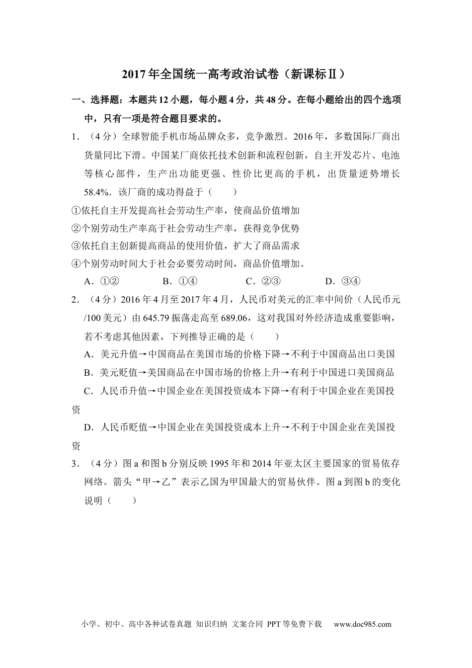 小学、初中、高中各种试卷真题知识归纳文案合同PPT等免费下载www.doc985.com2017年全国统一高考政治试卷(新课标Ⅱ)一、选择题:本题共12小题,每小题4分,共48分。在每小题给出的四个选项中,只有一项是符合题目要求的。1.(4分)全球智能手机市场品牌众多,竞争激烈。2016年,多数国际厂商出货量同比下滑。中国某厂商依托技术创新和流程创新,自主开发芯片、电池等核心部件,生产出功能更强、性价比更高的手机,出货量逆势增长58.4%.该厂商的成功得益于()①依托自主开发提高社会劳动生产率,使商品价值增加②个别劳动生产率高于社会劳动生产率,获得竞争优势③依托自主创新提高商品的使用价值,扩大了商品需求④个别劳动时间大于社会必要劳动时间,商品价值增加。A.①②B.①④C.②③D.③④2.(4分)2016年4月至2017年4月,人民币对美元的汇率中间价(人民币元/100美元)由645.79振荡走高至689.06,这对我国对外经济造成重要影响,若不考虑其他因素,下列推导正确的是()A.美元升值→中国商品在美国市场的价格下降→不利于中国商品出口美国B.美元贬值→美国商品在中国市场的价格上升→有利于中国进口美国商品C.人民币升值→中国企业在美国投资成本下降→有利于中国企业在美国投资D.人民币贬值→中国企业在美国投资成本上升→不利于中国企业在美国投资3.(4分)图a和图b分别反映1995年和2014年亚太区主要国家的贸易依存网络。箭头“甲→乙”表示乙国为甲国最大的贸易伙伴。图a到图b的变化说明()小学、初中、高中各种试卷真题知识归纳文案合同PPT等免费下载www.doc985.com①中国逐步成为亚太地区的贸易中心②亚洲区域内贸易在全球贸易中的作用日益突出③日本与亚太国家之间的相互依赖相互联系增强④国际贸易从多边贸易为主向双边贸易为主转变。A.①②B.①④C.②③D.③④4.(4分)2016年7月国务院印发《关于推动中央企业结构调整与重组的指导意见》,明确下一阶段央企改革的重点工作:巩固加强一批、创新发展一批、重组整合一批、清理退出一批。新一轮央企改革的目的在于()①推动资源整合,实现国有资本的优化配置②增强央企活力,不断提高国有经济的控制力和影响力③促进央企强强联合,提高国有经济在国民经济中的比重④完善我国生产资料所有制,巩固公有制经济的主导地位。A.①②B.①④C.②③D.③④5.(4分)某地为治理村委会公章管理不严、随意乱盖章现象,将村委会公章存到乡镇政府“柜子”里,由乡镇政府“代管”。这一做法受到社会质疑而被叫停。叫停“村章乡管”的主要理由在于()①乡镇政府承担了过多的行政管理事务②乡镇政府没有管理农村公共事务的职能③乡镇政府不能代行村委会的自我管理权④应当维护基层群众性自治组织的民主权利。A.①②B.①④C.②③D.③④6.(4分)2017年4月,中共中央、国务院决定设立河北雄安新区。这是以习近平同志为核心的党中央深入推进实施京津冀协同发展战略、积极稳妥有序疏解北京非首都功能作出的一项重大决策部署。设立雄安新区是()小学、初中、高中各种试卷真题知识归纳文案合同PPT等免费下载www.doc985.com①党中央治国理政新理念新思想战略的重大实践②深化体制机制改革,促进全面发展的制度创新③党和政府全心全意为人民服务宗旨的重要体现④推进我国行政区划全面改革与调整的重要举措。A.①②B.①③C.②④D.③④7.(4分)某社区有汉、回、白、彝、傣等二十多个民族居住。每逢民族节日,各族群众都一起欢庆,“同过民族节,众筹百家宴”。在泼水节大家到民族团结广场相互泼水祈福,在火把节组织篝火晚会一起载歌载舞,在开斋节一起吃馓子、油香……该社区各族群众同过民族节()①是各民族实现共同繁荣的有效途径②体现了平等团结互助和谐的民族关系③实现了多民族地区社区组织的自我完善④是各民族相互尊重、文化交融的生动写照。A.①②B.①③C.②④D.③④8.(4分)近年来,大批中国游客到俄罗斯参观“阿芙乐尔”号巡洋舰、斯莫尔尼宫、列宁墓等,感受俄罗斯红色文化的魅力。同时,毛泽东故居等中国红色旅游项目越来越受到俄罗斯人的喜爱。中俄两国之间红色旅游发展得益于两国的红色...