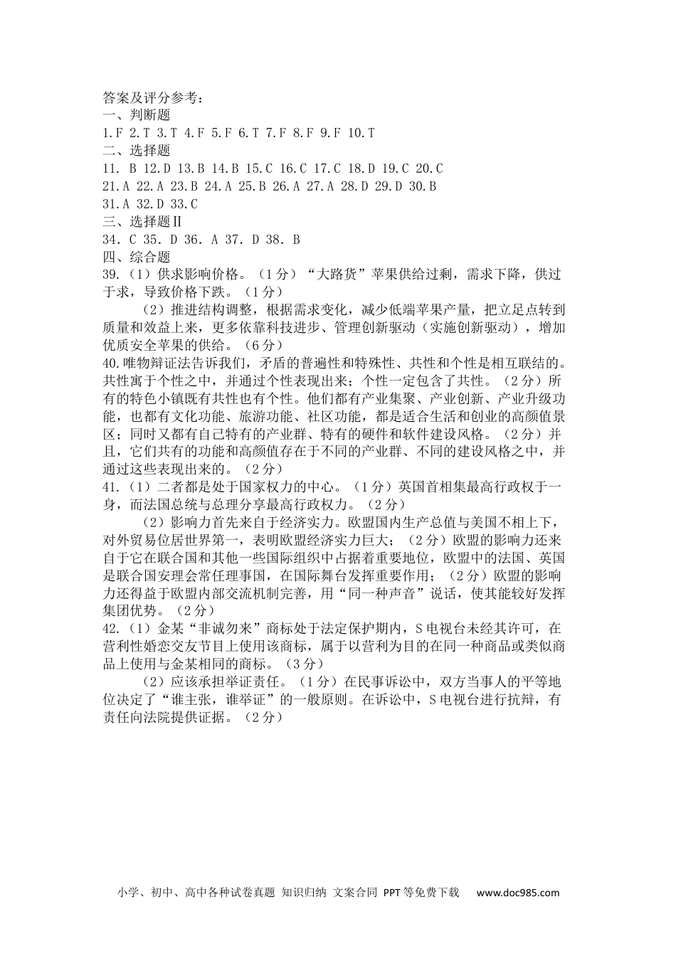 小学、初中、高中各种试卷真题知识归纳文案合同PPT等免费下载www.doc985.com答案及评分参考:一、判断题1.F2.T3.T4.F5.F6.T7.F8.F9.F10.T二、选择题11.B12.D13.B14.B15.C16.C17.C18.D19.C20.C21.A22.A23.B24.A25.B26.A27.A28.D29.D30.B31.A32.D33.C三、选择题Ⅱ34.C35.D36.A37.D38.B四、综合题39.(1)供求影响价格。(1分)“大路货”苹果供给过剩,需求下降,供过于求,导致价格下跌。(1分)(2)推进结构调整,根据需求变化,减少低端苹果产量,把立足点转到质量和效益上来,更多依靠科技进步、管理创新驱动(实施创新驱动),增加优质安全苹果的供给。(6分)40.唯物辩证法告诉我们,矛盾的普遍性和特殊性、共性和个性是相互联结的。共性寓于个性之中,并通过个性表现出来;个性一定包含了共性。(2分)所有的特色小镇既有共性也有个性。他们都有产业集聚、产业创新、产业升级功能,也都有文化功能、旅游功能、社区功能,都是适合生活和创业的高颜值景区;同时又都有自己特有的产业群、特有的硬件和软件建设风格。(2分)并且,它们共有的功能和高颜值存在于不同的产业群、不同的建设风格之中,并通过这些表现出来的。(2分)41.(1)二者都是处于国家权力的中心。(1分)英国首相集最高行政权于一身,而法国总统与总理分享最高行政权力。(2分)(2)影响力首先来自于经济实力。欧盟国内生产总值与美国不相上下,对外贸易位居世界第一,表明欧盟经济实力巨大;(2分)欧盟的影响力还来自于它在联合国和其他一些国际组织中占据着重要地位,欧盟中的法国、英国是联合国安理会常任理事国,在国际舞台发挥重要作用;(2分)欧盟的影响力还得益于欧盟内部交流机制完善,用“同一种声音”说话,使其能较好发挥集团优势。(2分)42.(1)金某“非诚勿来”商标处于法定保护期内,S电视台未经其许可,在营利性婚恋交友节目上使用该商标,属于以营利为目的在同一种商品或类似商品上使用与金某相同的商标。(3分)(2)应该承担举证责任。(1分)在民事诉讼中,双方当事人的平等地位决定了“谁主张,谁举证”的一般原则。在诉讼中,S电视台进行抗辩,有责任向法院提供证据。(2分)
