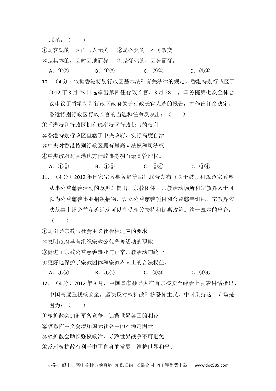 小学、初中、高中各种试卷真题知识归纳文案合同PPT等免费下载www.doc985.com2013年全国高考政治试卷(大纲版)一、选择题(共12小题,每小题4分,满分48分)1.(4分)假设某国M产品只由甲、乙两家企业提供,售价为10元,2011年,甲企业生产500万件,乙企业生产400万件。2012年,甲乙企业的劳动生产率都提高一倍,在其他条件不变的情况下,M产品的价格和社会总价值分别是()A.5元9000万元B.10元9000万元C.5元18000万元D.10元18000万元2.(4分)人们在经济往来中经常使用信用工具进行结算。下列情景中,一般采用汇票结算的是()A.某人支付网络购物货款800元B.某企业支付外地供应商货款200000元C.某人支付本地酒店服务费10000元D.某培训机构支付本地专家劳务费5000元3.(4分)近年来,受市场需求不振、原材料价格上涨的影响,我国某著名蔗糖企业的利润率一起在3%左右的低位徘徊。为提高利润率,该企业可采取的措施有:()①调整产品结构,增加高附加值蔗糖产品产量②优化管理流程,降低蔗糖生产成本③提高蔗糖价格,抵消原材料价格上涨影响④发行企业债券,扩大蔗糖生产规模。A.①②B.①③C.②④D.③④4.(4分)全国中小企业股份转让系统的建立,可以()A.提高非上市公司经营业绩B.优化非上市公司组织结构C.降低非上市公司管理费用D.拓宽非上市公司融资渠道5.(4分)国务院批准建立全国中小企业股份转让系统,是政府:()①提供社会公共服务职能的体现②组织经济建设职能的体现③提高依法行政水平的举措④完善资本市场体系的举措。A.①②B.①③C.②④D.③④小学、初中、高中各种试卷真题知识归纳文案合同PPT等免费下载www.doc985.com6.(4分)某村在保护当地民族文化的同时,不断挖掘、开发民族文化资源,把一个普通的少数民族村寒建设成为一个生动展示少数民族生活善的“博物馆”和著名的旅游景区。民族文化资源的开发带动了当地经济的发展,村民的生活水平大幅度提高。从唯物主义观点看,该村取得成功的原因在于:()①因地制宜,将文化保护与文化资源开发结合起来②将客观条件与发展目标一起作为工作的出发点③发挥主观能动性,超越客观条件和规律的制约④根据规律发生作用的条件和形式正确利用规律。A.①②B.①④C.②③D.③④7.(4分)“四十年来画竹枝,日间挥写夜间思。冗繁削尽留清瘦,画到生时是熟时。”郑板桥这首《画竹诗》形象地描述了他画竹从“冗繁”到“清瘦”、从忠实描摹到表现竹子独特精神的艺术升华过程。这表明艺术创作:()①是对对象的再现与创造相统一的过程②是把艺术观念转变为现实艺术作品的根本途径③具有与物质生产实践同样的规律与特点④是按照创作者的意图改造对象世界的观念活动。A.①②B.①③C.②④D.③④8.(4分)毛泽东说:“邀集一堆人,不作调查,而只是冥思苦索‘想办法’‘打主意’,须知这是一定不能想出什么好办法,打出什么好主意的。”这段话蕴含的哲学道理是:()①感性认识比理性认识更真实更可靠②占有大量可靠的感性材料是形成“好主意”的前提条件③实践是认识的来源和认识发展的根本动力④冥思苦索无助于“好办法”、“好主意”的产生。A.①②B.①④C.②③D.③④9.(4分)18世纪的产业革命开启了人类社会工业化历程,许多国家通过工业化,极大地促进了经济增长,同时也产生了环境污染等生态问题。有学者据此把工业化比喻为一把双刃剑。从唯物辩证法看,工业化与环境污染之间的小学、初中、高中各种试卷真题知识归纳文案合同PPT等免费下载www.doc985.com联系:()①是客观的,因而与人无关②是必然的,不可改变③是具体的,因时因地而异④是变化的,因势而变。A.①②B.①③C.②④D.③④10.(4分)依据香港特别行政区基本法和有关法律的规定,香港特别行政区于2012年3月25日选举出第四任行政长官。3月28日,国务院第七次全体会议审议了香港特别行政区政府关于行政长官人选的报告,并作出任命决定。香港特别行政区行政长官的当选和任命反映出:()①香港特别行政区拥有选举特区行政长官的权利②香港特别行政区直辖于中央政府,实行高度自治③中央对香港特别行政区拥有最高立法...