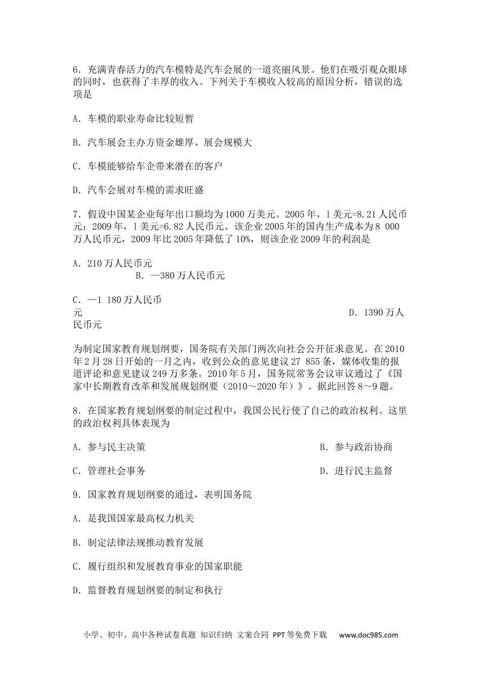 小学、初中、高中各种试卷真题知识归纳文案合同PPT等免费下载www.doc985.com2010年高校招生全国统一考试政治(海南卷)2010年海南高考真题政治注意事项:1.本试卷分第1卷(选择题)和第Ⅱ卷(非选择题)两部分。答卷前,考生务必将自己的姓名、准考证号填写在答题卡上。2.回答第I卷时,选出每小题答案后,用铅笔把答题卡上对应题目的答案标号涂黑。如需改动,用橡皮擦干净后,再选涂其它答案标号。写在本试卷上无效。3.回答第Ⅱ卷时,将答案写在答题卡上。写在本试卷上无效。4.考试结束后,将本试卷和答题卡一并交回。第I卷本卷共22小题,每小题2分,在每小题给出的四个选项中,只有一项是符合题目要求的。1.各具优势的甲、乙两家公司,通过协议进行资源整合,取得了良好的经济效益。下列行为属于资源整合的是①甲公司利用乙公司的生产技术力量,投资新项目②甲公司通过资本市场出售乙公司股份,获得高额利润③乙公司把自有资产抵押给银行,用贷款来购买新生产线④乙公司产品通过甲公司的销售网络迅速进入全球市场A.①②B.②③C.①④D.②④2.某工业园注重生态环境建设,将钢铁、化工、装备制造三大产业有效链接,资源循环使用,成为集港口、商品集散地和重工业基地于一体的风光旖旎的生态新城,走出了一条新型工业化之路。这一事例说明小学、初中、高中各种试卷真题知识归纳文案合同PPT等免费下载www.doc985.comA.新型工业化注重工业和环境协调发展B.新型工业化强调重化工业优先发展C.新型工业化强调产业集群发展D.新型工业化实现了在资源枯竭条件下的可持续发展3.价格变化会引起需求量的变动,但不同商品的需求量对价格变动的反应程度是不同的。下列命题正确反映这一原理的是A.中高档轿车需求量对其价格变动的反应程度较小B.食盐需求量对其价格变动的反应程度较大C.家庭煤气需求量减少的幅度大于价格上升的幅度D.品牌服饰需求量增加的幅度大于价格下降的幅度4.王女士近日欲购一套住房。在提交个人贷款申请后不久,银行工作人员告诉她,因她的信用卡账户有数次逾期还款的记录,银行将提高她的住房贷款利率。这表明①个人信用状况决定房贷利率②信用是人们不可忽视的无形资产③信用卡的使用导致了个人信用风险④银行可通过利率杠杆规避信贷风险A.①②B.②③C.①④D.②④5.投资、消费和出口被称为拉动经济增长的“三驾马车”。据统计,2008年发达国家的消费占GDP的66%以上,而中国只有36%左右。因此,刺激消费成为推动中国经济持续发展的有效措施之一。在通货膨胀的压力下,刺激消费增长最恰当的措施是A.降低银行存贷款利率B.提高税率C.增加社会保障支出D.发行国债小学、初中、高中各种试卷真题知识归纳文案合同PPT等免费下载www.doc985.com6.充满青春活力的汽车模特是汽车会展的一道亮丽风景。他们在吸引观众眼球的同时,也获得了丰厚的收入。下列关于车模收入较高的原因分析,错误的选项是A.车模的职业寿命比较短暂B.汽车展会主办方资金雄厚、展会规模大C.车模能够给车企带来潜在的客户D.汽车会展对车模的需求旺盛7.假设中国某企业每年出口额均为1000万美元。2005年,l美元=8.21人民币元;2009年,l美元=6.82人民币元。该企业2005年的国内生产成本为8000万人民币元,2009年比2005年降低了10%,则该企业2009年的利润是A.210万人民币元B.—380万人民币元C.—1180万人民币元D.1390万人民币元为制定国家教育规划纲要,国务院有关部门两次向社会公开征求意见。在2010年2月28日开始的一月之内,收到公众的意见建议27855条,媒体收集的报道评论和意见建议249万多条。2010年5月,国务院常务会议审议通过了《国家中长期教育改革和发展规划纲要(2010~2020年)》。据此回答8~9题。8.在国家教育规划纲要的制定过程中,我国公民行使了自己的政治权利。这里的政治权利具体表现为A.参与民主决策B.参与政治协商C.管理社会事务D.进行民主监督9.国家教育规划纲要的通过,表明国务院A.是我国国家最高权力机关B.制定法律法规推动教育发展C.履行组织和发展教育事业的国家职能D.监督教育规划纲要的制定和执行小学、初中、高中各种试卷真题知识归纳文案合...
