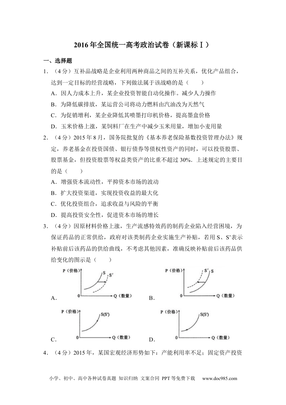 小学、初中、高中各种试卷真题知识归纳文案合同PPT等免费下载www.doc985.com2016年全国统一高考政治试卷(新课标Ⅰ)一、选择题1.(4分)互补品战略是企业利用两种商品之间的互补关系,优化产品组合,达到一定目标的经营战略,下列做法属于该战略的是()A.因人力成本上升,某企业投资智能自动化操作。减少人力操作B.为降低碳排放,某运营公司将动力燃料由汽油改为天然气C.为促销增利,某企业降低其喷墨打印机价格,提高墨盒价格D.玉米价格上涨,某饲料厂在生产中减少玉米用量,增加小麦用量2.(4分)2015年8月,国务院批复的《基本养老保险基数投资管理办法》规定,养老基金在投资国债、银行债券等债权性资产的同时,可以投资股票、股票基金,但投资股票等权益类资产的比重不超过30%.上述规定的主要目的是()A.增强资本流动性,平抑资本市场的波动B.扩大投资渠道,实现投资收益的最大化C.优化投资组合,追求收益与风险的平衡D.提高投资安全性,促进资本市场的增长3.(4分)因原材料价格上涨,生产流感特效药的制药企业陷入经营困境,为保证药品的正常供给,政府对该类制药企业实施生产补贴,若用S、S’表示补贴前后该药品的供给曲线,不考虑其他因素,准确反映补贴前后该药品供给变化的图示是()A.B.C.D.4.(4分)2015年,某国宏观经济形势如下:产能利用率不足;固定资产投资小学、初中、高中各种试卷真题知识归纳文案合同PPT等免费下载www.doc985.com同比下降4.0%;居民消费价格指数(CPI)增幅从2.5%下跌至1%,低于国际公认的合理值3%.据此,预防通货紧缩成为关注的焦点。若不考虑其他因素,可能引发通货紧缩的传导路径是()①产能过剩→工业品供过于求→工业品价格走低→企业利润下滑②消费低迷→消费品供过于求→消费品价格走低③社会总供给大于社会总需求→物价总水平持续下跌④企业投资萎缩→失业率上升→居民收入下降。A.①→④→②→③B.④→①→③→②C.①→③→④→②D.④→②→①→③5.(4分)某市规定,对下派社区的工作事务,实行清单管理:属于各部门、街道办事处职责范围内的事项,不得转嫁给社区:需要社区协助的事项,应当为社区提供必要的经费和工作条件。这一规定()①彰显了社区组织的自治功能②创新了社区组织管理形式③有利于推进社区居民的自我管理④旨在提高基层政府行政效率。A.①③B.①④C.②③D.③④6.(4分)根据十二届全国人大常委会第十六次会议通过的全国人大常委会关于特赦部分服刑罪犯的决定,国家主席习近平2015年8月29日签署特赦令,对参加过抗日战争、解放战争等四类服刑罪犯实行特赦,特赦令指出,对符合特赦条件的服刑罪犯,经人民法院依法作出裁定后,予以释放,决定特赦部分服刑罪犯的权力属于()A.国家主席B.全国人大常委会C.人民法院D.中央人民政府7.(4分)为落实全面依法治国要求,我国采取一系列举措推动民族语言和汉语双语法官的培养。例如。截至2015年,在全国范围内建立了藏汉双语法官培训师资库和5个培训基地,西藏自治区有兼通藏汉双语的法官199名,约占全国总数的62%.为民族地区培养民汉书双语法官有利于()①民族地区各级法院变通执行国家法律②保障民族地区公民的基本权利和诉讼权利小学、初中、高中各种试卷真题知识归纳文案合同PPT等免费下载www.doc985.com③民族地区各民族的相互沟通和团结④确定民族语言作为民族自治机关公务语言的地位。A.①②B.①④C.②③D.③④8.(4分)陕西省地方戏“华阴老腔”是国家非物质文化遗产,声腔刚直高亢、磅礴豪迈,却因表现形式单调难以吸引观众,面临传承危机。2016年,华阴老腔演出团队与摇滚歌手与合作,将传统民族音乐与现代摇滚音乐相结合,在中央电视台春节联欢晚会联袂演唱《华阴老腔一声喊》,引起巨大反响。“华阴老腔”焕发新的生机给我们的启示有()①优秀传统文化只有不断创新才能更好地传承和发展②满足人民大众需要的优秀传统文化才有强大的生命力③与现代流行文化融合是优秀传统文化创新的根本途径④传播手段与传播形式的创新是优秀传统文化传承的前提。A.①②B.①④C.②③D.③④9.(4分)习近平强调,要从推动科...