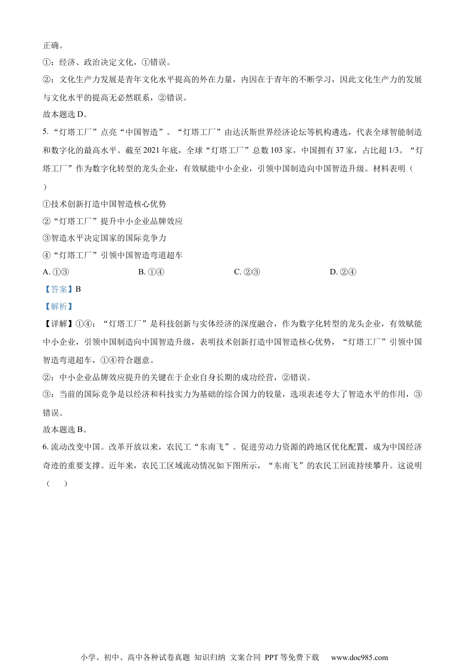 小学、初中、高中各种试卷真题知识归纳文案合同PPT等免费下载www.doc985.com2022年重庆市普通高中学业水平选择性考试思想政治一、单项选择题:本题共15小题,每小题3分,共45分。在每小题给出的四个选项中,只有一项是最符合题目要求的。少年强、青年强,则中国强。阅读材料,完成下列小题。1.小计划大民生。2011年国务院启动“农村义务教育学生营养改善计划”,农村学生每天膳食补贴3元。截至2020年底,营养改善计划覆盖13.16万所学校3797.83万名学生,受益学生的体质健康合格率从2012年的70.3%提高至86.7%,在此基础上,这些学生身高、体重和学习成绩均有明显增长。该财政补贴计划()①促进社会公平与效率②体现发展成果由人民共享的理念③保障国民经济平稳运行④表明财政政策是资源配置主导手段A.①②B.①④C.②③D.③④2.《2020年全国未成年人互联网使用情况研究报告》显示,我国6~18岁未成年人互联网普及率为94.9%,远高于成年群体,科学研究表明,未成年人正处于脑发育关键时期,长期沉溺网络可能造成脑功能损害,脑神经元的功能连接强化在虚拟世界,对现实世界的认知能力削弱。由此可知()A.未成年人沉溺网络与脑功能损害之间是一种主观联系B.未成年人的脑健康发育是认知能力和水平提升的基础C.未成年人对网络的正确认知只有通过长期网络实践才能形成D.互联网普及率远高于成年人,说明未成年人更易于接受新事物3.一颗法治的种子在青少年心中生根发芽。针对未成年人保护法修订草案,全国人大常委会法工委上海虹桥街道立法联系点向当地某中学学生征集意见。该校学生提出的意见被吸收采纳。同学们通过参与立法意见征集,体验了一堂生动的“法治实践课”。参与立法意见征集()A.是中学生应当履行的政治义务B.有助于培养中学生的民主法治意识C.是中学生行使基本民主权利的体现D.表明中学生是国家立法职权的承担者4.想去哪里去哪里,想看什么有什么。受益图书馆、博物馆、美术馆等公共文化设施的不断完善,青年享受的公共文化服务水平显著提高。与此同时,图书、电影、文艺演出等传统文化产业和数字创意新兴文化产业迅猛发展,青年所需所盼的文化产品日渐丰富,文化视野更加开阔,精神品位不断提升。由此可见()小学、初中、高中各种试卷真题知识归纳文案合同PPT等免费下载www.doc985.com①精神文化生活空间决定社会文化发展水平②文化生产力发展,促进青年人文化水平提高③青年人真正所需所盼的文化是健康有益的文化④对文化的多样化需求,提升了青年人精神文化品位A.①②B.①④C.②③D.③④【答案】1.A2.B3.B4.D【解析】【1题详解】①②:通过实施财政补贴的“农村义务教育学生营养改善计划”使学生的体质健康合格率提高,身高、体重和学习成绩均有明显增长,说明该财政补贴计划提高了农村学生生活水平,促进了社会公平与效率,并体现发展成果由人民共享的理念,①②正确。③:促进国民经济平稳运行是指在经济增长滞缓或过热时运用财政政策保持社会总供给与总需求的基本平衡,材料强调的是财政补贴农村学生膳食,③不符合题意。④:市场经济条件下资源配置的主要手段为市场,④错误。故本题选A。【2题详解】A:由材料信息可知,未成年人沉溺网络与脑功能损害之间是一种客观联系,且联系具有客观性,A错误。B:人脑是意识的生理基础,未成年人的脑健康发育是认知能力和水平提升的基础,B正确。C:获得认知的途径既包括学习书本知识,也包括实践,C错误。D:新事物是指符合客观规律、具有强大生命力和远大发展前途的事物,网络不是新事物,且材料强调的是未成年人长期沉溺网络可能造成脑功能损害,而不是未成年人更容易接受新事物,D排除。故本题选B。【3题详解】B:基层立法联系点向中学生征集意见有助于法治中国建设,有助于培养学生的民主法治意识,B符合题意。A:学生参与立法意见征集是行使参与权,是在行使权利,而不是履行义务,A不符合题意。C:公民的基本民主权利是选举权和被选举权,材料未涉及,C排除。D:国家立法职权的承担者是全国人民代表大会及其常务委员会,D错误。故本题选B。【4题详解】③:为人民大众所喜闻乐见的社会主义文化是健康有益的,③正确。④...