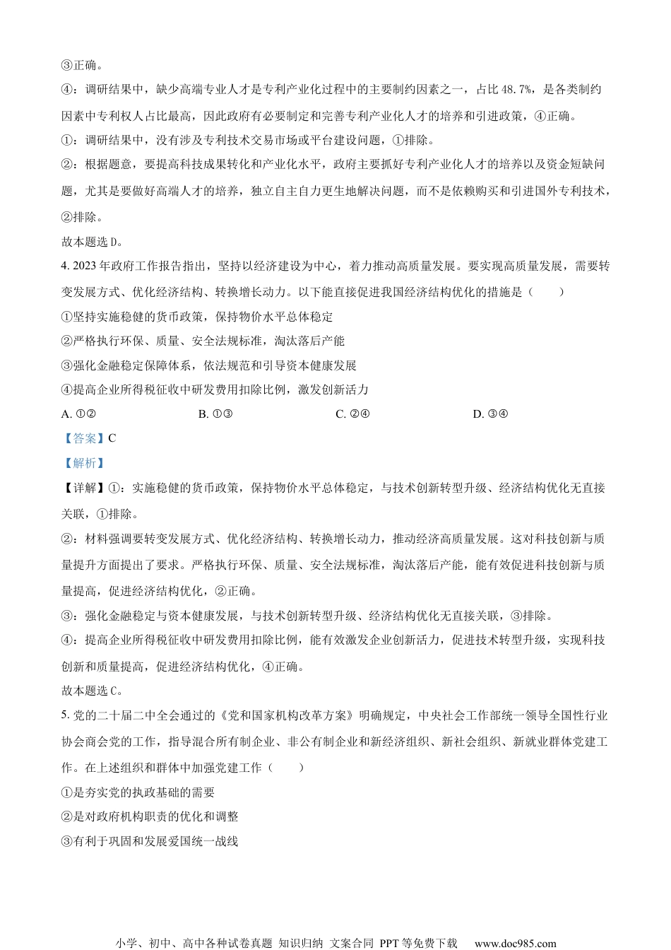 小学、初中、高中各种试卷真题知识归纳文案合同PPT等免费下载www.doc985.com绝密★启用前2023年普通高等学校招生全国统一考试(新课标卷)文科综合思想政治学科一、选择题。1.马克思和恩格斯共同创立了科学社会主义,实现了社会主义从空想到科学的伟大飞跃。科学社会主义之所以是科学,是因为它()①对未来的共产主义社会进行了原则性描述②对现存的资本主义社会进行了深刻的批判③以唯物史观和剩余价值学说为理论基础④找到了实现人类解放的社会力量和正确道路A.①②B.①③C.②④D.③④【答案】D【解析】【详解】③④:科学社会主义之所以科学,是因为它以唯物史观和剩余价值学说为理论基石,揭示了人类社会的一般规律和资本主义运行的特殊规律,找到了无产阶级这一实现人类解放的社会力量,指明了实现人类彻底解放的正确道路,这也是科学社会主义超越空想社会主义的地方。③④符合题意。①②:空想社会主义也对资本主义社会进行了深刻的批判,对未来共产主义社会的图景进行了勾画,但他们主张阶级调和,反对阶级斗争,看不到广大人民群众特别是无产阶级的力量,没有找到社会变革的正确途径,因此这两个选项不能表明科学社会主义相对于空想社会主义的进步性,即不能说明其科学性,①②与题意不符。故本题选D。2.党的二十大报告强调,继续推进实践基础上的理论创新,首先要把握好新时代中国特色社会主义思想的世界观和方法论,坚持好、运用好贯穿其中的立场观点方法。必须坚持人民至上,必须坚持自信自立,必须坚持守正创新,必须坚持问题导向,必须坚持系统观念,必须坚持胸怀天下。“六个必须坚持”()①是新时代继续推进理论创新的科学方法②实现了马克思主义中国化时代化新的飞跃③是对中国之问、世界之问、人民之问、时代之问的系统回答④是深刻领会习近平新时代中国特色社会主义思想必须把握的基本点A.①②B.①④C.②③D.③④小学、初中、高中各种试卷真题知识归纳文案合同PPT等免费下载www.doc985.com【答案】B【解析】【详解】①④:“六个必须坚持”是新时代继续推进理论创新的科学方法,是深刻理解习近平新时代中国特色社会主义思想必须牢牢把握的基本点,也是继续推进理论创新必须始终坚持的基本点,①④符合题意。②:习近平新时代中国特色社会主义思想是当代中国马克思主义,实现了马克思主义中国化新的飞跃。“六个必须坚持”并没有实现马克思主义中国化时代化新的飞跃,该选项夸大了“六个必须坚持”的地位和作用,②排除。③:习近平新时代中国特色社会主义思想是对中国之问,世界之问,是人民之问,时代之问的系统回答,③与题意不符。故本题选B。3.2022年,国家知识产权局对全国20余个省(区、市)1万多个专利权人开展专利产业化过程中的主要制约因素专题调研。调研结果见图。根据调研结果,要提高科技成果转化和产业化水平,政府应将重心放在()①加强专利技术交易市场或平台建设②激励企业购买和引进国外专利技术③吸纳社会资本、建设科研成果转化试验基地④制定和完善专利产业化人才的培养和引进政策A.①②B.①④C.②③D.③④【答案】D【解析】【详解】③:调研结果中,缺乏资金设备或场地是专利产业化过程中的主要制约因素之一,占比42.5%,是各类制约因素中专利权人占比居第二位,因此政府有必要吸纳社会资本、建设科研成果转化试验基地,小学、初中、高中各种试卷真题知识归纳文案合同PPT等免费下载www.doc985.com③正确。④:调研结果中,缺少高端专业人才是专利产业化过程中的主要制约因素之一,占比48.7%,是各类制约因素中专利权人占比最高,因此政府有必要制定和完善专利产业化人才的培养和引进政策,④正确。①:调研结果中,没有涉及专利技术交易市场或平台建设问题,①排除。②:根据题意,要提高科技成果转化和产业化水平,政府主要抓好专利产业化人才的培养以及资金短缺问题,尤其是要做好高端人才的培养,独立自主自力更生地解决问题,而不是依赖购买和引进国外专利技术,②排除。故本题选D。4.2023年政府工作报告指出,坚持以经济建设为中心,着力推动高质量发展。要实现高质量发展,需要转变发展方式、优化经济结构、转换增长动力。以下能...