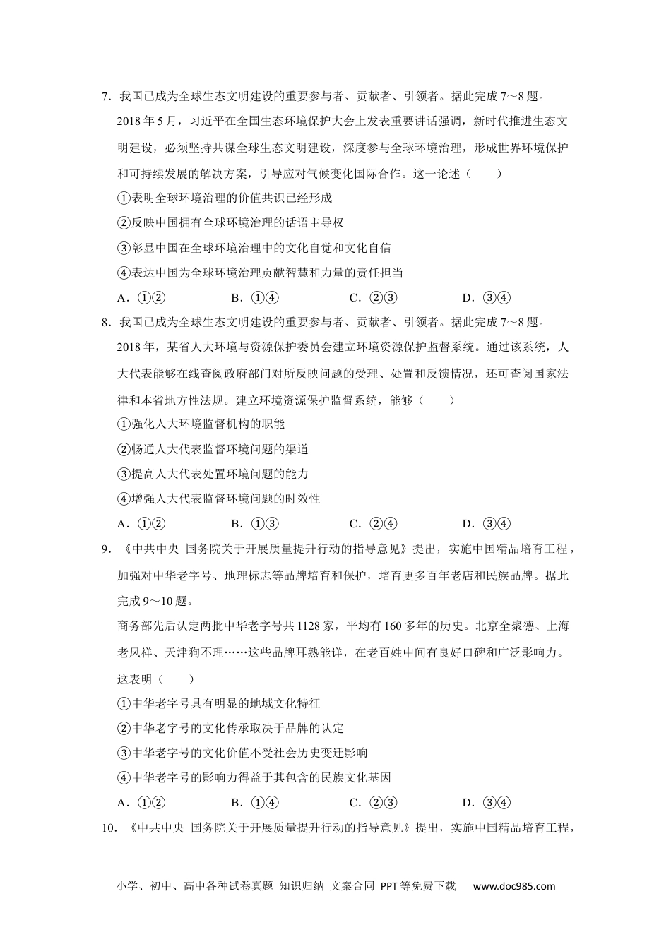 小学、初中、高中各种试卷真题知识归纳文案合同PPT等免费下载www.doc985.com2019年全国统一高考政治试卷(新课标Ⅲ)一、选择题(共10小题,每小题4分,共48分。在每小题给出的四个选项中,只有一项是符合题目要求的。)1.(4分)某家国有企业集团进行混合所有制改革,向上下游知名民营企业出让29.8%的股权和部分董事席位,吸纳资金33.6亿元。这有利于该企业()①改善治理结构,提高企业管理水平②控制上下游企业,实现一体化经营③调整资本结构,降低企业经营风险④激发企业活力,促进资本保值增值A.①②B.①④C.②③D.③④2.(4分)2012~2018年间甲国对乙国服务贸易出口变化如图所示。促成这一变化的经济现象有()①乙国吸引甲国的游客数量逐年增长②乙国在甲国的留学生人数不断增加③乙国出口到甲国的文化产品日趋丰富④乙国向甲国支付的知识产权费用持续上升A.①②B.①③C.②④D.③④3.(4分)2019年2月,中共中央、国务院印发《粤港澳大湾区发展规划纲要》。对推动粤港澳大湾区发展,建设世界级城市群做出重大战略部署。粤港澳大湾区位于“一带一路”的交汇点,具有“一个国家、两种制度、三个关区”的特点。从产业结构看,港澳地区以金融、信息技术等现代服务业为主,广东九个城市以生产制造为主。关于打造粤小学、初中、高中各种试卷真题知识归纳文案合同PPT等免费下载www.doc985.com港澳大湾区的重大意义,下列判断中不恰当的是()A.促进产业转型升级,实现中国东中西区域协调发展B.丰富“一国两制”实践内涵,进一步密切内地与港澳交流合作C.推进供给侧结构性改革,加快培育发展新动能、实现创新驱动发展D.建立与国际接轨的开放型经济新体制,建设高水平参与国际经济合作新平台4.(4分)某国是铁矿石、石油等大宗商品(以美元计价)的进口国。当美元指数持续上涨时,该国面临通货膨胀的压力。不考虑其他因素的影响,这一传导过程是()①进口原材料成本上升②居民消费价格上涨③生产者出厂价格上涨④生产者购进价格上涨A.①→④→③→②B.①→④→②→③C.④→①→③→②D.④→①→②→③5.(4分)2018年,西藏自治区开始实施以“神圣国土守护者、幸福家园建设者”为主题的乡村振兴工程,将边民脱贫致富和守边固边相结合,补齐基础设施和公共服务的短板,加快边境地区发展。边疆民族地区实施乡村振兴工程()①是充分发挥民族地区资源优势的要求②保障了自治区少数民族人民的自治权③是保证边防安全、维护国家统一的重要举措④有利于实现共同富裕,激发各族人民的爱国热情A.①②B.①③C.②④D.③④6.(4分)目前,上海合作组织共有8个成员国、4个观察员国、6个对话伙伴,同联合国等国际和地区组织建立了广泛的合作关系;其成员国的经济和人口总量分别约占全球的20%和40%.在2018年青岛峰会上,上海合作组织共通过23份安全、经济、人文等领域合作文件。上海合作组织是()①横跨欧亚大陆的地区性国家联盟②推动经济全球化深入发展的主导力量③维护地区及全球安全稳定的重要因素④坚持开放包容、促进互利合作的多边机制A.①②B.①④C.②③D.③④小学、初中、高中各种试卷真题知识归纳文案合同PPT等免费下载www.doc985.com7.我国已成为全球生态文明建设的重要参与者、贡献者、引领者。据此完成7~8题。2018年5月,习近平在全国生态环境保护大会上发表重要讲话强调,新时代推进生态文明建设,必须坚持共谋全球生态文明建设,深度参与全球环境治理,形成世界环境保护和可持续发展的解决方案,引导应对气候变化国际合作。这一论述()①表明全球环境治理的价值共识已经形成②反映中国拥有全球环境治理的话语主导权③彰显中国在全球环境治理中的文化自觉和文化自信④表达中国为全球环境治理贡献智慧和力量的责任担当A.①②B.①④C.②③D.③④8.我国已成为全球生态文明建设的重要参与者、贡献者、引领者。据此完成7~8题。2018年,某省人大环境与资源保护委员会建立环境资源保护监督系统。通过该系统,人大代表能够在线查阅政府部门对所反映问题的受理、处置和反馈情况,还可查阅国家法律和本省地方性法规。建立环境资源保护监督系统,能...