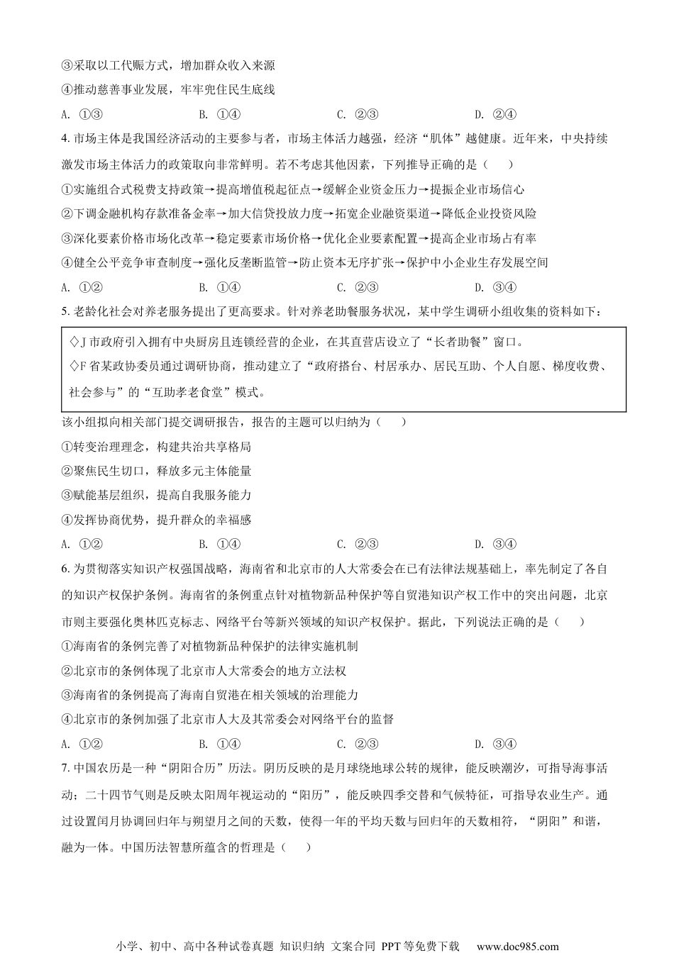 小学、初中、高中各种试卷真题知识归纳文案合同PPT等免费下载www.doc985.com山东省2022年普通高中学业水平等级考试思想政治注意事项:1.答卷前,考生务必将自己的姓名、考生号等填写在答题卡和试卷指定位置。2.回答选择题时,选出每小题答案后,用铅笔把答题卡上对应题目的答案标号涂黑。如需改动,用橡皮擦干净后,再选涂其他答案标号。回答非选择题时,将答案写在答题卡上。写在本试卷上无效。3.考试结束后,将本试卷和答题卡一并交回。一、选择题:本题共15小题,每小题3分,共45分。每小题只有一个选项符合题目要求。1.马克思认为,在未来的社会主义制度中,社会生产力的发展将如此迅速,生产将以所有人的富裕为目的。习近平指出,共同富裕是全体人民共同富裕,是人民群众物质生活和精神生活都富裕,不是少数人的富裕,也不是整齐划一的平均主义。关于共同富裕,下列理解正确的是()A.消除社会基本矛盾是实现共同富裕的必由之路B.建设高福利国家是实现共同富裕的根本路径C.促进共同富裕和促进人的全面发展是高度统一的D.共同富裕会随社会生产力的迅速发展而自发实现2.在从“0”到“1”的原始创新成果孵化期,企业迫切需要资本支持,但因投资风险高,融资困难。某省探索出以“国有资本战略投资”撬动社会资本、共同服务创新企业发展的新路,通过产业政策和国有资本投资,解决了科技企业初创期社会资本不愿投、不敢投的问题,在前瞻性战略性产业“育种育苗”,由此培育出了一大批高科技企业。该省做法取得成功的原因在于,国有资本()①投资前瞻性战略性产业增强了国有经济的控制力②服务创新企业发展弥补了市场追求短期利益的缺陷③通过撬动社会资本推动了国有企业混合所有制改革④通过战略投资推动了有效市场和有为政府更好结合A.①③B.①④C.②③D.②④3.2022年山东省新设40万个城乡公益性岗位,对就业困难人员予以托底安置。政府在社区设置日间照料中心服务等公共服务类公益岗、网格员等公共管理类公益岗,按照不低于当地小时最低工资标准发放岗位补贴。政府通过设置公益性岗位()①挖掘更多就业潜力,落实好保就业目标②丰富社会救助形式,满足群众保障诉求小学、初中、高中各种试卷真题知识归纳文案合同PPT等免费下载www.doc985.com③采取以工代赈方式,增加群众收入来源④推动慈善事业发展,牢牢兜住民生底线A.①③B.①④C.②③D.②④4.市场主体是我国经济活动的主要参与者,市场主体活力越强,经济“肌体”越健康。近年来,中央持续激发市场主体活力的政策取向非常鲜明。若不考虑其他因素,下列推导正确的是()①实施组合式税费支持政策→提高增值税起征点→缓解企业资金压力→提振企业市场信心②下调金融机构存款准备金率→加大信贷投放力度→拓宽企业融资渠道→降低企业投资风险③深化要素价格市场化改革→稳定要素市场价格→优化企业要素配置→提高企业市场占有率④健全公平竞争审查制度→强化反垄断监管→防止资本无序扩张→保护中小企业生存发展空间A.①②B.①④C.②③D.③④5.老龄化社会对养老服务提出了更高要求。针对养老助餐服务状况,某中学生调研小组收集的资料如下:♢J市政府引入拥有中央厨房且连锁经营的企业,在其直营店设立了“长者助餐”窗口。♢F省某政协委员通过调研协商,推动建立了“政府搭台、村居承办、居民互助、个人自愿、梯度收费、社会参与”的“互助孝老食堂”模式。该小组拟向相关部门提交调研报告,报告的主题可以归纳为()①转变治理理念,构建共治共享格局②聚焦民生切口,释放多元主体能量③赋能基层组织,提高自我服务能力④发挥协商优势,提升群众的幸福感A.①②B.①④C.②③D.③④6.为贯彻落实知识产权强国战略,海南省和北京市的人大常委会在已有法律法规基础上,率先制定了各自的知识产权保护条例。海南省的条例重点针对植物新品种保护等自贸港知识产权工作中的突出问题,北京市则主要强化奥林匹克标志、网络平台等新兴领域的知识产权保护。据此,下列说法正确的是()①海南省的条例完善了对植物新品种保护的法律实施机制②北京市的条例体现了北京市人大常委会的地方立法权③海南省的条例提高了海南自贸港在相关领域的治...