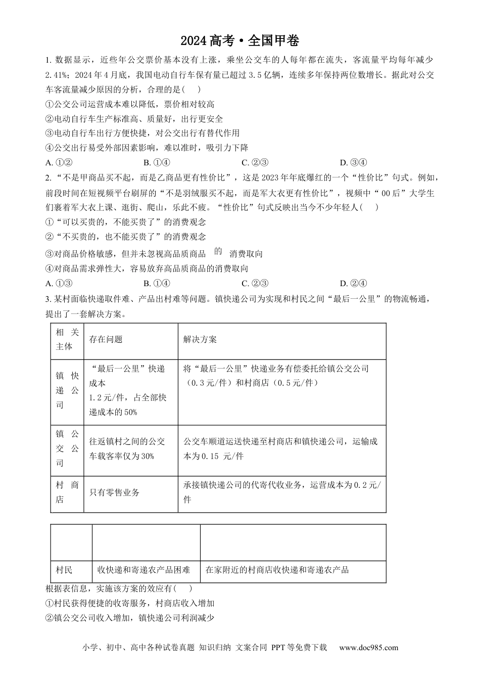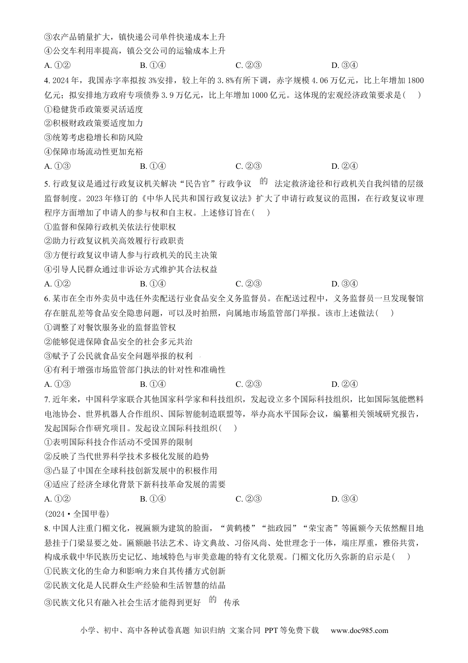 小学、初中、高中各种试卷真题知识归纳文案合同PPT等免费下载www.doc985.com2024高考·全国甲卷1.数据显示,近些年公交票价基本没有上涨,乘坐公交车的人每年都在流失,客流量平均每年减少2.41%;2024年4月底,我国电动自行车保有量已超过3.5亿辆,连续多年保持两位数增长。据此对公交车客流量减少原因的分析,合理的是()①公交公司运营成本难以降低,票价相对较高②电动自行车生产标准高、质量好,出行更安全③电动自行车出行方便快捷,对公交出行有替代作用④公交出行易受外部因素影响,难以准时,吸引力下降A.①②B.①④C.②③D.③④2.“不是甲商品买不起,而是乙商品更有性价比”,这是2023年年底爆红的一个“性价比”句式。例如,前段时间在短视频平台刷屏的“不是羽绒服买不起,而是军大衣更有性价比”,视频中“00后”大学生们裹着军大衣上课、逛街、爬山,乐此不疲。“性价比”句式反映出当今不少年轻人()①“可以买贵的,不能买贵了”的消费观念②“不买贵的,也不能买贵了”的消费观念③对商品价格敏感,但并未忽视高品质商品消费取向④对商品需求弹性大,容易放弃高品质商品的消费取向A.①③B.①④C.②③D.②④3.某村面临快递取件难、产品出村难等问题。镇快递公司为实现和村民之间“最后一公里”的物流畅通,提出了一套解决方案。相关主体存在问题解决方案镇快递公司“最后一公里”快递成本1.2元/件,占全部快递成本的50%将“最后一公里”快递业务有偿委托给镇公交公司(0.3元/件)和村商店(0.5元/件)镇公交公司往返镇村之间的公交车载客率仅为30%公交车顺道运送快递至村商店和镇快递公司,运输成本为0.15元/件村商店只有零售业务承接镇快递公司的代寄代收业务,运营成本为0.2元/件村民收快递和寄递农产品困难在家附近的村商店收快递和寄递农产品根据表信息,实施该方案的效应有()①村民获得便捷的收寄服务,村商店收入增加②镇公交公司收入增加,镇快递公司利润减少小学、初中、高中各种试卷真题知识归纳文案合同PPT等免费下载www.doc985.com③农产品销量扩大,镇快递公司单件快递成本上升④公交车利用率提高,镇公交公司的运输成本上升A.①②B.①④C.②③D.③④4.2024年,我国赤字率拟按3%安排,较上年的3.8%有所下调,赤字规模4.06万亿元,比上年增加1800亿元;拟安排地方政府专项债券3.9万亿元,比上年增加1000亿元。这体现的宏观经济政策要求是()①稳健货币政策要灵活适度②积极财政政策要适度加力③统筹考虑稳增长和防风险④保障市场流动性更加充裕A.①③B.①④C.②③D.②④5.行政复议是通过行政复议机关解决“民告官”行政争议法定救济途径和行政机关自我纠错的层级监督制度。2023年修订的《中华人民共和国行政复议法》扩大了申请行政复议的范围,在行政复议审理程序方面增加了申请人的参与权和自主权。上述修订旨在()①监督和保障行政机关依法行使职权②助力行政复议机关高效履行行政职责③方便行政复议申请人参与行政机关的民主决策④引导人民群众通过非诉讼方式维护其合法权益A.①②B.①④C.②③D.③④6.某市在全市外卖员中选任外卖配送行业食品安全义务监督员。在配送过程中,义务监督员一旦发现餐馆存在脏乱差等食品安全隐患问题,可以及时拍照,向属地市场监管部门举报。该市上述做法()①调整了对餐饮服务业的监督监管权②能够促进保障食品安全的社会多元共治③赋予了公民就食品安全问题举报的权利④有利于增强市场监管部门执法的针对性和准确性A.①③B.①④C.②③D.②④7.近年来,中国科学家联合其他国家科学家和科技组织,发起设立多个国际科技组织,比如国际氢能燃料电池协会、世界机器人合作组织、国际智能制造联盟等,举办高水平国际会议,编纂相关领域研究报告,发起国际合作研究项目。发起设立国际科技组织()①表明国际科技合作活动不受国界的限制②反映了当代世界科学技术多极化发展的趋势③凸显了中国在全球科技创新发展中的积极作用④适应了经济全球化背景下新科技革命发展的需要A.①②B.①④C.②③D.③④(2024·全国甲卷)8.中国人注重门楣文化,视匾额为建筑的脸面,“黄鹤楼”“拙政园”“荣宝斋”等匾额今天依然醒目地悬挂于门梁显要之处...