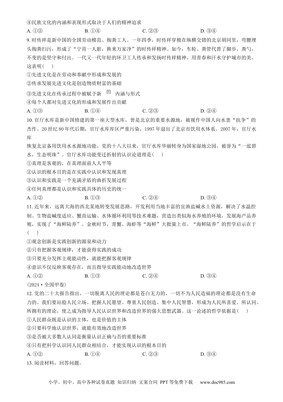 小学、初中、高中各种试卷真题知识归纳文案合同PPT等免费下载www.doc985.com2024高考·全国甲卷1.数据显示,近些年公交票价基本没有上涨,乘坐公交车的人每年都在流失,客流量平均每年减少2.41%;2024年4月底,我国电动自行车保有量已超过3.5亿辆,连续多年保持两位数增长。据此对公交车客流量减少原因的分析,合理的是()①公交公司运营成本难以降低,票价相对较高②电动自行车生产标准高、质量好,出行更安全③电动自行车出行方便快捷,对公交出行有替代作用④公交出行易受外部因素影响,难以准时,吸引力下降A.①②B.①④C.②③D.③④2.“不是甲商品买不起,而是乙商品更有性价比”,这是2023年年底爆红的一个“性价比”句式。例如,前段时间在短视频平台刷屏的“不是羽绒服买不起,而是军大衣更有性价比”,视频中“00后”大学生们裹着军大衣上课、逛街、爬山,乐此不疲。“性价比”句式反映出当今不少年轻人()①“可以买贵的,不能买贵了”的消费观念②“不买贵的,也不能买贵了”的消费观念③对商品价格敏感,但并未忽视高品质商品消费取向④对商品需求弹性大,容易放弃高品质商品的消费取向A.①③B.①④C.②③D.②④3.某村面临快递取件难、产品出村难等问题。镇快递公司为实现和村民之间“最后一公里”的物流畅通,提出了一套解决方案。相关主体存在问题解决方案镇快递公司“最后一公里”快递成本1.2元/件,占全部快递成本的50%将“最后一公里”快递业务有偿委托给镇公交公司(0.3元/件)和村商店(0.5元/件)镇公交公司往返镇村之间的公交车载客率仅为30%公交车顺道运送快递至村商店和镇快递公司,运输成本为0.15元/件村商店只有零售业务承接镇快递公司的代寄代收业务,运营成本为0.2元/件村民收快递和寄递农产品困难在家附近的村商店收快递和寄递农产品根据表信息,实施该方案的效应有()①村民获得便捷的收寄服务,村商店收入增加②镇公交公司收入增加,镇快递公司利润减少小学、初中、高中各种试卷真题知识归纳文案合同PPT等免费下载www.doc985.com③农产品销量扩大,镇快递公司单件快递成本上升④公交车利用率提高,镇公交公司的运输成本上升A.①②B.①④C.②③D.③④4.2024年,我国赤字率拟按3%安排,较上年的3.8%有所下调,赤字规模4.06万亿元,比上年增加1800亿元;拟安排地方政府专项债券3.9万亿元,比上年增加1000亿元。这体现的宏观经济政策要求是()①稳健货币政策要灵活适度②积极财政政策要适度加力③统筹考虑稳增长和防风险④保障市场流动性更加充裕A.①③B.①④C.②③D.②④5.行政复议是通过行政复议机关解决“民告官”行政争议法定救济途径和行政机关自我纠错的层级监督制度。2023年修订的《中华人民共和国行政复议法》扩大了申请行政复议的范围,在行政复议审理程序方面增加了申请人的参与权和自主权。上述修订旨在()①监督和保障行政机关依法行使职权②助力行政复议机关高效履行行政职责③方便行政复议申请人参与行政机关的民主决策④引导人民群众通过非诉讼方式维护其合法权益A.①②B.①④C.②③D.③④6.某市在全市外卖员中选任外卖配送行业食品安全义务监督员。在配送过程中,义务监督员一旦发现餐馆存在脏乱差等食品安全隐患问题,可以及时拍照,向属地市场监管部门举报。该市上述做法()①调整了对餐饮服务业的监督监管权②能够促进保障食品安全的社会多元共治③赋予了公民就食品安全问题举报的权利④有利于增强市场监管部门执法的针对性和准确性A.①③B.①④C.②③D.②④7.近年来,中国科学家联合其他国家科学家和科技组织,发起设立多个国际科技组织,比如国际氢能燃料电池协会、世界机器人合作组织、国际智能制造联盟等,举办高水平国际会议,编纂相关领域研究报告,发起国际合作研究项目。发起设立国际科技组织()①表明国际科技合作活动不受国界的限制②反映了当代世界科学技术多极化发展的趋势③凸显了中国在全球科技创新发展中的积极作用④适应了经济全球化背景下新科技革命发展的需要A.①②B.①④C.②③D.③④(2024·全国甲卷)8.中国人注重门楣文化,视匾额为建筑的脸面,“黄鹤楼”“拙政园”“荣宝斋”等匾额今天依然醒目地悬挂于门梁显要之处...