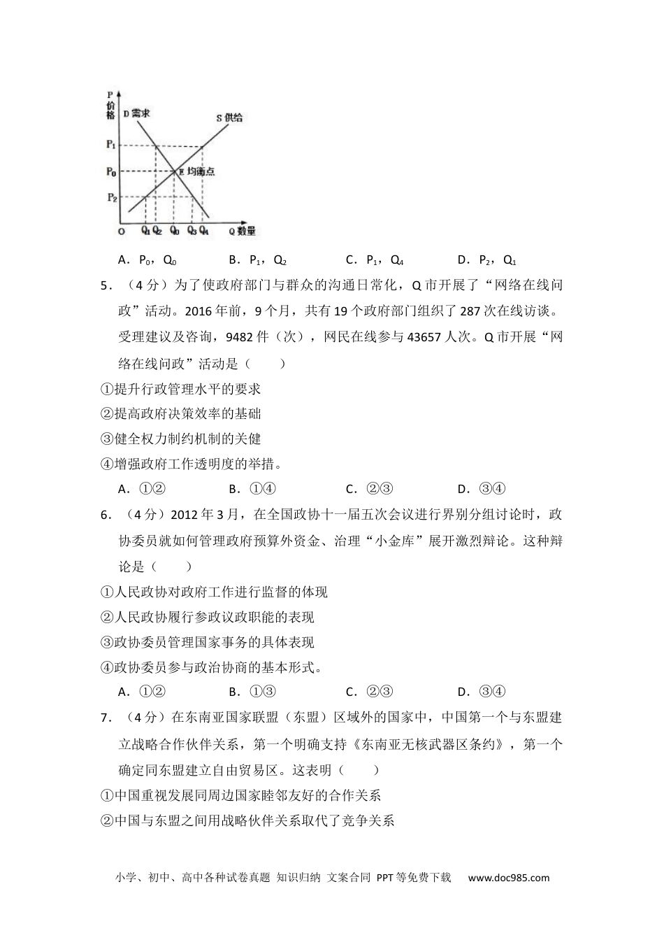 小学、初中、高中各种试卷真题知识归纳文案合同PPT等免费下载www.doc985.com2013年全国高考政治试卷(新课标Ⅱ)一、选择题1.(4分)财政政策是我国重要的宏观调控手段。2013年我国继续实施积极的财政政策,安排财政赤字1.2万亿元。在风险可控的前提下,适度的财政赤字可以()A.扩大社会总需求,促进经济增长B.减轻企业的税负,改善经济结构C.优化预算的结构,完善社会保障D.增加社会总供给,扩大居民消费2.(4分)近年来,智能手机市场的竞争日趋激烈。除传统手机制造商外,许多网络公司也纷纷斥资研发智能手机,并将内置其网络产品的智能手机推向市场。在下列选项中,能够解释“网络公司造手机”原因的是()A.生产智能手机的利润率高于其他行业B.网络公司的业务创新速度不断加快C.传统手机制造商生产智能手机能力不足D.网络公司延伸产业链提高综合竞争力3.(4分)当前我国农业补贴的重心已由流通环节向生产环节、由消费者向生产者转变,初步形成了支持价格、直接补贴和一般服务支特相结合的农业补贴模式。回答34﹣题。我国农业补贴重心转变的目的在于①增加农业生产者收入②优化农产品需求结构③缩小农产品供需缺口④稳定农产品市场供给()A.①③B.①④C.②③D.②④4.(4分)当前我国农业补贴的重心已由流通环节向生产环节、由消费者向生产者转变,初步形成了支持价格、直接补贴和一般服务支特相结合的农业补贴模式。回答34﹣题。支持价格是指一国为了支持农业的发展而对粮食等农产品所规定的最低收购价格。我国某农产品的需求曲线(D)和供给曲线(S)如图4所示。该产品的支持价格和供给数量分别为()小学、初中、高中各种试卷真题知识归纳文案合同PPT等免费下载www.doc985.comA.P0,Q0B.P1,Q2C.P1,Q4D.P2,Q15.(4分)为了使政府部门与群众的沟通日常化,Q市开展了“网络在线问政”活动。2016年前,9个月,共有19个政府部门组织了287次在线访谈。受理建议及咨询,9482件(次),网民在线参与43657人次。Q市开展“网络在线问政”活动是()①提升行政管理水平的要求②提高政府决策效率的基础③健全权力制约机制的关健④增强政府工作透明度的举措。A.①②B.①④C.②③D.③④6.(4分)2012年3月,在全国政协十一届五次会议进行界别分组讨论时,政协委员就如何管理政府预算外资金、治理“小金库”展开激烈辩论。这种辩论是()①人民政协对政府工作进行监督的体现②人民政协履行参政议政职能的表现③政协委员管理国家事务的具体表现④政协委员参与政治协商的基本形式。A.①②B.①③C.②③D.③④7.(4分)在东南亚国家联盟(东盟)区域外的国家中,中国第一个与东盟建立战略合作伙伴关系,第一个明确支持《东南亚无核武器区条约》,第一个确定同东盟建立自由贸易区。这表明()①中国重视发展同周边国家睦邻友好的合作关系②中国与东盟之间用战略伙伴关系取代了竞争关系小学、初中、高中各种试卷真题知识归纳文案合同PPT等免费下载www.doc985.com③中国与东盟之间的共同利益高于各国的自身利益④中国对地区的和平与发展事务发挥着建设性作用。A.①②B.①④C.②③D.③④8.(4分)《台湾风物图卷》长达320米,以生动的笔墨描绘了台湾的自然山川、民俗风土、人文环境等,被誉为宝岛的“清明上河图”。中国国民党主席在2005年访问大陆的“破冰之旅”时,将该图卷的缩小版作为礼物赠送给中国共产党领导人。《台湾风物图卷》在海峡两岸交流中扮演了重要的魅力()①展现了中华文化多姿多彩的魅力②反映了海峡两岸文化同根同源③具有与《清明上河图》相同的文化价值和艺术风格④是海峡两岸文化从差异走向统一的重要体现。A.①②B.①③C.②④D.③④9.(4分)联合国关于发展的观念经历了一个演变过程:20世纪五六十年代把发展归结为经济增长;20世纪70年代把发展看作是经济增长、经济结构优化和社会变革;从20世纪八九十年代开始,把发展理解为注重资源节约、环境保护的可持续发展和以人为中心的综合发展。联合国关于发展的观念演变进一步证实了()①认识的不断完善决定着实践的不断深化②认识受认识对象本质和属性暴露程度的制约③认识的发...