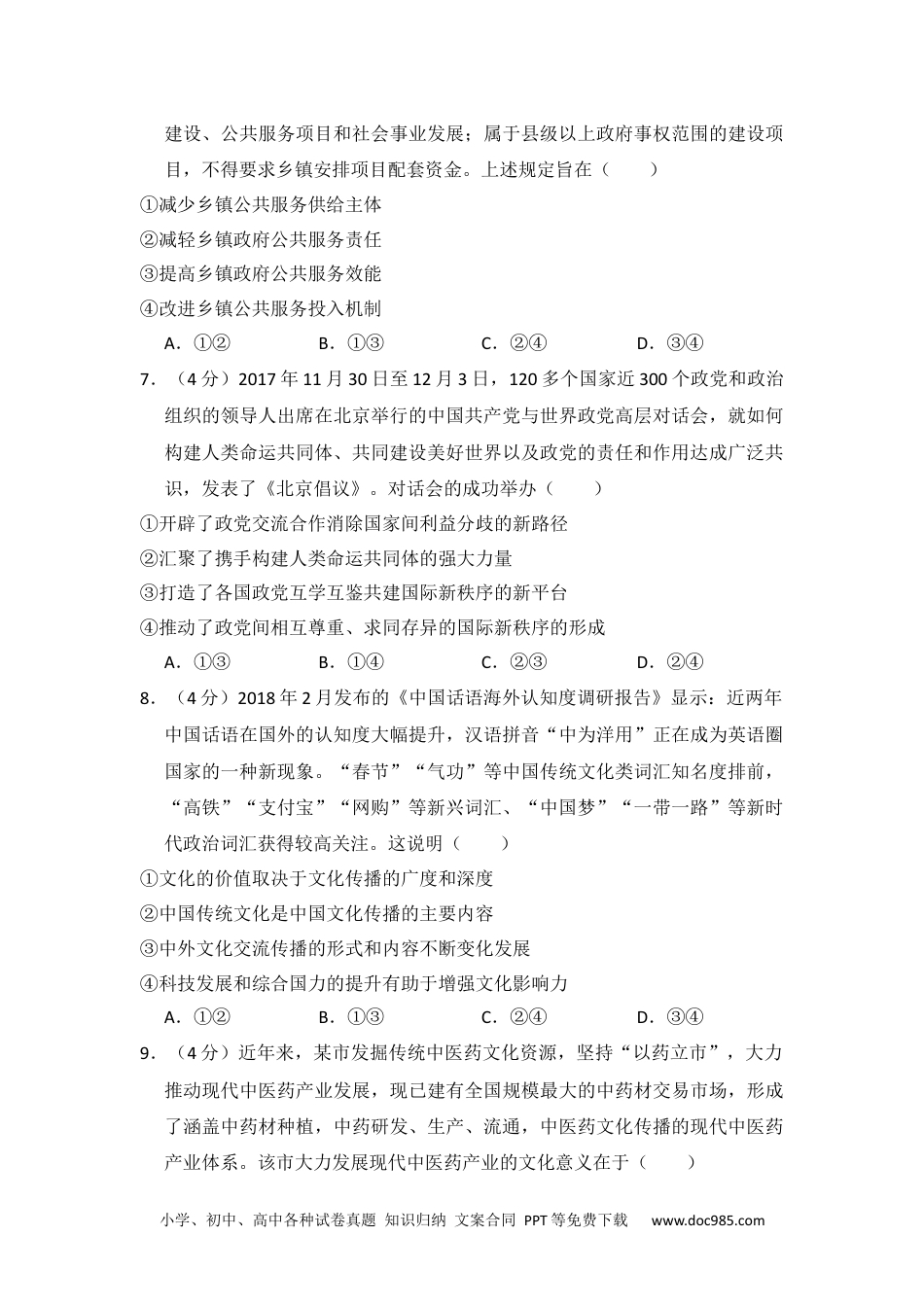 小学、初中、高中各种试卷真题知识归纳文案合同PPT等免费下载www.doc985.com2018年全国统一高考政治试卷(新课标Ⅰ)一、选择题:本题共12小题,每小题4分,共48分。在每小题给出的四个选项中,只有一项是符合题目要求的。1.(4分)根据马克思的劳动价值理论,如果生产某种商品的社会劳动生产率提高,在其他条件不变的情况下,与生产该商品相关的判断如表所示。序号社会必要劳动时间单位商品价值量商品数量商品价值总量①缩短降低增加不变②缩短降低增加增加③不变增加降低不变④不变降低增加增加其中正确的是()A.①B.②C.③D.④2.(4分)企业聚焦品牌管理和供应链管理,控制产品企划和营销网络,将“设计、生产、运输配送”环节外包,与供应商、加工商和物流企业建立联盟,通过联合开发产品、数据共享,加快市场反应速度。该模式体现的企业经营理念是()①整合上下游资源,实现优势互补②通过专业化分工,提高效率③通过兼并收购,扩大企业规模④增加市场份额,提高利润率A.①②B.①④C.②③D.③④3.(4分)我国快递业竞争日趋激烈,快递服务平均单价连续6年下滑,2017年降至12.37元。在此背景下,若其他条件不变,能引起快递市场供给曲线从S移动到S′(见图)的是()①放宽市场准入,吸引外商投资②工资成本上涨,管理费用增加③运用人工智能,提高劳动效率④网民人数上升,网购数量增加小学、初中、高中各种试卷真题知识归纳文案合同PPT等免费下载www.doc985.comA.①②B.①③C.②④D.③④4.(4分)我国2013~2017年消费和投资对经济增长贡献率如图所示。从图可以推断出()①经济结构在逐步转型升级②全社会资本形成总额逐年下降③消费在经济增长中的作用不断增强④经济增长逐渐由投资拉动转向消费拉动A.①②B.①③C.②④D.③④5.(4分)某市司法局为贯彻落实中央关于公共法律服务体系建设的决策部署,积极推进乡镇(街道)公共法律服务工作站(室)建设,整合乡镇(街道)和村居(社区)法律顾问、基层法律服务工作者和专职人民调解员等力量参与窗口接待,提供相关法律服务。上述做法()①促进了基层社会治理体制机制的进一步完善②维护了城乡居民平等享有公共法律服务的权益③提高了城乡居民参与社会公共事务管理的能力④推进了司法体制改革,有利于提高司法行政效率A.①②B.①③C.②④D.③④6.(4分)2017年2月,中共中央办公厅、国务院办公厅印发《关于加强乡镇政府服务能力建设的意见》,要求县级以上地方各级政府支持乡镇基础设施小学、初中、高中各种试卷真题知识归纳文案合同PPT等免费下载www.doc985.com建设、公共服务项目和社会事业发展;属于县级以上政府事权范围的建设项目,不得要求乡镇安排项目配套资金。上述规定旨在()①减少乡镇公共服务供给主体②减轻乡镇政府公共服务责任③提高乡镇政府公共服务效能④改进乡镇公共服务投入机制A.①②B.①③C.②④D.③④7.(4分)2017年11月30日至12月3日,120多个国家近300个政党和政治组织的领导人出席在北京举行的中国共产党与世界政党高层对话会,就如何构建人类命运共同体、共同建设美好世界以及政党的责任和作用达成广泛共识,发表了《北京倡议》。对话会的成功举办()①开辟了政党交流合作消除国家间利益分歧的新路径②汇聚了携手构建人类命运共同体的强大力量③打造了各国政党互学互鉴共建国际新秩序的新平台④推动了政党间相互尊重、求同存异的国际新秩序的形成A.①③B.①④C.②③D.②④8.(4分)2018年2月发布的《中国话语海外认知度调研报告》显示:近两年中国话语在国外的认知度大幅提升,汉语拼音“中为洋用”正在成为英语圈国家的一种新现象。“春节”“气功”等中国传统文化类词汇知名度排前,“高铁”“支付宝”“网购”等新兴词汇、“中国梦”“一带一路”等新时代政治词汇获得较高关注。这说明()①文化的价值取决于文化传播的广度和深度②中国传统文化是中国文化传播的主要内容③中外文化交流传播的形式和内容不断变化发展④科技发展和综合国力的提升有助于增强文化影响力A.①②B.①③C.②④D.③④9.(4分)近年来,某市发掘传统中医药文化资源,坚持...