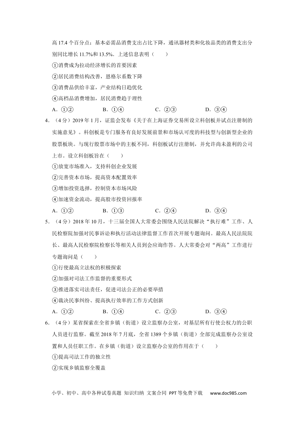 小学、初中、高中各种试卷真题知识归纳文案合同PPT等免费下载www.doc985.com2019年全国统一高考政治试卷(新课标Ⅱ)一、选择题:本题共11小题,每小题4分,共48分。在每小题给出的四个选项中,只有一项是符合题目要求的。1.(4分)某国生产新闻纸所需要的纸浆以固废纸为原料,消耗的固废纸20%以上依赖进口。出于环保需要,2019年该国开始限制固废纸进口。不考虑其他因素,正确反映短期内该国新闻纸价格变化的图示是(图中S表示供给,D表示需求)()A.B.C.D.2.(4分)为进一步加大对小微企业支持力度,财政部、国家税务总局发布通知,自2018年9月1日至2020年12月31日,对金融机构向小型企业、微利企业和个体工商户发放小额贷款取得的利息收入,免征增值税。该税收政策发挥作用的路径是()①激发小微企业的经营活力②缓解小微企业的融资困难③引导金融机构对小微企业放贷④改变金融机构税收负担预期⑤降低金融机构的贷款利率A.①→②→④→③B.④→③→②→①C.②→③→①→⑤D.⑤→③→②→①3.(4分)2018年,全国居民人均消费支出19853元,同比增长6.2%;全国社会消费品零售总额同比增长9.0%;最终消费支出对国内生产总值增长的贡献率为76.2%,比上年提小学、初中、高中各种试卷真题知识归纳文案合同PPT等免费下载www.doc985.com高17.4个百分点;基本必需品消费支出占比下降,通讯器材类和化妆品类的消费支出分别同比增长11.7%和13.5%.上述信息表明()①消费成为拉动经济增长的首要因素②居民消费结构改善,恩格尔系数下降③消费品供给丰富,产业结构日趋优化④高档品消费增加,居民消费趋于理性A.①②B.①④C.②③D.③④4.(4分)2019年1月,证监会发布《关于在上海证券交易所设立科创板并试点注册制的实施意见》。科创板是专门服务有良好发展前景和市场认可度的科技型与创新型企业的股票板块。与现行股票市场中的主板不同,科创板试行注册制,并允许尚未盈利的公司上市。设立科创板旨在()①放宽市场准入,支持科创企业发展②完善资本市场,提高资本配置效率③增加投资选择,控制资本市场风险④加速资金流动,提高股市投资回报率A.①②B.①③C.②④D.③④5.(4分)2018年10月,十三届全国人大常委会围绕人民法院解决“执行难”工作、人民检察院加强对民事诉讼和执行活动法律监督工作首次开展专题询问。最高人民法院院长、最高人民检察院检察长等相关人员到会应询作答。人大常委会对“两高”工作进行专题询问是()①行使最高立法权的积极探索②加强对司法工作监督的重要形式③推进落实司法责任,促进司法公正的必要举措④裁决民事纠纷、提高执行效率的工作方式创新A.①②B.①④C.②③D.③④6.(4分)某省探索在全省乡镇(街道)设立监察办公室,对基层所有行使公权力的公职人员进行监察。截至2018年7月底,全省1389个乡镇(街道)全部完成监察办公室设置和人员任职工作。在乡镇(街道)设立监察办公室的作用在于()①提高司法工作的独立性②实现乡镇监察全覆盖小学、初中、高中各种试卷真题知识归纳文案合同PPT等免费下载www.doc985.com③完善基层政府组织结构④防止基层公权力滥用A.①②B.①③C.②④D.③④7.(4分)2018年11月,国家主席习近平在亚太经合组织工商领导人峰会上发表主旨演讲指出,无论是冷战、热战还是贸易战,都不会有真正赢家。这一论断反映我国主张()①处理国际事务必须符合世界多极化发展趋势②国际组织在解决国际争端中必须维护国家主权③国家间交往必须顺应世界和平与发展的历史潮流④在相互依存的当今世界应该摒弃弱肉强食的思维A.①②B.①③C.②④D.③④8.(4分)2019年3月23日,在两国领导人共同见证下,中国和意大利双方代表交换关于中国流失文物艺术品返还的证书。返还的796件(套)文物,有马家窑文化红陶罐、汉代茧形壶、唐代武士立俑、宋代黑釉瓷……是承载民族记忆的宝贵遗产。流失文物返还中国的启示是()①保护文化遗产需要世界各国共同努力②尊重文化多样性就要尊重各民族文化③保护文化遗产是文化传承发展的根本动力④保持文化多样性是促进不同文化相互融合的重要途径A.①②B.①③C.②④D...