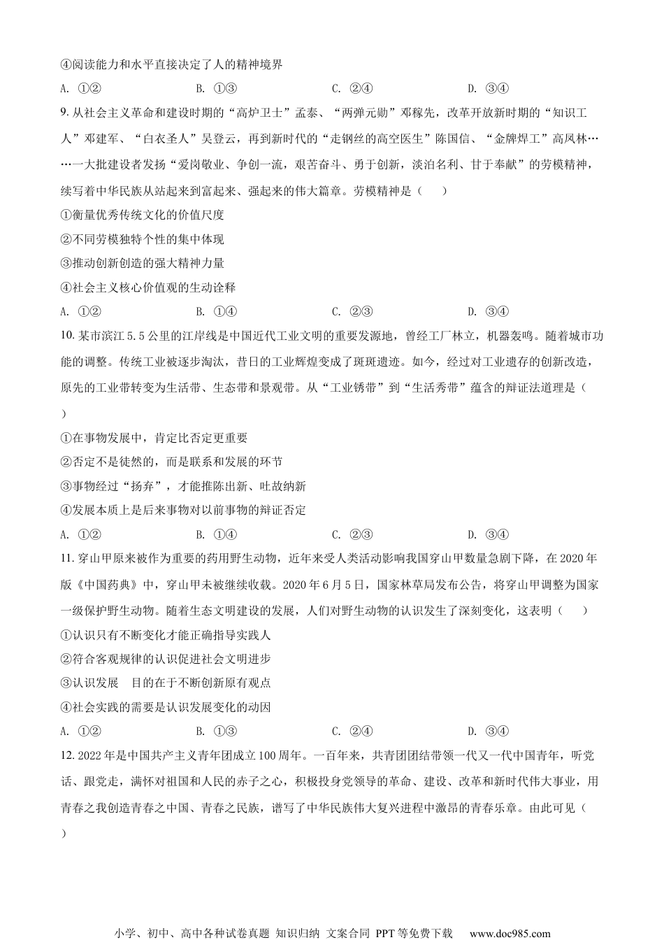 小学、初中、高中各种试卷真题知识归纳文案合同PPT等免费下载www.doc985.com2022年全国乙卷高考政治试题一、选择题。1.2022年中央一号文件明确要求:适当提高稻谷、小麦最低收购价,健全农民种粮收益保障机制;在黄淮海、西北、西南地区推广玉米大豆带状复合种植,在东北地区开展粮豆轮作,在长江流域开发冬闲田扩种油菜。这是为了()①保护农民种粮积极性,稳定粮食产量②发挥市场决定作用,有效配置农业资源③优化农作物种植结构,更好满足市场需求④扩大农作物种植面积,实现农产品自给自足A.①③B.①④C.②③D.②④2.2022年,我国在企业所得税征收中加大研发费用加计扣除政策实施力度,将科技型中小企业加计扣除比例从75%提高到100%[实际扣除费用=研发费用(1+加计扣除比例)],用税收优惠机制激励企业加大研发投入,培育壮大新动能。该机制的作用路径是()A.加大研发投入→减少扣除费用→少交所得税→增加净利润→扩大生产规模B.多计扣除费用→增大应税所得→多交所得税→增加国家税收→获得研发激励C.多计扣除费用→减少应税所得→少交所得税→增加净利润→加大研发投入D.加大研发投入→增强企业创新→降低生产费用→赢得竞争优势→扩大产品市场3.在美丽乡村建设行动中,某县深入实施城乡环卫一体化工程,配备环卫基础设施,招标引进专业环卫公司负责全县范围的污染水体治理。该县招标引进专业环卫公司的目的是()①发挥社会资本作用,增加公共产品供给②节约公共服务支出,缓解财政资金压力③引入市场竞争机制,提高公共服务效率④改善公共产品结构,增强地方经济实力A.①②B.①③C.②④D.③④4.2022年,我国财政赤字率(财政赤字/GDP)拟按2.8%左右安排,比2021年有所下调,但财政支出规模将比2021年扩大2万亿元以上。财政支出安排中,中央本级支出增长3.9%,中央对地方转移支付增长18%,更多资金纳入直达范围,以更好落实惠企利民政策。这表明我国()①坚持积极财政政策,支撑经济平稳运行②财政资金使用效率提高,财政收支缺口缩小③财政支出重结构调整,政策支持下沉基层④开始实行紧缩性财政政策,防范债务风险上升小学、初中、高中各种试卷真题知识归纳文案合同PPT等免费下载www.doc985.comA.①③B.①④C.②③D.②④5.某市构建社区党组织领导下的“网格一楼栋-单元”分级负责的社区治理组织架构网格长由社区专职工作人员担任,楼栋长和单元长从居民中选出。网格长牵头,定期组织楼栋长、单元长共同商议小区事务,梳理居民需求信息,化解居民矛盾,提出工作建议。“三长”联动机制()①通过共建共治共享激发基层治理活力②是完善基层行政管理体制的积极探索③有利于维护公民参与基层治理的民主权利④丰富了基层群众性自治组织的类型和职能A.①②B.①③C.②④D.③④6.2021年施行的《长江保护法》规定:国务院有关部门和长江流域省级人民政府负责落实国家长江流域协调机制的决策,按照职责分工负责长江保护相关工作。长江流域地方各级人民政府应当落实本行政区域的生态环境保护和修复、促进资源合理高效利用、优化产业结构和布局、维护长江流域生态安全的责任。上述规定()①表明各级政府在长江保护中具有同等的职责②赋予了地方各级政府在长江保护中更大的权限③强调了各级政府在长江保护中加强统筹协调的重要性④明晰了各级政府责任,有利于完善长江保护体制机制A.①②B.①③C.②④D.③④7.近年,新疆伽师县饮水安全问题被列入国家重点民生工程。2020年5月,在党和政府的领导下,当地干部群众克服气候恶劣、地质条件差等困难,建成全长1827公里的通水管网,实现城乡饮水安全工程全面通水,40多万各族群众喝上甘甜的“安全水”“幸福水”。该县各族群众饮水安全问题的解决()①彰显了立党为公执政为民的执政理念②开辟了民族地区生态环境保护的新途径③更好地满足了人民群众的美好生活需要④实现了各民族共同发展、共同富裕、共同繁荣A.①②B.①③C.②④D.③④8.2022年4月23~25日,首届全民阅读大会在北京举行,期间举办了新时代主题阅读推广、青少年阅读、乡村阅读推进、“阅读+”等分论坛,以及“阅读新时代”主题征文启动、全民阅读诵读等活动,推动全社会形成爱...