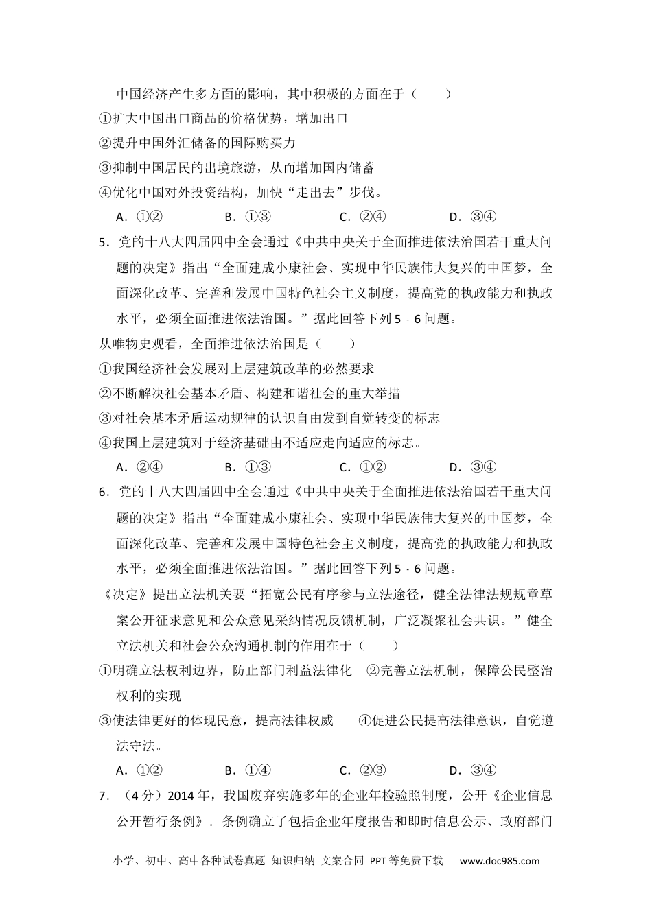 小学、初中、高中各种试卷真题知识归纳文案合同PPT等免费下载www.doc985.com2015年全国统一高考政治试卷(新课标Ⅰ)一、选择题:本题共11小题,每小题4分,共48分.在每小题给出的四个选项中,只有一项是符合题目要求的.1.(4分)某公司准备在甲乙两种复印机中选购一台,甲复印机的购置成本为22000元,乙为18000元;甲的专用耗材每年消耗量不及乙的50%.该公司最终购买了甲复印机。如果不考虑其他因素,这一选择的理由是()A.甲乙是替代品,甲的耗材消耗量低于乙B.甲与其耗材是互补品,甲的耗材成本低于乙的购置成本C.甲与乙的耗材是互补品,甲的购置成本低于乙的耗材成本D.甲乙是替代品,甲多耗费的购置成本低于甲节约的耗材成本2.(4分)2015年11月,国务院召开常务会议,部署加快推进价格改革,缩小政府定价范围,实行公开透明的市场化定价。加快推进价格改革旨在()①破除垄断,促进市场竞争②扩大生产规模,增加产量③降低商品价格,增加商品销售量④以市场化价格为信号,引导社会资本投资。A.①②B.①④C.②④D.③④3.(4分)据统计,到2015年底,我国互联网金融规模突破10万亿元,其用户数量突破8亿。互联网金融行业迅猛发展的同时,接连出现互联网金融企业违规经营、对用户信息保护不力等问题。为防范这些问题的发生,政府应采取的措施是()①完善金融监管政策法规体系②改进互联网安全技术③引导和规范行业自律组织的发展④限制高风险的互联网金融产品。A.①②B.①③C.②④D.③④4.(4分)2015年3月6日,美元指数收盘较前一交易日上涨1.4164点,3月9日,人民币对美元汇率较前一交易日又贬值30个基点。美元持续升值将对小学、初中、高中各种试卷真题知识归纳文案合同PPT等免费下载www.doc985.com中国经济产生多方面的影响,其中积极的方面在于()①扩大中国出口商品的价格优势,增加出口②提升中国外汇储备的国际购买力③抑制中国居民的出境旅游,从而增加国内储蓄④优化中国对外投资结构,加快“走出去”步伐。A.①②B.①③C.②④D.③④5.党的十八大四届四中全会通过《中共中央关于全面推进依法治国若干重大问题的决定》指出“全面建成小康社会、实现中华民族伟大复兴的中国梦,全面深化改革、完善和发展中国特色社会主义制度,提高党的执政能力和执政水平,必须全面推进依法治国。”据此回答下列56﹣问题。从唯物史观看,全面推进依法治国是()①我国经济社会发展对上层建筑改革的必然要求②不断解决社会基本矛盾、构建和谐社会的重大举措③对社会基本矛盾运动规律的认识自由发到自觉转变的标志④我国上层建筑对于经济基础由不适应走向适应的标志。A.②④B.①③C.①②D.③④6.党的十八大四届四中全会通过《中共中央关于全面推进依法治国若干重大问题的决定》指出“全面建成小康社会、实现中华民族伟大复兴的中国梦,全面深化改革、完善和发展中国特色社会主义制度,提高党的执政能力和执政水平,必须全面推进依法治国。”据此回答下列56﹣问题。《决定》提出立法机关要“拓宽公民有序参与立法途径,健全法律法规规章草案公开征求意见和公众意见采纳情况反馈机制,广泛凝聚社会共识。”健全立法机关和社会公众沟通机制的作用在于()①明确立法权利边界,防止部门利益法律化②完善立法机制,保障公民整治权利的实现③使法律更好的体现民意,提高法律权威④促进公民提高法律意识,自觉遵法守法。A.①②B.①④C.②③D.③④7.(4分)2014年,我国废弃实施多年的企业年检验照制度,公开《企业信息公开暂行条例》.条例确立了包括企业年度报告和即时信息公示、政府部门小学、初中、高中各种试卷真题知识归纳文案合同PPT等免费下载www.doc985.com的企业信息公示及信用约束机制在内的企业信息公示制度。实施该条例意在()①强化社会监督,维护市场竞争秩序②转变政府行为方式,降低行政管理费用③促进政府职能转变,提高市场监管效能④规范企业市场行为,提高企业竞争力。A.②③B.①④C.①③D.②④8.(4分)我国在坚持不结盟原则的前提下广交朋友。截至2014年底,我国同67个国家、5个地区和地域组织建立了不同形式、不同程度的伙伴...