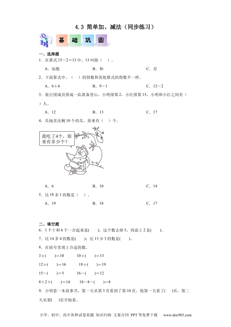 小学、初中、高中各种试卷真题知识归纳文案合同PPT等免费下载www.doc985.com4.3简单加、减法(同步练习)一、选择题1.在算式15-2=13中,13叫做()。A.加数B.和C.差2.下面算式中,()的得数和其他算式的得数不一样。A.6+4B.9-1C.12-23.旅行团成员排成一队准备登山,小明排第2,小红排第15,小明和小红之间有()人。A.12B.13C.174.瓜地里还剩10个西瓜。原来有()个。A.6B.10C.145.比18多1的数是()。A.19B.18C.17二、填空题6.1个十和6个一合起来是(),这个数去掉5,再添上2是()。7.比14多4的数是();比13少3的数是()。8.在括号里填上合适的数。3+()=1010+()=1312+()=1618+()=1915-()=516-()=128+2+()=1418-8-()=89.小明看一本故事书,第一天从第3页看到了第10页。他第一天看了()页,第二天从第()页开始看。小学、初中、高中各种试卷真题知识归纳文案合同PPT等免费下载www.doc985.com10.画○和□加起来共16个。□□□□□□□□□□三、解答题11.看(个)12.买玩具。(1)最多花多少元?=(元)(2)最少花多少元?=(元)13.广场上原来停了15辆车,开走了2辆,现在广场上还停着多少辆车?小学、初中、高中各种试卷真题知识归纳文案合同PPT等免费下载www.doc985.com(辆)14.刘奶奶家养了4只公鸡,6只母鸡,还养了7只小鸭,刘奶奶家一共养了几只小动物?()15.现在还剩多少个?(个)小学、初中、高中各种试卷真题知识归纳文案合同PPT等免费下载www.doc985.com小学、初中、高中各种试卷真题知识归纳文案合同PPT等免费下载www.doc985.com参考答案:1.C【分析】在减法算式中,被减数-减数=差,据此解答。【详解】在算式15-2=13中,13叫做差。故答案为:C2.B【分析】算出每个算式的得数,然后比较即可求解。【详解】A.6+4=10B.9-1=8C.12-2=109-1的得数和其他算式的得数不一样。故答案为:B3.A【分析】要求两人之间的人,用小红排的顺序数减去小明排的顺序数,因为是求两人之间,所以小红不算,再减去1,由此解答。【详解】15-2-1=12(人)小明和小红之间有12人。故答案为:A4.C【分析】把地里还剩西瓜的数量与八戒吃了的数量加起来,求出和,就是原来的西瓜数量。【详解】10+4=14(个)故,瓜地里还剩10个西瓜。原来有14个。故答案为:C5.A【分析】比18多1的数,根据加法的意义,用18+1计算。【详解】18+1=19比18多1的数是19。故答案为:A6.1613小学、初中、高中各种试卷真题知识归纳文案合同PPT等免费下载www.doc985.com【分析】两位数左边的数位是十位,十位是几表示几个十,右边的数位是个位,个位是几表示几个一,这个数去掉几就是减几,添上几就是加几,据此计算得出结论即可。【详解】16-5+2=11+2=13故:1个十和6个一合起来是16,这个数去掉5,再添上2是13。7.1810【分析】求比14多4的数是多少,用加法计算即可;求比13少3的数是多少,用减法计算即可。【详解】14+4=18,13-3=10比14多4的数是18;比13少3的数是10。8.734110442【分析】根据题意,使用加数+加数=和,被减数-减数=差来做此题。【详解】由分析可得:3+7=10;10+3=13;12+4=16;18+1=19;15-10=5;16-4=12;8+2+4=14;18-8-2=8。【点睛】熟练掌握20以内的加减法是解决此题的关键。9.811【分析】用已看完的页码减去开始看的页码,求出差,再加上1,求出和,就是他第一天看的页数。第一天已看完的页码加上1,求出和,就是第二天开始看的页码。【详解】10-3+1=7+1=8(页)10+1=11(页)故,他第一天看了8页,第二天从第11页开始看。10.○○○○○○【分析】题中□有10个,要画○和□加起来共16个,用总数量减去□的数量,即可求出○的数量。小学、初中、高中各种试卷真题知识归纳文案合同PPT等免费下载www.doc985.com【详解】16-10=6(个),画6个○即可。画○和□加起来共16个。□□□□□□□□□□○○○○○○11.11+1+4=1616【分析】先把还剩的数量和手里的数量加起来,求出和,再加上吃掉的数量,求出和,即可解决此题。【详解】11+1+4=12+4=16(个)答:原来有16...
