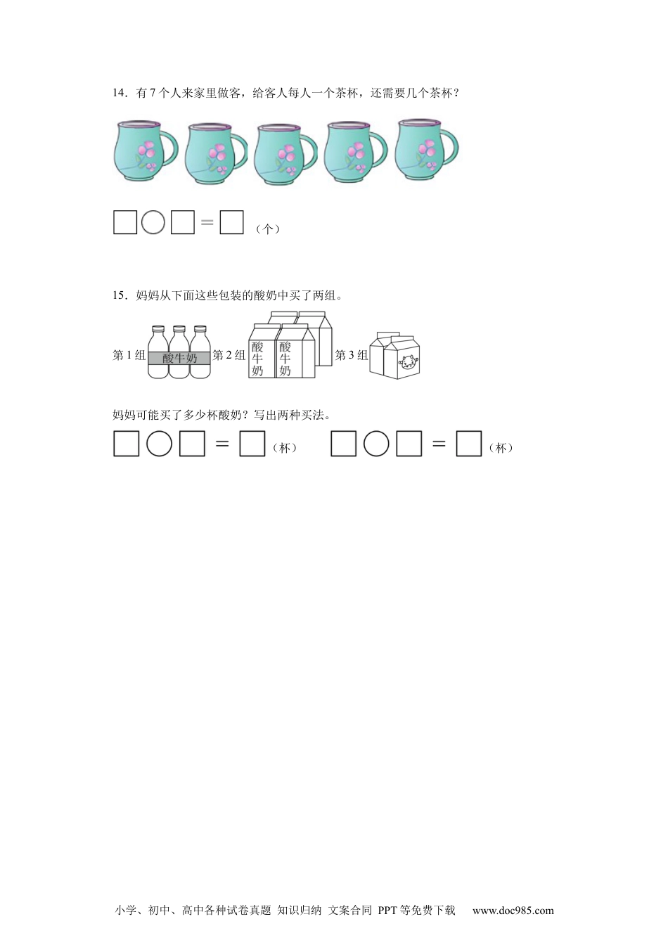 小学、初中、高中各种试卷真题知识归纳文案合同PPT等免费下载www.doc985.com2.46和7的加减、法(同步练习)一、选择题1.草地上原来有4只兔子,后来跑来了2只,现在草地上还有几只兔子?列式计算为()。A.6-4=2B.6-2=4C.4+2=62.从右边数的第3只企鹅离开后,还剩下()只。A.3B.4C.53.下面哪个算式与的结果一样()。A.B.C.4.比4多()的数是7。A.3B.2C.45.数一数里有()个。A.6B.7C.8二、填空题6.数一数,比一比。☆☆☆☆☆☆☆☆比△多()个。◇◇◇◇◇比△少()个。△△△△△△◇再填上()个就和☆一样多。7.青草地上有4只小羊,又来了3只,草地上现在有()只小羊。8.每次少()个。9.6的前面第三个数是()。10.被减数和减数都是6,差是(小学、初中、高中各种试卷真题知识归纳文案合同PPT等免费下载www.doc985.com三、解答题11.一共有()支,右边有()支。左边有几支?(支)12.小小左边有3朵,右边的花和左边同样多。共有多少朵?(朵)13.(1)一共有几只鸟?(只)(2)请你提一个其他数学问题,并解答。小学、初中、高中各种试卷真题知识归纳文案合同PPT等免费下载www.doc985.com14.有7个人来家里做客,给客人每人一个茶杯,还需要几个茶杯?(个)15.妈妈从下面这些包装的酸奶中买了两组。第1组第2组第3组妈妈可能买了多少杯酸奶?写出两种买法。(杯)(杯)小学、初中、高中各种试卷真题知识归纳文案合同PPT等免费下载www.doc985.com小学、初中、高中各种试卷真题知识归纳文案合同PPT等免费下载www.doc985.com参考答案:1.C【分析】根据题意:求现在草地上还有几只兔子?用原来的数量加上后来跑来的数量。【详解】4+2=6(只)所以现在草地上还有6只兔子。故答案为:C【点睛】主要考查了10以内数的加法计算,要熟练掌握。2.C【分析】一共6只企鹅,减去1只后就是剩下的企鹅只数。【详解】6-1=5(只)故答案为:C【点睛】第几只只代表那一只,不能代表多只。3.B【分析】先把原题得数计算出来,再逐项计算出结果,比较后做出选择。【详解】7-2=5A.2+5=7,7>5,不符合题意;B.6-1=5,符合题意;C.1+5=6,6>5,不符合题意。故答案为:B4.A【分析】已知比一个数多几的数是多少,求这个几是多少,用减法列式计算。【详解】7-4=3所以比4多3的数是7。故答案为:A5.B【分析】根据图示,底层有5个小正方体,上层有2个小正方体,加起来,求出和,即可解决。【详解】底层有5个小正方体,上层有2个小正方体。5+2=7(个)小学、初中、高中各种试卷真题知识归纳文案合同PPT等免费下载www.doc985.com里有7个。故答案为:B6.123【分析】☆7个、◇4个、△6个,求一个数比另一个数多多少或少多少都用减法计算。分别用☆的数量减△的数量,用△的数量减◇的数量,用☆的数量减◇的数量即可求解。【详解】7-6=1(个)6-4=2(个)7-4=3(个)☆比△多1个。◇比△少2个。◇再填上3个就和☆一样多。7.7【分析】用草地上原有的4只加上又来了的3只,和就是现在的只数。【详解】4+3=7(只)草地上现在有7只小羊。8.2【分析】根据题意,用每前一组的数量-后一组的数量=少的数量。【详解】7-5=2(个);5-3=2(个);3-1=2(个)每次少2个。9.3【分析】6前面的第三个数,用6-3计算。也可通过数一数的方法解答。【详解】6-3=36的前面第三个数是3。10.0【分析】被减数-减数=差;据此解决。【详解】由题意分析得:6-6=0故,被减数和减数都是6,差是0。11.6;2;4支小学、初中、高中各种试卷真题知识归纳文案合同PPT等免费下载www.doc985.com6-2=4【分析】根据图片可知:一共有6只笔,右边有2只,问左边文具盒中有几只笔?用共有的数量减去右边的数量即可。【详解】6-2=4(支)答:一共有(6)支,右边有(2)支。左边一共有4支。【点睛】主要考查了10以内数的减法计算,要熟练掌握。12.3+3=6;6【分析】右边和左边花朵的数量一样,也是3朵。求一共有几朵,将左右两边的数量相加即可。【详解】3+3=6(朵)答:共有6朵。【点睛】求一共有多少,用加法计算。13.(1)4+3=77只(2)一共有多少只小鸡?5...