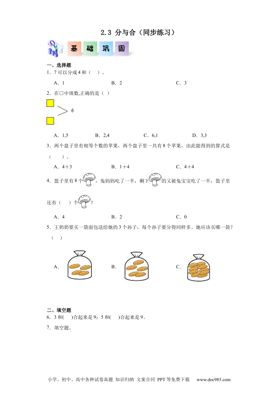 小学、初中、高中各种试卷真题知识归纳文案合同PPT等免费下载www.doc985.com2.3分与合(同步练习)一、选择题1.7可以分成4和()。A.1B.2C.32.在□中填数,正确的是()A.1,5B.2,4C.6,1D.3,33.两个盘子里有相等个数的苹果,两个盘子里一共有8个苹果,由此能得到的算式是()。A.4+3B.1+4C.4+44.篮子里有8个,兔妈妈吃了一半,剩下的又被兔宝宝吃了一半,篮子里还有()个?A.4B.2C.05.王奶奶要买一袋面包送给她的3个孙子,每个孙子要分得同样多。她应该买哪一袋?()A.B.C.二、填空题6.3和()合起来是9;5和()合起来是9。7.填空题。小学、初中、高中各种试卷真题知识归纳文案合同PPT等免费下载www.doc985.com8.把8枝花插在两个花盆,请你写出不同的插法。179.我会分。10.把6个气球分成同样多的两份,每份可以分()个。三、解答题11.哪两张卡片上的点数合起来是9?连一连。小学、初中、高中各种试卷真题知识归纳文案合同PPT等免费下载www.doc985.com12.看数接着画。13.把6只小鸟分别放进下面的两个笼子里,有几种放法?(两个笼子放入鸟的数量均不为0)14.妈妈买来6只,分给姐姐和妹妹两个人,都可以怎样分呢?共有几种分法?小学、初中、高中各种试卷真题知识归纳文案合同PPT等免费下载www.doc985.com15.先涂一涂,再填一填。小学、初中、高中各种试卷真题知识归纳文案合同PPT等免费下载www.doc985.com小学、初中、高中各种试卷真题知识归纳文案合同PPT等免费下载www.doc985.com参考答案:1.C【分析】7可以分成4和3,因为7-4=3【详解】7-4=3故答案为:C【点睛】考查数的分与合,重点是能够知道7是由4和3组成。2.ABD【解析】略3.C【详解】5个选项中,两个加数为同一个数的只有C,通过验证,4+4=8,与题意相符,所以选C。分析:考查十以内的加法计算。4.B【分析】8能分成4和4,兔妈妈吃了一半就是吃了4个,还剩下4个,4又能分成2和2,又被兔宝宝吃了一半就是吃了2个,还剩下2个。【详解】根据分析可知:篮子里有8个,兔妈妈吃了一半,剩下的又被兔宝宝吃了一半,篮子里还有2个。故答案为:B【点睛】熟悉数的组成,明确8的一半是4,4的一半是2是解答此题的关键。5.C【分析】由题意可以得知,有三袋子面包,每袋子面包的数量不一样,要把这些面包分给三个孙子且没有剩余,还要同样多,那么只能把每袋子的面包数量数清楚,按照一一对应的方法分别分给三个孙子,由此来找到正确的答案。【详解】A.由图可以看出这个袋子里面有4个面包,把这4个面包给三个孙子一人一个,还剩余1个面包。B.由图可以看出这个袋子里面有5个面包,如果给这三个孙子一人一个面包,那么还剩余2个面包。C.由图可以看出这个袋子里面有9个面包,如果一人分一个面包还剩余6个面包,然后再小学、初中、高中各种试卷真题知识归纳文案合同PPT等免费下载www.doc985.com把这6个面包一人分一个,还剩余3个面包,再把剩余的3个面包一人一个,刚好分完,且没有剩余,这样最终一人分得三个面包且刚好分完。故答案为:C【点睛】本题主要考查的是分一分,让学生来动手分一分,并且每人分得的数量一样多且没有剩余,只要理解这一点,则可得出正确答案。6.64【分析】1和8合起来是9;2和7合起来是9;3和6合起来是9;4和5合起来是9。据此解决。【详解】由题意分析得:3和6合起来是9;5和6合起来是9。7.1,5,6,4,4【分析】7可以分成6和1;9可以分成4和5;1和5合成6;8可以分成4和4;据此解决。【详解】由题意分析得:(答案不唯一)8.见详解【分析】由题意可知,8可以分为1和7,上面的花盆里插1枝花,下面的花盆里插7枝花;8可以分为2和6,上面的花盆里插2枝花,下面的花盆里插6枝花;8可以分为3和5,上面的花盆里插3枝花,下面的花盆里插5枝花;8可以分为4和4,上面的花盆里插4枝花,下面的花盆里插4枝花,据此解答即可。【详解】123476549.见详解【分析】根据左图可知,4可以分成1+3,2+2,3+1,那么6可以分成1+5,2+4,3+3,4+2,5+1,据此解答。小学、初中、高中各种试卷真题知识归纳文案合同PPT等免费下载www.doc985.com【详解】根据分析可知,解答如下:10.3【分...