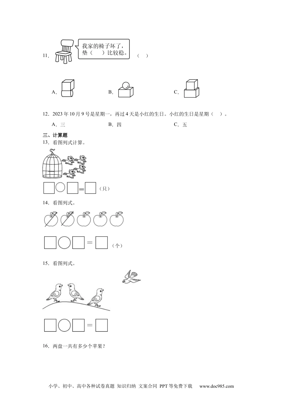 小学、初中、高中各种试卷真题知识归纳文案合同PPT等免费下载www.doc985.com期中测评卷人教版数学一年级上册学校:___________姓名:___________班级:___________考号:___________一、填空题1.看图写数。()()()()2.数一数,填一填。3.在□里填数。4.最多的画“√”,最少的画“○”.△△△△△△()○○○○()□□()5.在括号里填合适的数。()+4=75+()=97-()=0()-3=5()+6=6()+4=106.()买的饮料便宜,每瓶便宜()元.小学、初中、高中各种试卷真题知识归纳文案合同PPT等免费下载www.doc985.com7.在括号里填“>”“<”或“=”。10()93+3()68+1()104+3()3+4+14()78-5()73+5()85+4+1()5+2+08.猜一猜。○+○=4○=()○+□=5□=()□-△=3△=()二、选择题9.下图遮住了()只兔子。A.3B.4C.5D.610.哪一堆正合适?把前面的序号填在括号里.每只小狗一根.()A.B.C.小学、初中、高中各种试卷真题知识归纳文案合同PPT等免费下载www.doc985.com11.()A.B.C.12.2023年10月9号是星期一,再过4天是小红的生日。小红的生日是星期()。A.三B.四C.五三、计算题13.看图列式计算。(只)14.看图列式。(个)15.看图列式。16.两盘一共有多少个苹果?小学、初中、高中各种试卷真题知识归纳文案合同PPT等免费下载www.doc985.com(个)17.看图列式计算。=四、作图题18.根据数字涂颜色。473+49+12+619.看数字画图,不够的补,多余的划去。五、解答题20.请同学们排好队,买门票啦。小学、初中、高中各种试卷真题知识归纳文案合同PPT等免费下载www.doc985.com(1)数一数,总共有()个人。(2)从左数,小丽排第()个,排在第4个的是()。(3)从右数,最高的排第()个。(4)丁丁左边有()人,右边有()人。(5)请把左边三个小朋友圈起来。小学、初中、高中各种试卷真题知识归纳文案合同PPT等免费下载www.doc985.com参考答案:1.714178【分析】一个一个地数,数到几就是几。十位上是几就是几十,个位上是几就是几。几个十就是几十,几个一就是几。【详解】2.4;3;2;1;1【分析】先分别数一数各有几个,再完成填空。求每次减少几个,用前面一个数减去后面一个数,求出差,即可解决。【详解】由题意分析得:4-3=1;3-2=1;2-1=1;每次少1个。【点睛】此题主要考查的是数字排列的规律及减法计算,要熟练掌握。3.【解析】略4.(√)()(○)【详解】略5.347806【解析】略6.玲玲1小学、初中、高中各种试卷真题知识归纳文案合同PPT等免费下载www.doc985.com【解析】略7.>=<<<<=>【分析】由题意可知,根据10以内数的大小比较,可直接判断10>9,4<7;其余的大小比较,可以算出两边算式的答案,然后进行大小比较即可。【详解】10>9;因为3+3=6,所以3+3=6;因为8+1=9,9<10,所以8+1<10;4+3=73+4+1=7+1=8因为7<8,所以4+3<3+4+1;4<7;因为8-5=3,3<7,所以8-5<7;因为3+5=8,所以3+5=8;5+4+1=9+1=105+2+0=7+0=7因为10>7,所以5+4+1>5+2+0。【点睛】熟练掌握10以内数的比大小是解决此题的关键。8.230【分析】两个相同的数相加得4,2和2相加得4,据此得出○是多少。和-加数=另一个加数,据此算出□是多少。被减数-差=减数,据此可以算出△是多少。【详解】○+○=4,2+2=4,所以○=2;○+□=5,即2+□=5,5-2=3,所以□=3;□-△=3,即3-△=3,3-3=0,所以△=0。【点睛】关键是把各种符号看作算式中的一部分,然后根据加减法各部分间的关系求解。9.B小学、初中、高中各种试卷真题知识归纳文案合同PPT等免费下载www.doc985.com【分析】从第一只兔子数到第七只,即可知道遮住了几只兔子。【详解】由题意分析得:第1只、第2只、第3只、第4只、第5只、第6只、第7只,由此可知,遮住的是第3只、第4只、第5只、第6只,也就是图中遮住了4只兔子。故答案为:B10.C【详解】五只小狗,每只小狗一根,一共5根,数出每堆骨头的根数即可得解.11.C【分析】圆柱和球都有曲面,这两种物体都是容易滚动的,因此包含这两个物体的都是不稳定的...