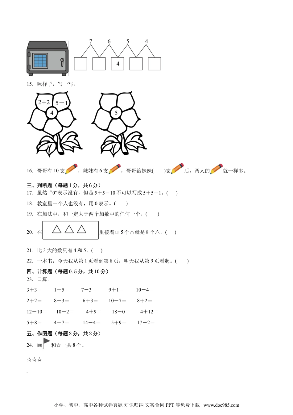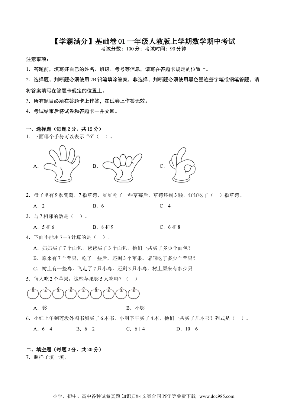 【学霸满分】基础卷01一年级人教版上学期数学期中考试考试分数:100分;考试时间:90分钟注意事项:1.答题前,填写好自己的姓名、班级、考号等信息,请写在答题卡规定的位置上。2.选择题、判断题必须使用2B铅笔填涂答案,非选择、判断题必须使用黑色墨迹签字笔或钢笔答题,请将答案填写在答题卡规定的位置上。3.所有题目必须在答题卡上作答,在试卷上作答无效。4.考试结束后将试卷和答题卡一并交回。一、选择题(每题2分,共12分)1.下面哪个手势可以表示“6”()。A.B.C.2.盘子里有9颗葡萄,7颗草莓,红红吃了一些草莓后,草莓还剩3颗,红红吃了()颗草莓。A.2B.6C.43.与7相邻的数是()。A.5和6B.8和9C.6和84.下面不能用7+3计算的是()。A.妈妈买了7个面包,爸爸买了3个面包,他们一共买了多少个面包?B.原来有7个苹果,吃了一些后,还剩3个苹果。请问吃了多少个苹果?C.树上有一些鸟,飞走了7只小鸟,还剩3只小鸟,树上原来有多少只5.每人吃2个苹果,这些苹果够5人吃吗?()A.够B.不够6.小红上午到莲坂外图书城买了6本书,小明下午买了4本,他们一共买了几本书?列式是()。A.6-4B.6-2C.6+4D.10-6二、填空题(每题2分,共20分)7.照样子填一填。小学、初中、高中各种试卷真题知识归纳文案合同PPT等免费下载www.doc985.com8.5前边一个数是(),后边一个数是(),8和6中间的数是(),比7少2的数是(),()比6小2。9.果盘中的水果吃光了,用“0”表示();米尺上的“0”表示();体温计上的“0”表示()。21教育网10.填数。11.在括号里填上“+”或“-”。8()0=89()9=010()10=021cnjy.com0()2=22()0=22()2=021·cn·jy·com12.看图写数。13.2和()组成9,5和()组成7。14.将下面□种的数字按从左到右的顺序连起来就是保险箱的密码,密码箱的密码是()。小学、初中、高中各种试卷真题知识归纳文案合同PPT等免费下载www.doc985.com15.照样子,写一写。16.哥哥有10支,妹妹有6支,哥哥给妹妹()支后,两人的就一样多。三、判断题(每题1分,共6分)17.虽然“0”表示没有,但是5+5=10不可以写成5+5=1。()18.教室里一个人也没有,用0表示。()19.在加法中,和一定大于两个加数中的任何一个。()20.在里接着画5个△就是8个△。()21.比3大的数只有4和5。()22.一本书,今天我从第1页看到第8页,明天我从第9页看起。()四、计算题(每题0.5分,共10分)23.口算。3+3=1+5=7-3=9+1=10-4=2·1·c·n·j·y2+2=8-3=6+3=10-7=8+2=21·世纪*教育网12-10=10-2=4+9=18-0=4+12=2-1-c-n-j-y5+8=4+7=14-4=5+9=17-2=21*cnjy*com五、作图题(每题2分,共2分)24.画和☆一共8个。☆☆☆小学、初中、高中各种试卷真题知识归纳文案合同PPT等免费下载www.doc985.com六、解答题(每题5分,共50分)25.有9颗大枣,小明吃了3颗,小红吃了4颗,还剩几颗大枣?(颗)26.原来有5人,又来了2人,现在一共有几人?(人)27.公园里共有9只天鹅,其中有4只,有几只?28.沙滩上有只,又来了只,一共有多少只?小学、初中、高中各种试卷真题知识归纳文案合同PPT等免费下载www.doc985.com29.小刚一次可以端两个盘子,他最多可以一次端走多少根胡萝卜?30.植树节。男生种了8棵树。女生种了6棵树。①男生和女生一共种了多少棵树?(棵)②女生再种几棵就和男生同样多了?(棵)31.架子上原来有10个葫芦,先摘下了3个,又摘了2个。架子上还剩多少个葫芦?(个)小学、初中、高中各种试卷真题知识归纳文案合同PPT等免费下载www.doc985.com32.一共有多少个游乐项目?(个)33.一包面巾纸有10张,小红第一天用了3张,第二天用了4张,还剩多少张?34.妈妈从花店里买回10朵花,将这些花放在2个瓶子里,一个瓶子放5朵花,另一个瓶子放几朵?小学、初中、高中各种试卷真题知识归纳文案合同PPT等免费下载www.doc985.com参考答案:1.B【分析】数字手势是中国人使用一只手的手势来象征从一到十的数字的一种方式,六:大拇指和小拇指张开,其余各手指握于掌心,据此回答。【详解】由分析可得:表示6。故答案为:B【点睛】主要...