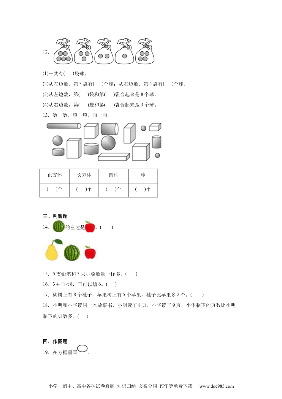 小学、初中、高中各种试卷真题知识归纳文案合同PPT等免费下载www.doc985.com期中综合素质测评卷(1-4单元)一年级上册人教版数学学校:___________姓名:___________班级:___________考号:___________一、选择题1.哪组最多?()A.B.C.2.比8多2的数是()。A.6B.8C.103.草地上原来有4只兔子,后来跑来了2只,现在草地上还有几只兔子?列式计算为()。A.6-4=2B.6-2=4C.4+2=64.妈妈买了3千克苹果,2千克梨,又买了4千克的桃子,妈妈一共买了()千克水果。A.5B.7C.95.下面第()个图形可以立起来,还可以滚动。A.B.C.二、填空题6.看图写数。小学、初中、高中各种试卷真题知识归纳文案合同PPT等免费下载www.doc985.com7.按顺序填数.8.9.比一比,填一填。比多(),比少()。10.在括号里填“>”“<”或“=”。7()55+1()6+05+4()8-24+4()3+39()68-3()98-1()2+56-3()6+311.想一想,填一填。-3=4,+=9,=(),=()。小学、初中、高中各种试卷真题知识归纳文案合同PPT等免费下载www.doc985.com12.(1)一共有()袋球。(2)从左边数,第3袋有()个球;从右边数,第4袋有()个球。(3)从左边数,第()袋和第()袋合起来是8个球。(4)从右边数,第()袋和第()袋合起来是3个球。13.数一数,填一填、画一画。正方体长方体圆柱球()个()个()个()个三、判断题14.的左边是。()15.5支铅笔和5只小兔数量一样多。()16.3+□<8,可以填☐6。()17.桃树上有8个桃子,苹果树上有5个苹果,桃子比苹果多2个。()18.小明和小华读同一本故事书,小明读了8页,小华读了9页,小华剩下的页数比小明剩下的页数多。()四、作图题19.在方框里画。小学、初中、高中各种试卷真题知识归纳文案合同PPT等免费下载www.doc985.com20.画一画。(1)在的左边画。(2)在的右边画。(3)在的上面画。(4)在的下面画√。五、计算题21.算一算。8+2=9-6=8-5=10-7=3+2=6-1=0+7=7-5=7-2-2=3+4+2=6-2+3=6-4+5=0+9-3=4+3-2=8-3-3=8+2-5=六、看图列式计算22.(个)小学、初中、高中各种试卷真题知识归纳文案合同PPT等免费下载www.doc985.com23.(个)24.25.26.七、解答题27.数一数,填一填。小学、初中、高中各种试卷真题知识归纳文案合同PPT等免费下载www.doc985.com(1)一共有()个水果,一共有()个。(2)圈出左边9个水果。(3)从右边数,是第()个。28.8只小青蛙,跳走了3只,还剩几只?答:还剩()只。29.小明种了三盆花;第一盆2朵;第二盆4朵;第三盆5朵;他要送给小红两盆。最多送给小红多少朵花?(朵)30.小红拿了10元钱,买了一个笔记本4元,又买了一支铅笔2元,还剩下多少钱?(元)31.一本绘本有10页,淘气第一天看了3页,第二天看了2页,他第三天应该从第几页看起?(页)32.校车原来有9人,现在车上有多少人?小学、初中、高中各种试卷真题知识归纳文案合同PPT等免费下载www.doc985.com小学、初中、高中各种试卷真题知识归纳文案合同PPT等免费下载www.doc985.com参考答案:1.A【分析】先数出每项中表示的数,然后进行比较即可。【详解】A项中表示的数是9,B项中表示的数是5,C项中表示的数是7,5<7<9,所以最多的是A项。故答案为:A2.C【分析】求比8多2的数,用8加2可得解。【详解】8+2=10,比8多2的数是10。故答案为:C【重点】掌握10的加法计算是解题的关键。3.C【分析】根据题意:求现在草地上还有几只兔子?用原来的数量加上后来跑来的数量。【详解】4+2=6(只)所以现在草地上还有6只兔子。故答案为:C【重点】主要考查了10以内数的加法计算,要熟练掌握。4.C【分析】根据题意,把三种水果的重量加起来就是总重量【详解】(千克)所以妈妈一共买了9千克水果。故答案为:C5.C【分析】根据立体图形的特征,把各个选项进行分析,据此选择。【详解】A.是球,可以滚动,但难以立住;小学、初中、高中各种试卷真题知识归纳文案合同PPT等免费下载www.doc985.comB.是长方体,不可以滚动,但可以立住;C.是圆柱,既可以滚动,又可以立起来。故答案为:C【重点】本题考查了立体图形,掌握常见的立...