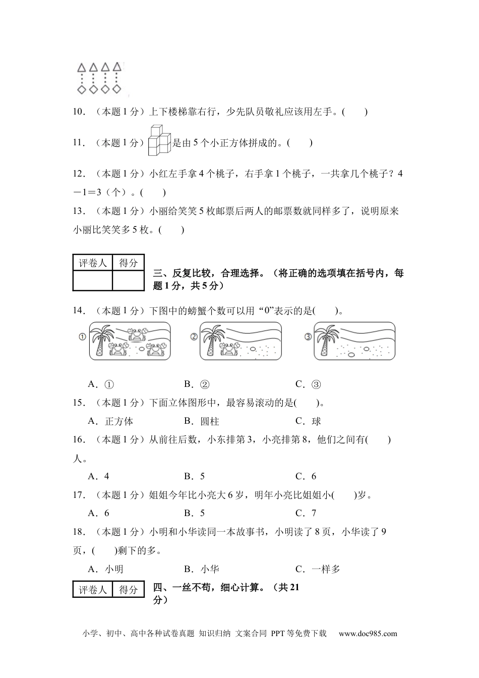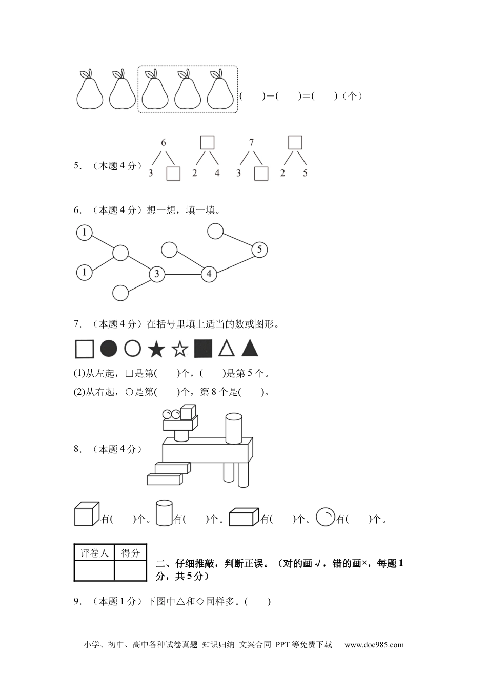 小学、初中、高中各种试卷真题知识归纳文案合同PPT等免费下载www.doc985.com保密★启用前2024-2025学年一年级数学上册期中素养测评卷【学易金卷·基础卷02】考试难度:;考试分数:100分;考试时间:90分钟题号一二三四五六总分得分注意事项:1.答题前,填写好自己的姓名、班级、考号等信息,请写在答题卡规定的位置。2.判断题、选择题必须使用2B铅笔填涂答案,非判断、选择题必须使用黑色墨迹签字笔或钢笔答题,请将答案正确填写在答题卡规定的位置上。3.所有题目必须在答题卡上作答,在试卷上作答无效。4.考试结束后将试卷和答题卡一并交回。5.测试范围:第1~3单元。评卷人得分一、用心思考,正确填写。(每空1分,共29分)1.(本题4分)数一数,写一写。2.(本题4分)算一算。3+()=76-()=5()-2=84+2<()3.(本题2分)7比()少2,9比()多8。4.(本题3分)列算式。小学、初中、高中各种试卷真题知识归纳文案合同PPT等免费下载www.doc985.com()-()=()(个)5.(本题4分)6.(本题4分)想一想,填一填。7.(本题4分)在括号里填上适当的数或图形。(1)从左起,□是第()个,()是第5个。(2)从右起,○是第()个,第8个是()。8.(本题4分)有()个。有()个。有()个。有()个。评卷人得分二、仔细推敲,判断正误。(对的画√,错的画×,每题1分,共5分)9.(本题1分)下图中△和◇同样多。()小学、初中、高中各种试卷真题知识归纳文案合同PPT等免费下载www.doc985.com10.(本题1分)上下楼梯靠右行,少先队员敬礼应该用左手。()11.(本题1分)是由5个小正方体拼成的。()12.(本题1分)小红左手拿4个桃子,右手拿1个桃子,一共拿几个桃子?4-1=3(个)。()13.(本题1分)小丽给笑笑5枚邮票后两人的邮票数就同样多了,说明原来小丽比笑笑多5枚。()评卷人得分三、反复比较,合理选择。(将正确的选项填在括号内,每题1分,共5分)14.(本题1分)下图中的螃蟹个数可以用“0”表示的是()。A.①B.②C.③15.(本题1分)下面立体图形中,最容易滚动的是()。A.正方体B.圆柱C.球16.(本题1分)从前往后数,小东排第3,小亮排第8,他们之间有()人。A.4B.5C.617.(本题1分)姐姐今年比小亮大6岁,明年小亮比姐姐小()岁。A.6B.5C.718.(本题1分)小明和小华读同一本故事书,小明读了8页,小华读了9页,()剩下的多。A.小明B.小华C.一样多评卷人得分四、一丝不苟,细心计算。(共21分)小学、初中、高中各种试卷真题知识归纳文案合同PPT等免费下载www.doc985.com19.(本题12分)看清题目,认真计算。20.(本题3分)看图列式计算。(只)21.(本题3分)看图列式计算。(只)22.(本题3分)看图列式计算。评卷人得分五、手脑并用,实践操作。(共8分)23.(本题4分)看数涂一涂。小学、初中、高中各种试卷真题知识归纳文案合同PPT等免费下载www.doc985.com24.(本题4分)根据要求画一画。(1)在的上面。(2)的下面是。(3)在的左边。(4)的右边是。评卷人得分六、走进生活,解决问题。(共32分)25.(本题6分)房子里有3只兔子,房子外有2只兔子,一共有几只兔子?(只)小学、初中、高中各种试卷真题知识归纳文案合同PPT等免费下载www.doc985.com26.(本题6分)哥哥和妹妹早餐一共吃了4个鸡腿,妹妹吃了2个,哥哥吃了多少个?(个)27.(本题6分)一共有()只,飞走了()只,还剩几只?(只)28.(本题6分)学校科技小组共有7人,女生有3人,男生有几人?()答:29.(本题8分)看图解答。(1)苹果和梨一共有多少个?(个)(2)一共有几朵花?(朵)(3)小鸡有只,母鸡有只,一共有几只鸡?小学、初中、高中各种试卷真题知识归纳文案合同PPT等免费下载www.doc985.com(只)
