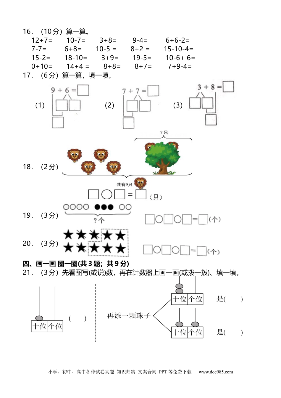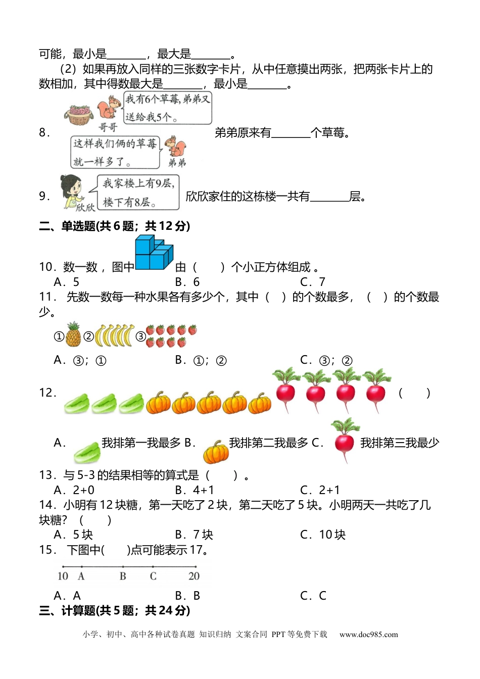 小学、初中、高中各种试卷真题知识归纳文案合同PPT等免费下载www.doc985.com第一学期一年级数学上册期末质量检测时间:60分钟满分:100分学校:__________姓名__________班级:__________考号:__________一、填空题(每空1分;共22分)1.照样子,填一填。2.看图写数。3.(1)一共有筒自动铅笔。(2)第一筒有3支自动铅笔,有4支自动铅笔的是第筒,第筒和第筒合起来有9支铅笔。4.妈妈带着兄妹俩去公园玩,儿童票每张5元,成人票每张8元,买门票一共要付元。5.一共有只小羊。6.1个十和7个一组成的数是,读作:,它再添上是20.7.盒子里放着三张数字卡片,上面分别写着7、8、9。(1)从盒中任意摸出两张,把摸出的两张卡片上的数相加,得数有种题号一二三四五六总分得分小学、初中、高中各种试卷真题知识归纳文案合同PPT等免费下载www.doc985.com可能,最小是,最大是。(2)如果再放入同样的三张数字卡片,从中任意摸出两张,把两张卡片上的数相加,其中得数最大是,最小是。8.弟弟原来有个草莓。9.欣欣家住的这栋楼一共有层。二、单选题(共6题;共12分)10.数一数,图中由()个小正方体组成。A.5B.6C.711.先数一数每一种水果各有多少个,其中()的个数最多,()的个数最少。①②③A.③;①B.①;②C.③;②12.()A.我排第一我最多B.我排第二我最多C.我排第三我最少13.与5-3的结果相等的算式是()。A.2+0B.4+1C.2+114.小明有12块糖,第一天吃了2块,第二天吃了5块。小明两天一共吃了几块糖?()A.5块B.7块C.10块15.下图中()点可能表示17。A.AB.BC.C三、计算题(共5题;共24分)小学、初中、高中各种试卷真题知识归纳文案合同PPT等免费下载www.doc985.com16.(10分)算一算。12+7=10-7=3+8=9-4=6+6-2=7-7=6+8=10-5=8+2=15-10-4=15-2=18-10=3+9=19-5=10-6+6=0+10=14+4=8+8=8+7=7+9-4=17.(6分)算一算,填一填。(1)(2)(3)18.(2分)19.(3分)20.(3分)四、画一画圈一圈(共3题;共9分)21.(3分)先看图写(或说)数,再在计数器上画一画(或拨一拨)、填一填。小学、初中、高中各种试卷真题知识归纳文案合同PPT等免费下载www.doc985.com22.(2分)(1)火车从A站开往B站,②号车厢在①号车厢的(前后)面。(2)火车从B站开往A站,④号车厢在③号车厢的(前后)面。23.(4分)(1)从左边数,第颗珠子是,第颗珠子是。(2)在从右边数第6颗珠子下面画▲,再圈出最左边的6颗珠子。五、(5分)比一比填一填(共2题;共11分)24.比一比,填一填。有个,有个。比少个;比多个;再添个就和同样多。25.(6分)按要求分一分,再回答问题。(1)给上面的物品分类。(填序号)小学、初中、高中各种试卷真题知识归纳文案合同PPT等免费下载www.doc985.com(2)长方体和正方体一共有个。(3)长方体和球一共有个六、解决问题(共5题;共22分)26.(3分)一张全家福照片中有3个大人排成一行,每两个大人之间有一个小孩,照片中一共有几人?27.(4分)小亮和同学们站成一排,他左边有4个人,右边有2个人,这一排共有多少人?28.(3分)两人一共有多少本故事书?29.(8分)(1)买一支和一瓶一共需要多少元?(元)(2)明明有10元钱,买了一本和一支,还剩多少元?答:两人一共有□本故事书。小学、初中、高中各种试卷真题知识归纳文案合同PPT等免费下载www.doc985.com(元)(3)用算式“2+3=5(元)”解决的问题是:30.(4分)图书馆原来有6本故事书,被借走了2本,又还回来4本,现在图书馆有多少本故事书?(本)小学、初中、高中各种试卷真题知识归纳文案合同PPT等免费下载www.doc985.com参考答案1.解:2.14;17;153.(1)6(2)5;1;64.185.196.17;十七;37.(1)3;15;17(2)18;148.169.1810.B11.A12.B13.A14.B15.C16.12+7=1910-7=33+8=119-4=56+6-2=107-7=06+8=1410-5=58+2=1015-10-4=115-2=1318-10=83+9=1219-5=1410-6+6=100+10=1014+4=188+8=168+7=157+9-4=1217.(1)(2)(3)18.9-4=5(只)19.4+3+2=9(个)20.10-3-5=2(个)21.小学、初中、高中各种试卷真题知识归纳文案合同PPT等免费下载www.doc985.com22.(1)...