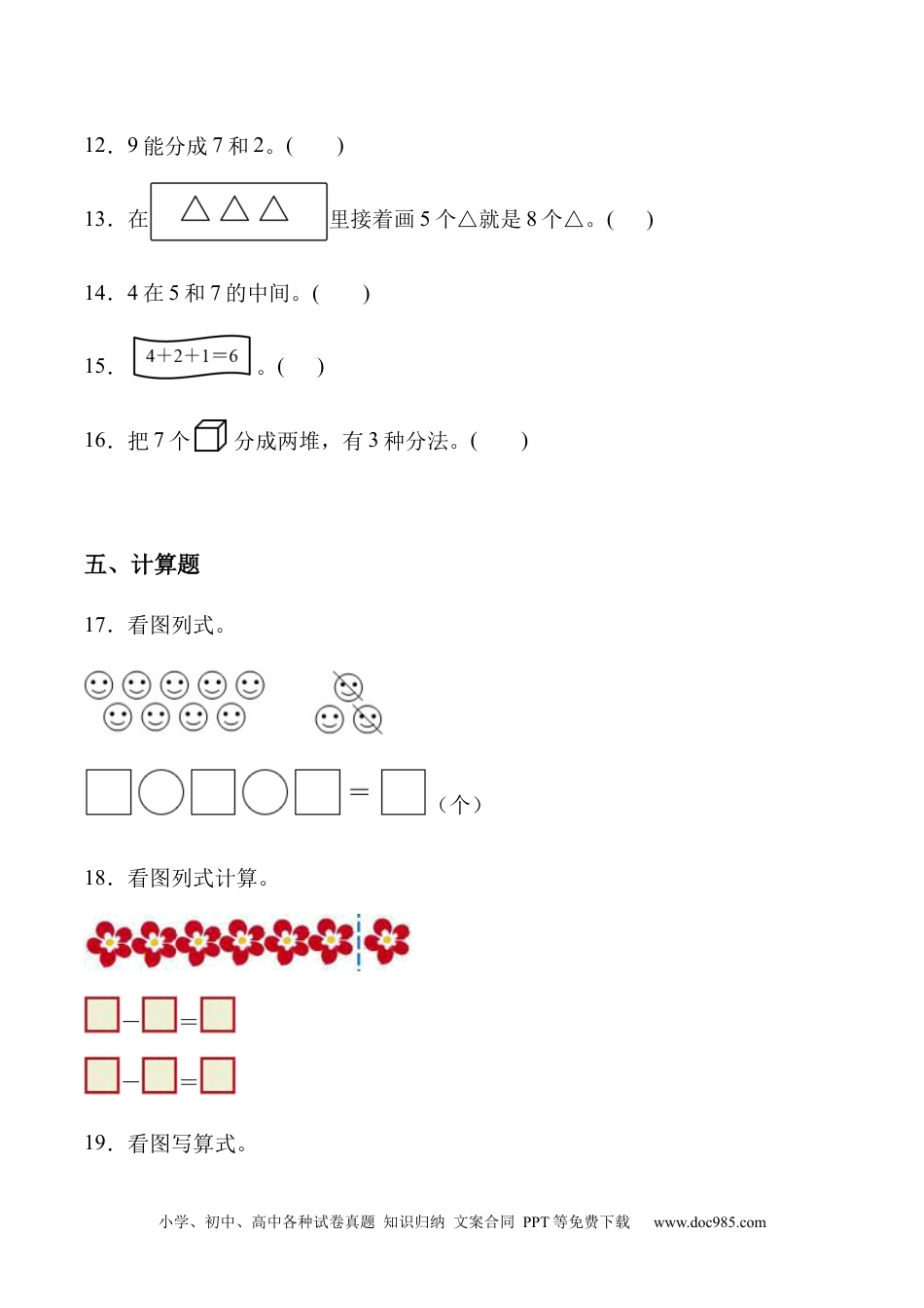 小学、初中、高中各种试卷真题知识归纳文案合同PPT等免费下载www.doc985.com二6~10的认识和加、减法—上册同步单元小练习一、选择题1.接着画,再画()个就是8个。A.4B.5C.62.观察如图,空格里应填写算式()。A.B.C.3.芳芳给了小军4枚邮票后,两人邮票的枚数同样多,原来芳芳比小军多()枚邮票。A.2B.4C.84.小明做了6只纸飞机,送给同学4只,还剩几只?正确的是()。A.6-4=2(只)B.6-2=4(只)C.6+4=10(只)5.盘子里有7颗草莓,红红吃了一些草莓后,草莓还剩3颗,红红吃了()颗草莓。小学、初中、高中各种试卷真题知识归纳文案合同PPT等免费下载www.doc985.comA.2B.6C.4二、填空题6.在横线上填上“”“”或“”。810957.刘老师折了10朵小红花,她送给小红3朵,送给小凯4朵,还剩()朵。8.树上先飞来5只鸟,后来又飞走3只鸟,还剩下7只,树上原来()只鸟。9.青草地上有4只小羊,又来了3只,草地上现在有()只小羊。10.在4和6中间的数是();比6少1的数是()。三、排序题11.比较大小。3+54+29-06-14+3<<<<四、判断题小学、初中、高中各种试卷真题知识归纳文案合同PPT等免费下载www.doc985.com12.9能分成7和2。()13.在里接着画5个△就是8个△。()14.4在5和7的中间。()15.。()16.把7个分成两堆,有3种分法。()五、计算题17.看图列式。(个)18.看图列式计算。-=-=19.看图写算式。小学、初中、高中各种试卷真题知识归纳文案合同PPT等免费下载www.doc985.com(只)(只)20.在下面的数中,选出3个数,写出2道加法算式,两道减法算式。21.看图列式。六、连线题22.连一连。小学、初中、高中各种试卷真题知识归纳文案合同PPT等免费下载www.doc985.com七、解答题23.车上原来有9人,到百货大楼站后,下车4人,上车5人,现在车上有多少人?24.小红有9个玩具,小英有7个玩具,小明的玩具比小红少8个。小明有几个玩具?(个)25.藤上一共有8个葫芦和12串葡萄,李老师摘了5个葫芦,藤上还有几个葫芦?26.操场上原有10个小朋友,走了3个小朋友,还有几个小朋友?答案1.B2.C3.C小学、初中、高中各种试卷真题知识归纳文案合同PPT等免费下载www.doc985.com4.A5.C6.=>=>><7.38.59.710.5511.6-14+24+33+59-012.√13.√14.×15.×16.√17.3-2+9=1018.7;1;619.3+4=77-3=4小学、初中、高中各种试卷真题知识归纳文案合同PPT等免费下载www.doc985.com20.3+7=10;7+3=1010-3=7;10-7=322.整数加减法混合运算,从左往右计算。先计算出每个算式的结果,再连线。由题意分析得:7-0+2=93+6-7=28-4+4=810-0-4=69-5-4=023.10人9-4+5=10(人)答:现在车上有10人。小学、初中、高中各种试卷真题知识归纳文案合同PPT等免费下载www.doc985.com24.9-8=1;1个9-8=1(个)答:小明有1个玩具。25.3个8-5=3(个)答:藤上还有3个葫芦。26.7个10-3=7(个)答:还有7个小朋友。