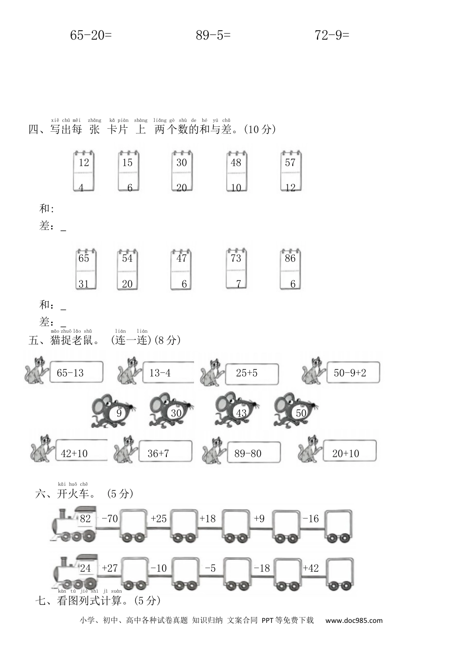小学、初中、高中各种试卷真题知识归纳文案合同PPT等免费下载www.doc985.com期末口算笔算专项达标卷(专项练习)一年级数学下册人教版(时间:60分钟,满分:100分)一、zhú竹zǐ子jié节jié节ɡāo高。(5分)2051183222566403063305437822757829二、wǒ我huì会suàn算。(15分)1.直接写出得数。(3分)12-4=24-8=45-23=46-20-7=40+33=15-7=69-60=27-9+6=56+13=8+25=45-3=57+3+20=2.列竖式计算。(12分)35+37=29+56=83-25=32-27=47+44=70-36=三、xiǎng想yi一xiǎng想,tián填yi一tián填。(6分)28+20=49+6=58+8=题号一二三四五六七八九十十一十二总分得分小学、初中、高中各种试卷真题知识归纳文案合同PPT等免费下载www.doc985.com65-20=89-5=72-9=四、xiě写chū出měi每zhāng张kǎ卡piàn片shàng上liǎng两gè个shù数de的hé和yú与chā差。(10分)121530485746201012和:差:65544773863120676和:差:五、māo猫zhuō捉lǎo老shǔ鼠。(lián连一lián连)(8分)65-1313-425+550-9+2930435042+1036+789-8020+10六、kāi开huǒ火chē车。(5分)82-70+25+18+9-1624+27-10-5-18+42七、kàn看tú图jiè列shì式jì计suàn算。(5分)小学、初中、高中各种试卷真题知识归纳文案合同PPT等免费下载www.doc985.com□○□=□()□○□=□()3.□○□=□()□○□=□()5.□○□○□=□()八、jī击gū鼓chuán传huā花。(12分)80+5=12-3=64-4=15+37=98-90=4+29=21-6=14-7=64-13=34+5+5=67-4-8=40+9-2=九、wū乌yā鸦hē喝shuǐ水。(10分)55-3194-3046+334+1089-2315-746+3424-865+772-6十、zài在◯lǐ里tián填shàng上hé合shì适de的shù数。(9分)小学、初中、高中各种试卷真题知识归纳文案合同PPT等免费下载www.doc985.com14-=56+=5240+<46◯◯◯5+=1237-=1785->80◯◯◯44-=926+=45+60<68◯◯◯十一、()lǐ里yīng应gāi该tián填jǐ几?(9分)44+35=()928+6=()435-16=()945+25=()039-9=()014+58=()290-35=()536+28=()460-28=()2十二、□lǐ里yīng应gāi该tián填jǐ几?(6分)小学、初中、高中各种试卷真题知识归纳文案合同PPT等免费下载www.doc985.com参考答案一、2554705782350335673二、1.8162219738924693342802.72855059134三、四、16821950105838694596347434534180669280五、六、12375564485141361860七、1.18-9=9(本)2.25+20=45(颗)3.57+16=73(棵)4.40--12=28(台)5.42+30+10=82(元)八、859605271533851445547九、小学、初中、高中各种试卷真题知识归纳文案合同PPT等免费下载www.doc985.com十、9465720435196(横线上方的答案不唯一)十一、731737563十二、
