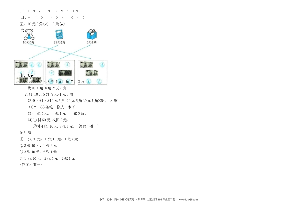 小学、初中、高中各种试卷真题知识归纳文案合同PPT等免费下载www.doc985.com人版一年下教级数学册密卷专项过关检测4—认识人民币一、填一填。1.人民币最大的面值是(),最小的面值是()。2.1张可以换()张,也可以换()张。3.1张可以换()张和()张。4.5.60角=()元9元=()角84分=()角()分26角=()元()角10角=()元=()分5角5分=()分6.萌萌带的钱全是1元的纸币,能买一本笔记本,但不能再买一支钢笔。萌萌最多带了()张1元的纸币,最少带了()张。7.5元钱正好可以买下面的()和()两种物品。(填序号)二、判一判。(对的画“”✔,错的画“×”)1.一张20元的纸币可以换5张4元的纸币。()2.2张5元和10张1角钱数相等。()3.佳佳用5元钱买一根2元4角的香肠,应找回3元6角。()4.1块橡皮5角,1元钱可以买3块这样的橡皮。()5.1枚5角硬币和5枚1角硬币合起来是1元。()三、算一算。7角+6角=()元()角15元-8元=()元8角+3元=()元()角2元6角-3角=()元()角1元-7角=()角2元4角+6角=()元四、在里填上“◯>”“<”或“=”。80角◯8元7元9角◯8元90分◯9分27元◯27角8元4角◯4元8角99元9角◯100元78分◯87分4角◯3元9角72角◯10元五、给出的钱能买什么?(在能买到的物品下面画“”✔)六、买下面的物品可以怎样付钱?(连一连)七、买一条围巾要5元7角,请你在最简单的付钱方法后面画“”。✔1.5张1元,7张1角。()2.2张2元,1张1元,1张5角,2张1角。()3.1张5元,1张5角,2张1角。()小学、初中、高中各种试卷真题知识归纳文案合同PPT等免费下载www.doc985.com八、解决问题。1.看图完成表格。买的物品应付的钱数付出的钱数应找回的钱数2.买文具。(1)一个文具盒比一盒彩笔贵多少钱?(2)如果上面的文具各买一件,奇奇带20元钱够不够?3.购物。(1)1元钱可以买()把尺子。(2)1元钱还能买()。(3)买1本怎样付钱最简单?(4)买1个可以怎样付钱?写出两种。附加题。一副乒乓球拍32元,王老师买一副这样的球拍,可以怎样付钱?专项过关检测密卷—认识人民币一、1.100元1分2.243.22(或16)4.7元6角26元7角5.69084261100556.1367.①④二、1.×2.×3.×4.×5.✔小学、初中、高中各种试卷真题知识归纳文案合同PPT等免费下载www.doc985.com三、137382333四、=<>>><<<<五、10元8角()3✔元()✔六、七、3.✔八、1.应付:5元8角1元4角7元2角找回:2角6角2元8角2.(1)10元5角-9元=1元5角(2)9元+1元+10元5角=20元5角20元5角>20元不够3.(1)2(2)铅笔、橡皮、本子(3)一张5元,一张1元,一张5角。(4)①付50元,找回2元。②付4张10元,8张1元。(答案不唯一)附加题①1张20元、1张10元、1张2元②3张10元、1张2元③3张10元、2张1元④1张20元、2张5元、2张1元(答案不唯一)