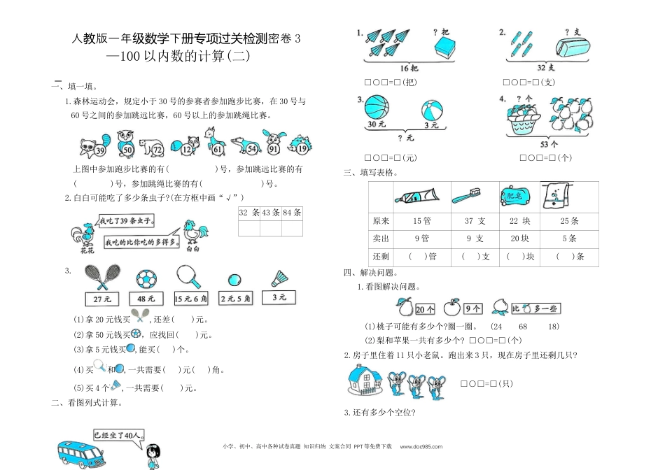 小学、初中、高中各种试卷真题知识归纳文案合同PPT等免费下载www.doc985.com人版一年下教级数学册密卷专项过关检测3—100以内数的计算(二)一、填一填。1.森林运动会,规定小于30号的参赛者参加跑步比赛,在30号与60号之间的参加跳远比赛,60号以上的参加跳绳比赛。上图中参加跑步比赛的有()号,参加跳远比赛的有()号,参加跳绳比赛的有()号。2.白白可能吃了多少条虫子?(在方框中画“√”)32条43条84条3.(1)拿20元钱买,还差()元。(2)拿50元钱买,应找回()元。(3)拿5元钱买,能买()个。(4)买和,一共需要()元()角。(5)买4个,一共需要()元。二、看图列式计算。□○□=□(把)□○□=□(支)□○□=□(元)□○□=□(个)三、填写表格。原来15管37支22块25条卖出9管9支20块5条还剩()管()支()块()条四、解决问题。1.看图解决问题。(1)桃子可能有多少个?圈一圈。(246818)(2)梨和苹果一共有多少个?□○□=□(个)2.房子里住着11只小老鼠。跑出来3只,现在房子里还剩几只?□○□=□(只)3.还有多少个空位?小学、初中、高中各种试卷真题知识归纳文案合同PPT等免费下载www.doc985.com□○□=□()4.看图解决问题。(1)这本书一共有多少页?(2)天天比红红少看多少页?5.有23个苹果,每人分5个,最多可以分给几人?还剩几个?6.送出了多少张“福”字?7.看表解决问题。表演唱歌的有35人表演跳舞的有20人表演话剧的有8人(1)表演唱歌的比表演话剧的多几人?(2)表演跳舞的和表演话剧的一共有几人?(3)你还能提出其他数学问题并解答吗?8.小白兔在菜地里拔了49个萝卜,如果它给小黑兔8个,两只小兔的萝卜就同样多了。小黑兔原来有多少个萝卜?附加题。把10、20、30、40、50这五个数分别填在下面的里,使两条直线上◯的和相等。专项过关检测密卷—100以内数的计算(二)一、1.12、1939、50、5472、61、912.84条✔3.(1)7(2)2(3)2(4)181(5)12二、1.16-5=112.32-4=283.30+3=334.53-8=45小学、初中、高中各种试卷真题知识归纳文案合同PPT等免费下载www.doc985.com三、628220四、1.(1)㉔(2)20+9=292.11-3=83.45-40=5(个)4.(1)45+8=53(页)(2)45-20=25(页)5.23-5-5-5-5=3(个)最多可以分给4人,还剩3个。6.56-9=47(张)7.(1)35-8=27(人)(2)20+8=28(人)(3)表演唱歌的和表演跳舞的一共有多少人?35+20=55(人)(答案不唯一)8.49-8=41(个)41-8=33(个)附加题(答案不唯一)