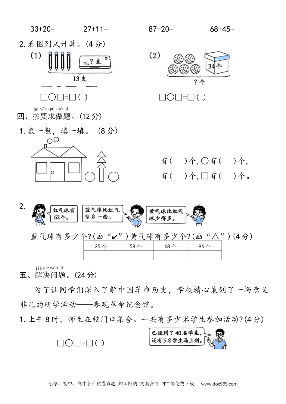 小学、初中、高中各种试卷真题知识归纳文案合同PPT等免费下载www.doc985.com1-4单元过关验收卷一、认真填空。(第7题每图3分,其余每空1分,共38分)1.我国有34个省级行政区。34读作(),它是由()个十和()个一组成的。2.(1)85,(),(),75,70,()。(2)11,22,(),55,(),()。3.在77这个数中,左边的“7”表示(),右边的“7”表示()。4.用任意两个完全相同的三角形可以拼成一个(),用两个完全相同的正方形可以拼成一个()。5.在里填上“◯>”“<”或“=”。255251-84017-817-7◯◯◯100994819+303◯◯个十◯9个一6.用★表示10,用△表示1,下面比40大的数有()个。Δ7.根据百数表中的规律填一填。8.在()里填上合适的数。4+()=34()-23=4117-()=49-4032-()>26()+7<5029+()=29--()9.有一个两位数,比50多一些,比60少一些,它十位上的数与个位上的数合起来是8,这个两位数是()。小学、初中、高中各种试卷真题知识归纳文案合同PPT等免费下载www.doc985.com10.用4025组两位数,组成的最大两位数是(),最小两位数是(),这两个数的和是(),差是()。二、shèn慎zhòng重xuǎn选zé择。(jiāng将zhèng正què确dá答àn案de的xù序hào号tián填zài在kuò括hào号lǐ里)(14分)1.58和64之间有()个数。①4②5③62.下面第()幅图中的“2”和29中的“2”表示的意思不同。3.把一张正方形纸对折两次,折出来不可能是()。4.计算12—4,()表示的是下图的思考过程。①4+8=12②12-2=10③10-4=612-8=410-2=86+2=85.一个两位数,个位上的数字和十位上的数字合起来是8,这个数最小是()。①80②53③176.8个杯子装一盒,装了6盒。同样多的杯子,如果每12个装一盒,那么可以装()盒。①8②6③47.〔思维提升〕如果45+□的和是五十几,那么□里可以填()。①比5大的数字②5③比5小的数字三、zǐ仔xì细jì计suàn算。(12分)1.直接写出得数。(8分)82-2=60-30=5+30=14-6+9=小学、初中、高中各种试卷真题知识归纳文案合同PPT等免费下载www.doc985.com33+20=27+11=87-20=68-45=2.看图列式计算。(4分)□○□=□()□○□=□()四、àn按yāo要qiú求zuò做tí题。(12分)1.数一数,填一填。(8分)有()个,○有()个,有()个,□有()个。2.蓝气球有多少个?(画“”✔)黄气球有多少个?(画“△”)(4分)25个58个68个96个五、jiě解jué决wèn问tí题。(24分)为了让同学们深入了解中国革命历史,学校精心策划了一场意义非凡的研学活动——参观革命纪念馆。1.上午8时,师生在校门口集合。一共有多少名学生参加活动?(4分)□○□=□()小学、初中、高中各种试卷真题知识归纳文案合同PPT等免费下载www.doc985.com2.(1)有8名学生没有吃早饭,老师给每人发了一个面包,还剩多少个面包?(4分)□○□=□()(2)上车后,老师准备给每名学生发一张研学注意事项。已经发了多少张?(4分)□○□=□()3.同学们到饭店吃午饭,每张餐桌坐8人,可以坐满多少张餐桌?(圈一圈,算一算,填一填)(8分)方法一:圈一圈。方法二:算一算。可以坐满()张餐桌。4.活动结束时,同学们在纪念馆门口拍照留念。剩下一组有多少名学生?(4分)□○□=□()xuǎn选zuò做tí题。(10分)想一想,填一填。□-○=20□+△=75△+6=26小学、初中、高中各种试卷真题知识归纳文案合同PPT等免费下载www.doc985.com□=()○=()△=()一、1.三十四342.(1)806560(2)3344663.7个十7个一4.平行四边形长方形5.<><><>6.28.3064824000(横线上方的答案不唯一)9.53【点拨】由题意可知,这个两位数的十位上是5,再根据“它十位上的数与个位上的数合起来是8”和5+3=8可知,个位上是3,所以这个两位数是53。10.54207434二、1.②2.②3.③4.③5.③6.③7.①三、1.80303517533867232.(1)13-4=9(支)(2)5+34=39(个)四、1.6524五、1.40+5=45(名)2.(1)16-8=8(个)(2)45-6=39(张)3.方法一:小学、初中、高中各种试卷真题知识归纳文案合同PPT等免费下载www.doc985.com(圈法不唯一)方法二:45-8=37-8=29-8=21-8=13-8=554.45-22=23(名)选做题553520