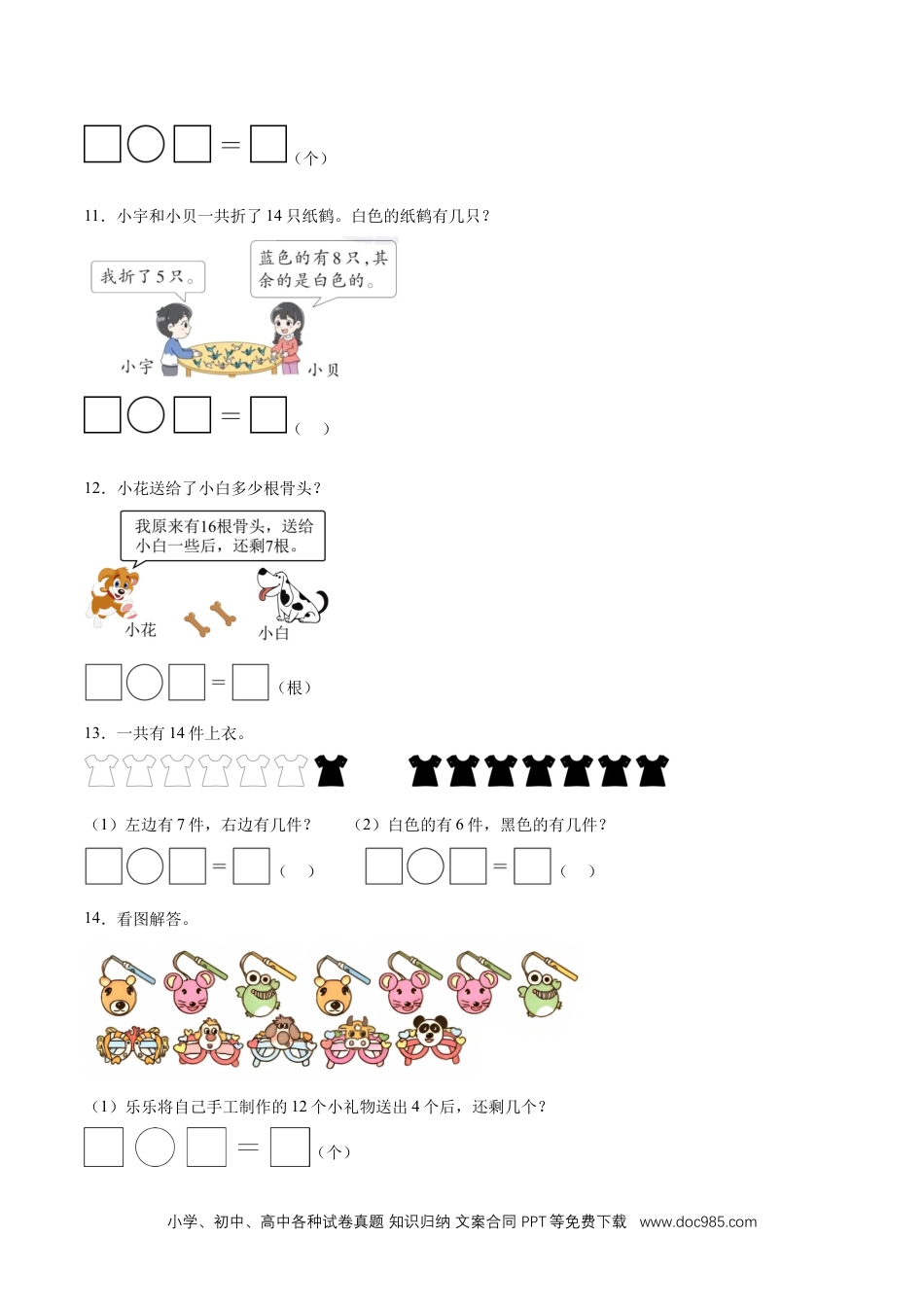小学、初中、高中各种试卷真题知识归纳文案合同PPT等免费下载www.doc985.com第二单元第5课时整理和复习分层作业1.在下面的括号里填上“>”“<”或“=”。12()3+89+4()8+714-6()6+110-6+3()6+32.直接写出得数。13-9=19-9=18-9=17-9=12-9=10-9=11-9=15-9=3.看图列式计算。(支)4.算一算。5.照样子画出跷跷板。6.还要栽几棵树?小学、初中、高中各种试卷真题知识归纳文案合同PPT等免费下载www.doc985.com=(棵)7.填空。原有16支13把()辆18件卖出9支()把7辆()件还剩()支6把7辆9件8.先填一填,再根据加法算式写出两道减法算式。6+9=()()+5=128+()=149.妈妈安排我给14盆花浇水和写17个字,我已经浇了8盆花,还有多少盆花没浇?(盆)10.家里一共有15个橘子,吃掉一些后,还剩9个,吃掉了几个橘子呢?小学、初中、高中各种试卷真题知识归纳文案合同PPT等免费下载www.doc985.com(个)11.小宇和小贝一共折了14只纸鹤。白色的纸鹤有几只?()12.小花送给了小白多少根骨头?(根)13.一共有14件上衣。(1)左边有7件,右边有几件?(2)白色的有6件,黑色的有几件?()()14.看图解答。(1)乐乐将自己手工制作的12个小礼物送出4个后,还剩几个?(个)小学、初中、高中各种试卷真题知识归纳文案合同PPT等免费下载www.doc985.com(2)一共有12个小礼物,其中小眼镜有()个,小灯笼有几个?(个)15.我会动脑想一想。+8=+,+3=+,+=+5,+=9+,=(),=(),=(),=(),+-=(),-+=()。小学、初中、高中各种试卷真题知识归纳文案合同PPT等免费下载www.doc985.com小学、初中、高中各种试卷真题知识归纳文案合同PPT等免费下载www.doc985.com小学、初中、高中各种试卷真题知识归纳文案合同PPT等免费下载www.doc985.com1.><><【分析】先计算出各算式的答案,然后再进行比较大小。比较时,位数多的数就大;位数相同比较最高位,最高位大的数就大;最高位相同比较下一位,直到比较出结果为止。【详解】3+8=11,11<12,则12>3+8;9+4=13,8+7=15,13<15,则9+4<8+7;14-6=8,6+1=7,8>7,则14-6>6+1;10-6+3=7,6+3=9,7<9,则10-6+3<6+3。2.4;10;9;83;1;2;6【解析】略3.【分析】用笔的总数量减去右边的数量,求出差,就是左边的数量。【详解】由题意分析得:14-8=6(支)4.11;6;17;158;11;14;17【详解】略5.见详解【分析】先计算出两个算式的结果,再比较大小,根据跷跷板的特征,小的数在上,大的数在下,相等时是平的,据此画图即可。【详解】11-2=9,12-4=8,9>8;13-5=8,11-3=8,8=8。6.;4棵小学、初中、高中各种试卷真题知识归纳文案合同PPT等免费下载www.doc985.com【分析】一共要栽的数量减去已经栽的数量,等于还要栽的数量,据此解答。【详解】13-9=4(棵)答:还要栽4棵树。7.见详解【分析】根据题意,原有的数量-卖出的数量=还剩的数量;原有的数量-还剩的数量=卖出的数量;卖出的数量+还剩的数量=原有的数量。【详解】:16-9=7(支);:13-6=7(把);:7+7=14(辆);:18-9=9(件);填写如下:原有16支13把14辆18件卖出9支7把7辆9件还剩7支6把7辆9件8.见详解【分析】加数+加数=和,和-加数=另一个加数,据此计算并写出减法算式。【详解】6+9=15,所以15-6=9,15-9=6;12-5=7,所以7+5=12,12-7=5;小学、初中、高中各种试卷真题知识归纳文案合同PPT等免费下载www.doc985.com14-8=6,所以8+6=14,14-6=8。6+9=157+5=128+6=1415-6=912-5=714-8=615-9=612-7=514-6=89.14-8=6;6盆【分析】根据减法的意义,要浇花的总数量-已经浇了的数量=还没有浇的数量。【详解】14-8=6(盆)答:还有6盆花没浇。10.15-9=6;6个【分析】根据减法的意义,橘子的总数量-还剩的数量=吃掉的数量。【详解】15-9=6(个)答:吃掉了6个橘子。11.14-8=6(只);6只【分析】根据减法的意义,纸鹤的总数量-蓝色纸鹤的数量=白色纸鹤的数量。【详解】14-8=6(只)答...