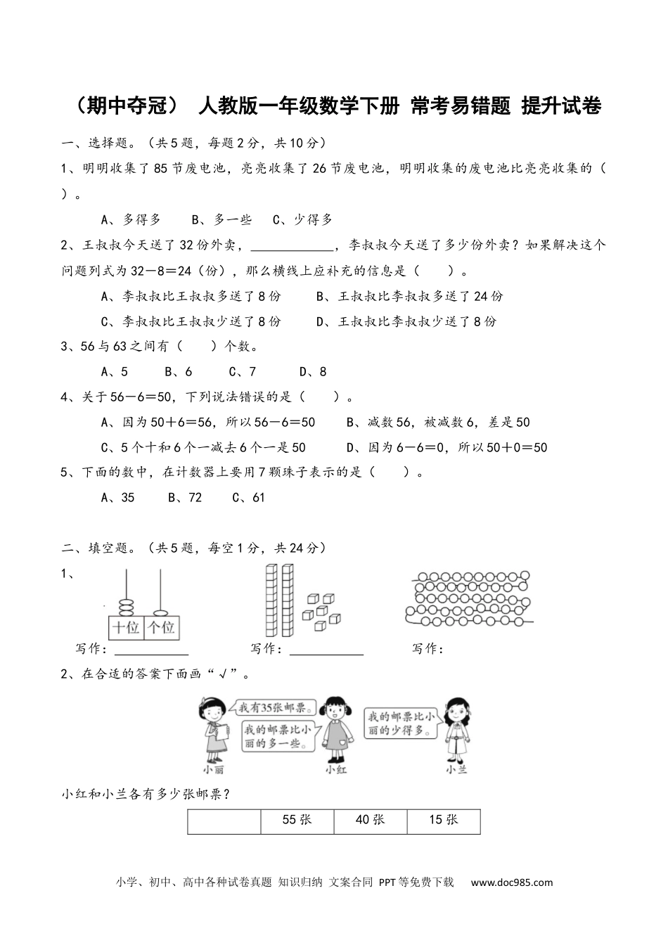 小学、初中、高中各种试卷真题知识归纳文案合同PPT等免费下载www.doc985.com(期中夺冠)人教版一年级数学下册常考易错题提升试卷一、选择题。(共5题,每题2分,共10分)1、明明收集了85节废电池,亮亮收集了26节废电池,明明收集的废电池比亮亮收集的()。A、多得多B、多一些C、少得多2、王叔叔今天送了32份外卖,,李叔叔今天送了多少份外卖?如果解决这个问题列式为32-8=24(份),那么横线上应补充的信息是()。A、李叔叔比王叔叔多送了8份B、王叔叔比李叔叔多送了24份C、李叔叔比王叔叔少送了8份D、王叔叔比李叔叔少送了8份3、56与63之间有()个数。A、5B、6C、7D、84、关于56-6=50,下列说法错误的是()。A、因为50+6=56,所以56-6=50B、减数56,被减数6,差是50C、5个十和6个一减去6个一是50D、因为6-6=0,所以50+0=505、下面的数中,在计数器上要用7颗珠子表示的是()。A、35B、72C、61二、填空题。(共5题,每空1分,共24分)1、写作:写作:写作:2、在合适的答案下面画“√”。小红和小兰各有多少张邮票?55张40张15张小学、初中、高中各种试卷真题知识归纳文案合同PPT等免费下载www.doc985.com小红小兰3、按规律填一填。(1)58,60,(),64,()。(2)29,32,(),(),41,()。4、在括号里填上“>”“<”或“=”。35()3455()6599()8944()3360+6()2956()50+486-80()755-5()505、想一想,填一填。15-6=□11-7=□三、计算。(共2题,共18分)1、口算。(每题1分,共10分)25+53=17+70=18-9=40+50=12-5+32=20+5-12=14-7+60=69+8-7=57-8+20=77-70+47=2、看图列式计算。(共4题,每题2分,共8分)(1)(2)□○□=□□○□=□(3)(4)□10□□10□小学、初中、高中各种试卷真题知识归纳文案合同PPT等免费下载www.doc985.com□○□=□□○□=□四、数一数,填一填。(每空2分,共8分)()个()个()个()个五、上面的图形是用下面的哪个物体画出来的?用线连起来。(每题1分,共5分)六、解决问题。(共6题,共35分)1、(5分)小强擦了多少块玻璃?□○□=□(块)口答:小强擦了()块玻璃。小学、初中、高中各种试卷真题知识归纳文案合同PPT等免费下载www.doc985.com2、(5分)视力检查,二(3)班一共有多少人?□○□=□(人)口答:二(3)班一共有()人。3、(6分)为了迎接植树节的到来,学校组织了“种下希望,与绿同行”植树活动。(1)(5分)一(1)班领了②和③两堆,一共领了多少棵树苗?□○□=□(棵)口答:一共领了()棵树苗。(2)(1分)一(2)班领了47棵树苗,领的是______和______两堆。(填序号)4、(7分)某小学三年级有40名学生和6名老师去参观科技馆。他们准备的这辆车够坐吗?□○□=□(人)□○45够坐□不够坐□(画“√”)5、(6分)植物园里新种植了7棵柏树,13棵杨树,8棵松树。种植柳树的棵数比杨树多得小学、初中、高中各种试卷真题知识归纳文案合同PPT等免费下载www.doc985.com多。(1)(1分)柳树可能有多少棵?(在正确的答案下面画“√”)15棵52棵6棵(2)(5分)再种植几棵松树,松树的棵数就和杨树一样多了?6、(6分)一共有17只小动物来聚会。还有几只小动物没来?想:解答“还有几只小动物没来”这个问题时,“()”这一条件是多余的。列算式:□○□=□(只)口答:还有()只小动物没来。小学、初中、高中各种试卷真题知识归纳文案合同PPT等免费下载www.doc985.com答案解析一、选择题。(共5题,每题2分,共10分)1、明明收集了85节废电池,亮亮收集了26节废电池,明明收集的废电池比亮亮收集的()。A、多得多B、多一些C、少得多【答案】A【解析】明明收集了85节废电池,亮亮收集了26节废电池,85与26相比,差值较大,说明明明收集的废电池数量比亮亮多很多,所以明明收集的废电池比亮亮收集的多得多。故选A。2、王叔叔今天送了32份外卖,,李叔叔今天送了多少份外卖?如果解决这个问题列式为32-8=24(份),那么横线上应补充的信息是()。A、李叔叔比王叔叔多送了8份B、王叔叔比李叔叔多送了24份C、李叔叔比王叔叔少送了8份D、王叔叔比...